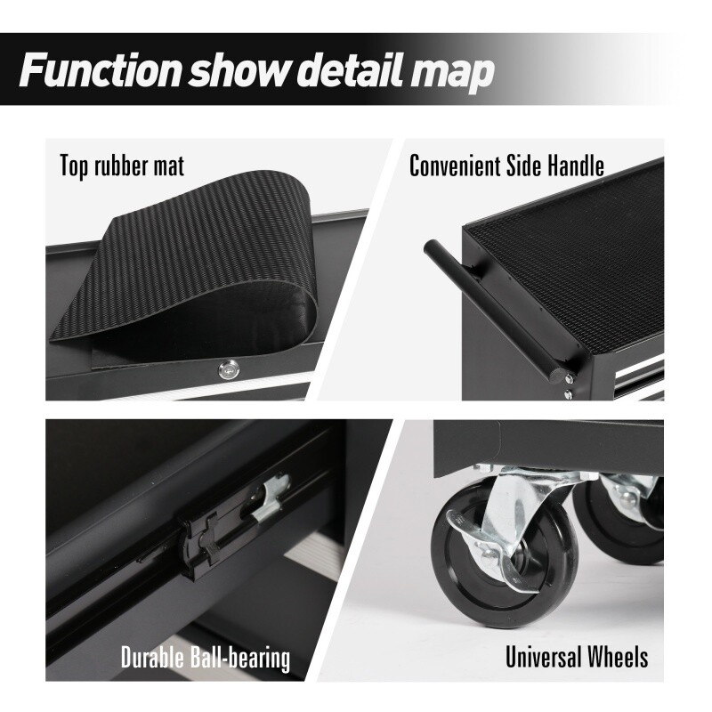 Product Features Large Storage Space: The tool cart is equipped with 5+2 drawers of different sizes, and a large storage space on the bottom. The top storage rack provides additional space for arranging the workshop accessories you need Easy to Move: Our rolling tool box has 4 steering wheels, 2 of which with parking brakes, so you can move the trolley freely in the garage, but also stop in one place. The tool cabinet with 360° flexible and sturdy universal wheels, rolling tool chest cart are padded and smooth ball-bearing drawer slides to reduce slip during movement, protecting tools and reducing noise Practical Rolling Tool Cart: Tool cart is Made of steel, the structure is strong and stable, durability. polished and powder-coated to ensure wear and rust resistance and will not chip paint Storage Drawers: Tool chest with wheels can hold many commonly used tools. The top drawer with interlock. Only one drawer can be opened at a time, the other three drawers will automatically lock to protect your tools from theft and prevent tipping Easy Installation : The toolbox is very easy to install, with detailed instructions and videos to help you with the installation. This rolling toolbox is great for home workshops and some professional environments and could be placed in the garage, workshop, warehouse, etc. Description