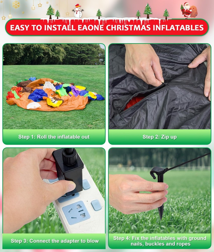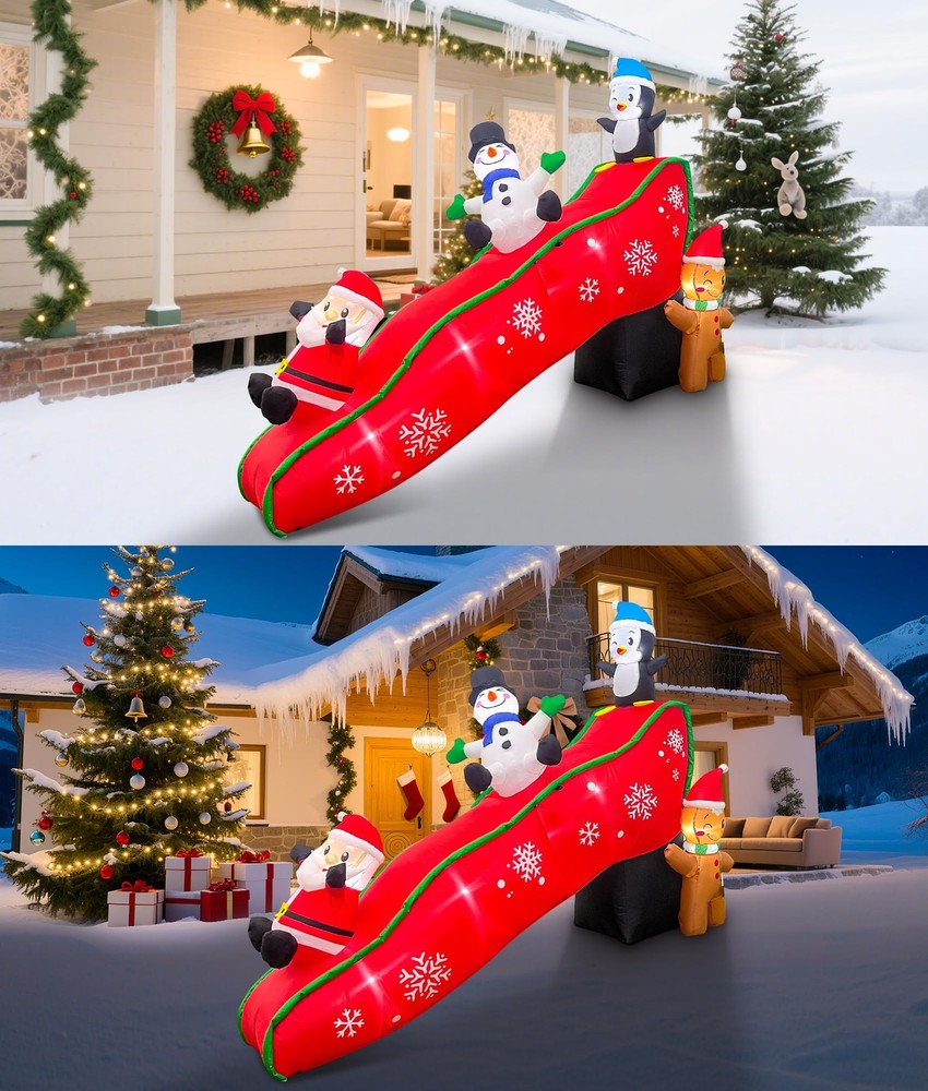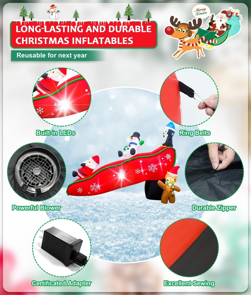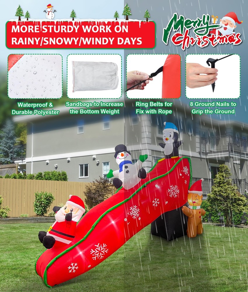 【🎄 Light Up the Christmas Holiday Joy: 7FT Giant Inflatable Christmas Wonderland is Here! 🎅】 ✨ 【Product Highlights】 ✨ ✅ Eye-Catching Giant Design: With a stunning 7FT height, it shines even brighter at night! Whether day or night, it becomes the most dazzling holiday focal point in the neighborhood. ✅ Dynamic Scene Storytelling: Santa Claus sets aside his gift bag, the snowman tosses snowflakes, the penguin flaps its wings, and the gingerbread man smiles brightly—the dynamic sliding scene breaks the static monotony of traditional decorations, telling a Christmas story full of childlike fun. ✅ Easy Inflation + Weather-Resistant Durability: Made of high-strength eco-friendly polyester material, it inflates quickly to reveal its shape. Equipped with built-in sandbags, windproof ropes, and ground stakes, it stands strong against wind and snow, delighting all season long! ✅ Energy-Efficient LED Lighting: Built-in soft warm white lights, low energy consumption yet high brightness. Lighting it up every night becomes the warmest winter scenery. 🎁 【Perfect For】 🎁 🎄Home yards, mall entrances, park displays, corporate celebrations… anywhere that needs Christmas spirit is its stage to shine! 🎄This winter, join the slide party with the Christmas all-star team! Let laughter and joy bloom with the lights, creating dreamy Christmas memories that are uniquely yours. Specifications Material: polyester Inflating Length: approx. 7 FT(There might be size errors because of manual measurement) LED Light: 8 Pieces Package Information: 1 x Christmas inflatables 8 x Ground nail 4 x 2m Rope Several Sandbags Adapter Fan User manual Christmas Fun Slide Party: Adorable Santa Claus, cute snowman, playful penguin, and sweet gingerbread man gather together, sliding down joyfully from the slide, instantly transforming your yard into a magical Christmas paradise straight out of a fairy tale, bringing to life a Christmas story full of childlike fun Affordable & Reusable: Made of premium waterproof polyester fabric with upgraded and excellent sewing craftsmanship, this Christmas funny slide party features long-lasting, fade resistant, weather resistant and air leakage, available for reuse to decorate Christmas in next year More Sturdy from Wind: To improve the stability of the Christmas inflatables when working outdoors, there are several sandbags for filling with sands to increase its bottom weight. Combined with belt loops, rope, and ground nails, the overall design of the inflatable Santa Claus makes it more sturdy, ensuring normal use, even in windy,snowy, and rainy weather Easy Setup & Fast Inflation: Christmas inflatables is equipped with a strong blower, easy to operate. Unfold and zip up the Santa inflatable in an open area, plug in the adapter, you will got a unique and attractive Christmas decoration in a few minutes Built-in LED Light: To enhancing the viewing experience and decorative effect, the Christmas blow ups is designed with 6pcs LED lights inside to light up its body, making it better viewing at night and creating strong festival atmosphere for Christmas. It's a great Xmas ornament for both indoor and outdoor party decorations in this New Year Worry-Free Warranty: We stand behind our products. Enjoy 24/7 customer support and a straightforward 30-day return policy. If you have any questions, our team is here to help ensure a smooth and satisfying experience