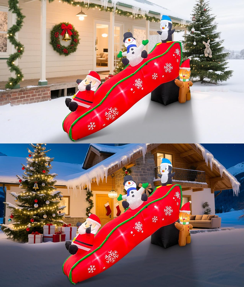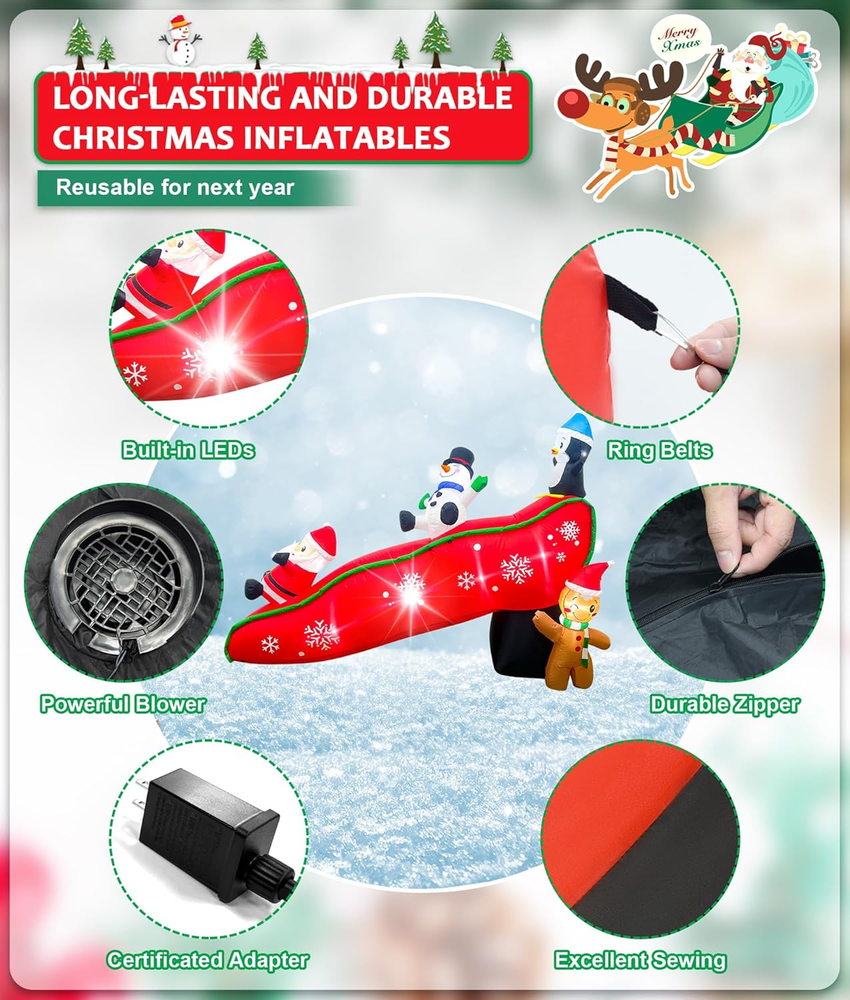 Christmas Fun Slide Party: Adorable Santa Claus, cute snowman, playful penguin, and sweet gingerbread man gather together, sliding down joyfully from the slide, instantly transforming your yard into a magical Christmas paradise straight out of a fairy tale, bringing to life a Christmas story full of childlike fun Affordable & Reusable: Made of premium waterproof polyester fabric with upgraded and excellent sewing craftsmanship, this Christmas funny slide party features long-lasting, fade resistant, weather resistant and air leakage, available for reuse to decorate Christmas in next year More Sturdy from Wind: To improve the stability of the Christmas inflatables when working outdoors, there are several sandbags for filling with sands to increase its bottom weight. Combined with belt loops, rope, and ground nails, the overall design of the inflatable Santa Claus makes it more sturdy, ensuring normal use, even in windy,snowy, and rainy weather Easy Setup & Fast Inflation: EAONE Christmas inflatables is equipped with a strong blower, easy to operate. Unfold and zip up the Santa inflatable in an open area, plug in the adapter, you will got a unique and attractive Christmas decoration in a few minutes Built-in LED Light: To enhancing the viewing experience and decorative effect, the Christmas blow ups is designed with 6pcs LED lights inside to light up its body, making it better viewing at night and creating strong festival atmosphere for Christmas. It's a great Xmas ornament for both indoor and outdoor party decorations in this New Year Worry-Free Warranty: We stand behind our products. Enjoy 24/7 customer support and a straightforward 30-day return policy. If you have any questions, our team is here to help ensure a smooth and satisfying experience Product description The video showcases the product in use. The video guides you through product setup. The video compares multiple products. The video shows the product being unpacked. EAONE Christmas Inflatables Funny Slide Party Merchant Video