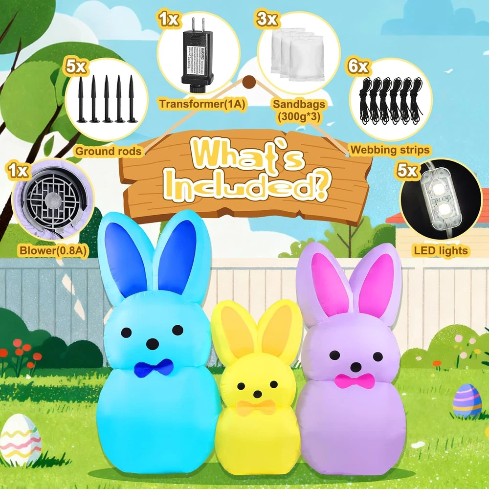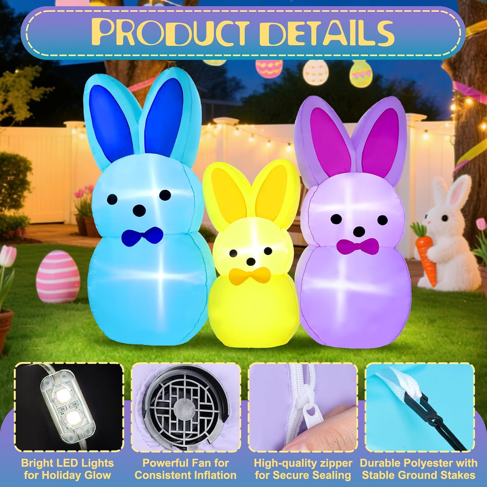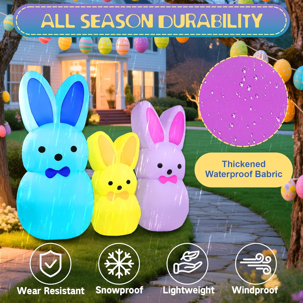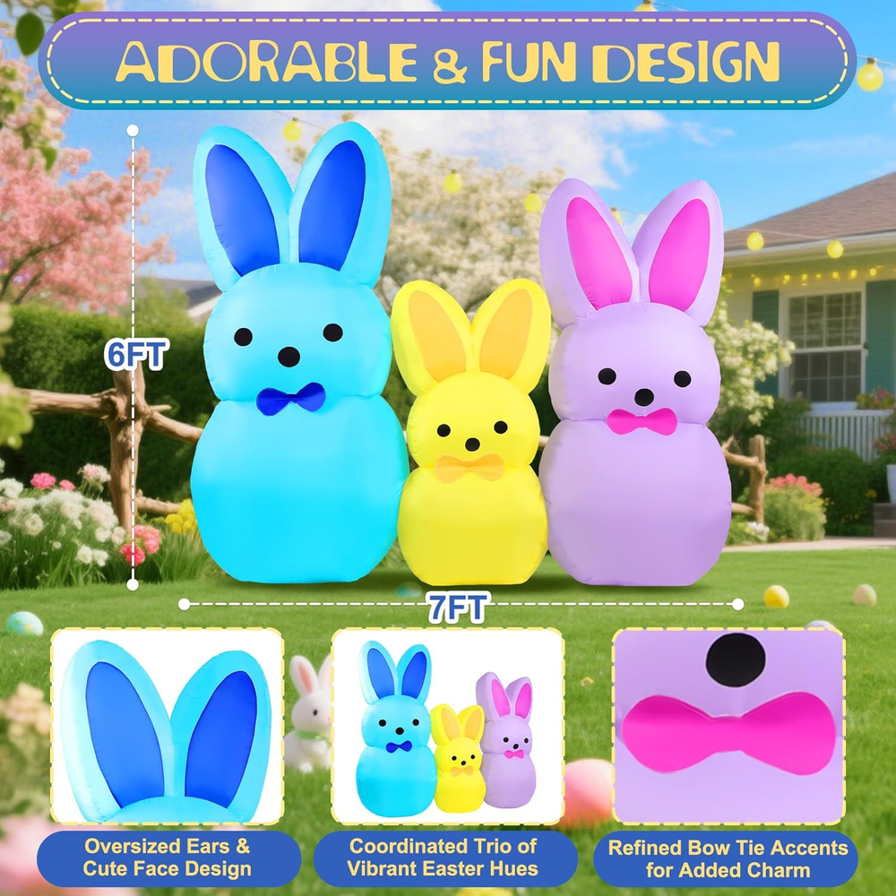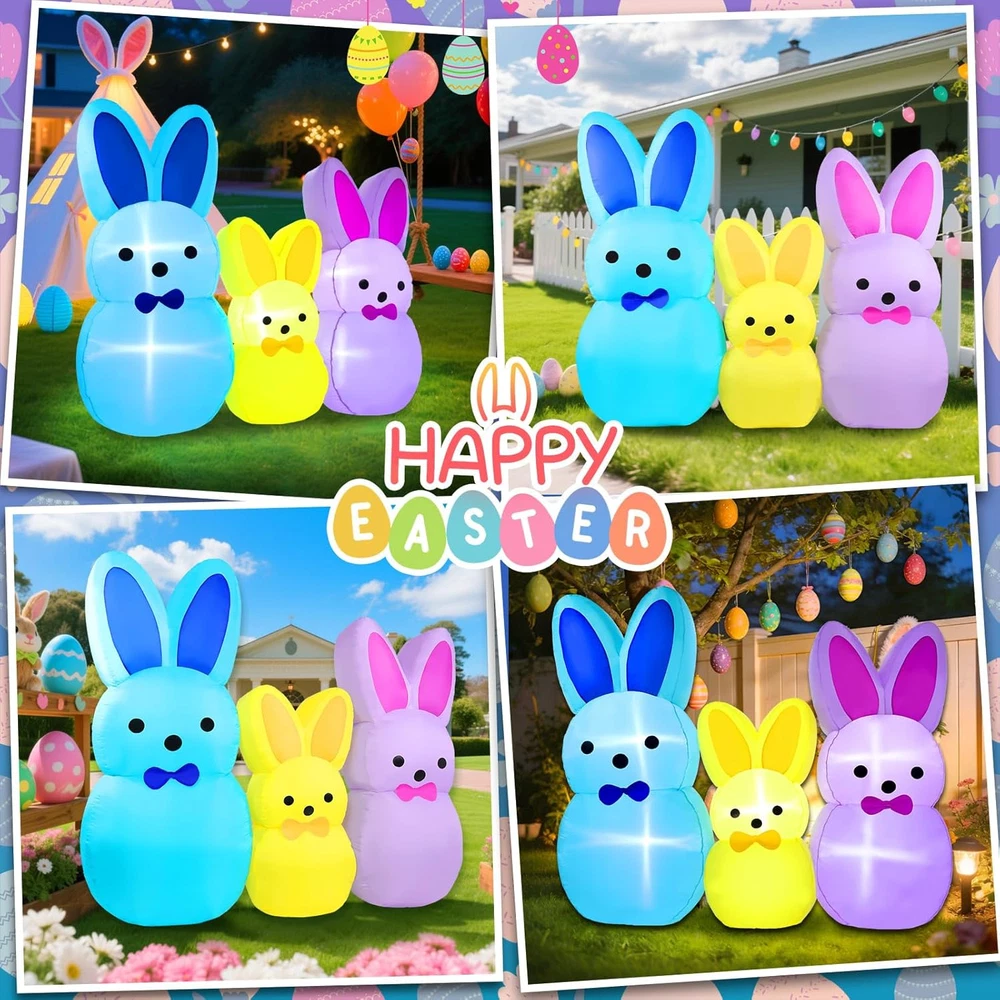 Store New Arrivals Add to Favorite View Feedback Contact Fast deliveries to the customer's home Quality customer service John Make the customers happy! 7FT Easter Bunny Inflatables Outdoor Yard Decoration LED Lighted Blow up Colorful Triple Rabbit for Lawn Garden, Indoor Outdoor Inflatable Decor for Easter Party & Egg Hunt Description Adorable 7FT Easter Bunny Inflatable Decoration: This festive Easter inflatables features three adorable bunny figures in blue, yellow, and purple, creating a charming springtime display. Each bunny is designed with cute upright ears and a sweet expression, adding playful color and personality to your Easter decorations. Perfect for lawns, gardens, porches, or indoor spaces, this blowup bunny set instantly brings joyful Easter vibes and becomes a delightful centerpiece for holiday celebrations Built-in LED Lights for Night Display: Equipped with 5 built-in LED lights, this 7FT Easter bunny inflatable decoration glows beautifully after dark. The soft, even illumination highlights each bunny’s shape and color, creating an eye-catching nighttime display. Whether placed in your yard or near your entrance, these glowing bunnies help create a warm, welcoming atmosphere that stands out during evening Easter gatherings Durable & Weather-Resistant Material: Made from high-quality, waterproof polyester fabric, this inflatable Easter decoration is designed for reliable outdoor use. The sturdy material helps the bunny inflatables maintain their shape and color in various weather conditions, from sunny days to light rain. Built to last throughout the Easter season, it’s ideal for long-term outdoor yard decor Quick and Easy Setup: This Easter bunny inflatable yard decoration features a built-in blower for fast inflation in seconds. Simply plug in the blow up bunny inflatables and it quickly becomes a standout piece for your outdoor blow up Easter decorations. The included stakes, ropes, and sandbags help keep the inflatable rabbit yard decor securely in place, while deflation and storage are quick and easy after use Perfect for Easter & Holiday Celebrations: Ideal for Easter parties, egg hunts, garden displays, school events, and indoor or outdoor holiday decor, this bunny inflatable set adds fun and festive charm wherever it’s placed. Its colorful design makes it a great photo backdrop for kids and guests, while also serving as a thoughtful seasonal decoration or gift that spreads Easter joy year after year Product description Why Choose Yeenuo 7FT Easter Bunny Inflatable Decoration? Built for Outdoor & Indoor Display Stable & Wind-Resistant Design Festive & Eye-Catching Triple Bunny Look Easy Setup & Storage Fast & Automatic Inflation Bright Built-in LED Lights Looking for a fun and festive way to celebrate Easter? Our 7FT Easter Bunny Inflatables Outdoor Yard Decoration is the perfect choice to brighten your space and welcome spring. This adorable inflatable showcases three colorful bunny figures , symbolizing joy, renewal, and Easter cheer. Paired with soft glowing lights and vibrant colors, it creates a warm and playful scene that’s perfect for Easter parties, egg hunts, family gatherings, and seasonal lawn décor . Easter Inflatable Includes: 1* transformer(1A) 1* blower(0.8A) 5 * LED lights 6 * webbing strips 5 * ground rods 2 * Windproof ropes sandbags(300g*3) Built-in Bright LED Lights This 7FT Easter Bunny inflatable comes with bright built-in LED lights that glow beautifully at night, creating a cheerful and eye-catching Easter atmosphere. When powered on at dusk, the colorful triple bunny design instantly becomes a festive focal point for your lawn, garden, or yard , spreading warm springtime vibes. It is also suitable for indoor display , adding joyful Easter charm to parties, entryways, or living spaces. Stable & Wind-Resistant Crafted from thickened polyester fabric , this Easter inflatable decoration is built for durability and dependable outdoor use. Equipped with built-in sandbags, multiple ground stakes, and reinforced tether points , it helps keep the inflatable stable and upright under normal outdoor conditions, making it ideal for long-lasting display in your yard, garden, or lawn throughout the Easter season. Fast & Easy Inflation This Easter Bunny inflatable features a high-efficiency blower and a U.S. standard transformer to ensure safe and reliable operation. Simply plug it in, and the inflatable automatically inflates within minutes , allowing you to complete your Easter setup quickly and enjoy a fully inflated decoration with minimal effort and no complicated installation. Item Shape 7FT Easter Bunny Inflatables Color Multicolor Theme Easter Day Occasion Easter Cartoon Character Easter Bunny ABOUT US We offer the best prices around on high quality products. Our E-store includes media such as books, movies, music and games while offering electronics, toys, sporting apparel, clothing, tools, general home, garden items and more. SHIPPING We are always working hard to ensure your package arrives as soon as possible. Please understand that some factors like weather, high postal traffic, and the performance of shipping companies are outside of our control. We offer free shipping to the lower 48 states and ship within 2 business days of payment, usually sooner. We do not accept P.O. Boxes. Please provide a physical address. For shipping outside of the continental USA, we only use eBay's Global Shipping Program. The item is shipped to KY and then sent to the rest of the world. International customers are responsible for all duties and taxes. Continue to 'check out' to calculate costs for shipping the item to your country. Messages regarding eBay's Global Shipping Program MUST be directed at eBay EXCLUSIVELY. RETURNS We offer a 30-Day Return Policy on items in which you are not completely satisfied with. You have the option of a full-refund or an exchange of the item. No returns are available on items shipped outside of the USA PAYMENT We accep