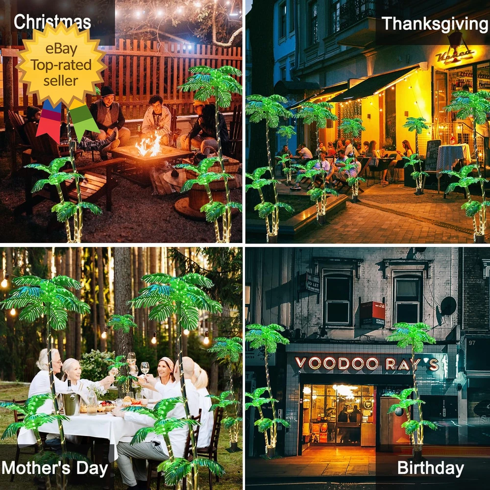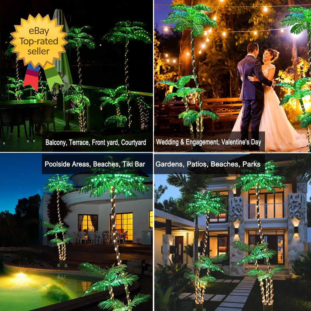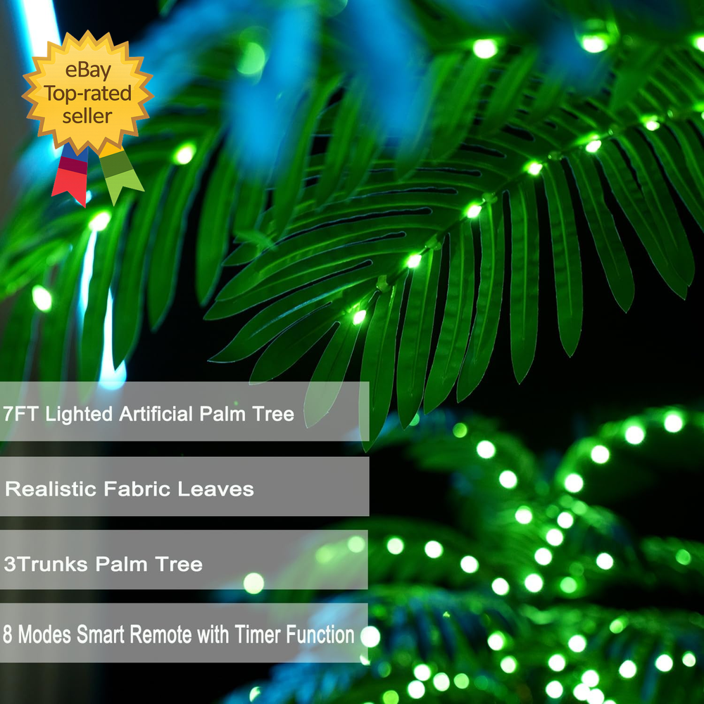 Store New Arrivals Add to Favorite View Feedback Contact 7FT Lighted Artificial Palm Tree with Three Trunks and 260 LED Lights Ideal Description Item Package Quantity 1 Style 7FT Electric Color Green Tree Type Palm Material Polyvinyl Chloride Recommended Uses For Product christmas Seasons All Seasons Palm Trees Warranty : We offer a one-year worry-free warranty and a 60-day money-back guarantee or replacement option. If you have any inquiries or concerns regarding our Artificial Palm Tree, please don't hesitate to contact us. Your satisfaction is our top priority.NOTE : number of items in a pack/box:1 set Realistic lighted Artificial Palm Trees - Indoor/Outdoor:lifelike artificial palm trees are expertly crafted from durable, high-quality plastic for long-lasting beauty. These faux trees boast vibrant colors, a sturdy structure, and timeless, evergreen realism that won't diminish over time. Ideal for both indoor and outdoor settings, our artificial palm tree enhances any space, adding a touch of elegance to every corner. Artificial Tree with Lights Eternal Greenery:The lengthy fronds of this artificial coconut tree maintain its balance and lifelike appearance. It's perfect for filling empty spaces in your home or office, or adding a touch of green to your garden, patio, kitchen, living room, bedroom, entrance, meeting room, hotel, and more. These artificial palm tree plants will preserve their height, texture, color, ribs, and shape for years without the need for pruning or shaping, ensuring lasting aesthetic appeal. Led Palm Tree Outdoor Maintenance-Free Elegance:Our artificial tree maintains its lush appearance day after day, without wilting or requiring watering, sunlight, or soil. Say goodbye to pests and odors – these trees stay insect-free and odorless. Cleaning is a breeze; simply wipe them down with a damp cloth or use a duster. These tropical palm trees are waterproof and can withstand the sun, oils, and heat. Outdoor Led Palm Tree Safe and Reliable Plug Palm Tree:This faux palm tree comes with all the necessary safety certificates and certifications. With a 10ft long plug cord, you can bid farewell to dead batteries and dim lights. Additionally, boasting a waterproof rating of IP54, this artificial tree can be confidently adorned indoors or outdoors. Lighted TreesIndoor/Outdoor-Sturdy 7FT Artificial Palm Tree:Crafted from top-tier materials, our 7FT palm tree features a robust metal trunk encased in durable nylon rope. It stands on a high-quality base, supported by four ground stakes, and includes water bags for added stability, ensuring it stays securely upright. Led Palm Tree Outdoor 8 Modes Simple Assembly, Versatile Lighting:Assembling this artificial palm tree is a breeze. Just unscrew the bottom base, connect the trunk, reinforce it, and wrap the lamp belt. Once the lights are on, you have 8 modes at your disposal: Combination, In Waves, Sequential, SLO-GLO, Chasing/Flash, Slow Fade, Twinkle Flash, and Steady, allowing you to create the perfect ambiance. Palm Tree Handcrafted Elegance, Eco-Friendly:Illuminate your outdoor space with our Lighted Palm Tree Bar, an exquisite Christmas Decor that boasts LED Artificial Trees. Meticulously handcrafted, this 7ft Palm Tree with 3 Trunks (Trunks one 7' Trunks two 3.3' Trunks three 2' depth) and 260 Lights achieves remarkable lifelike realism with its brown trunks and luxuriant green palm fronds. Its sturdy metal base ensures stability and longevity, further reinforced by four substantial stakes. ABOUT US We offer the best prices around on high quality products. Our E-store includes media such as books, movies, music and games while offering electronics, toys, sporting apparel, clothing, tools, general home, garden items and more. SHIPPING We are always working hard to ensure your package arrives as soon as possible. Please understand that some factors like weather, high postal traffic, and the performance of shipping companies are outside of our control. We offer free shipping to the lower 48 states and ship within 2 business days of payment, usually sooner. We do not accept P.O. Boxes. Please provide a physical address. For shipping outside of the continental USA, we only use eBay's Global Shipping Program.The item is shipped to KY and then sent to the rest of the world. International customers are responsible for all duties and taxes. Continue to check out in order to calculate costs for shipping the item to your country. Messages regarding eBay's Global Shipping Program MUST be directed at eBay EXCLUSIVELY. RETURNS We offer a 30-Day Return Policy on items which you are not completely satisfied with. You have the option for a full-refund or an exchange of the item. No returns are available on items shipped outside of the USA. PAYMENT We accept PayPal. CONTACT US This page content is yet to come Please ad us to your favorite seller and visit again later Thank You CUSTOMER SATISFACTION We try our very best to make sure every customer is completely satisfied. If there's a problem, message us! We're happy to help.