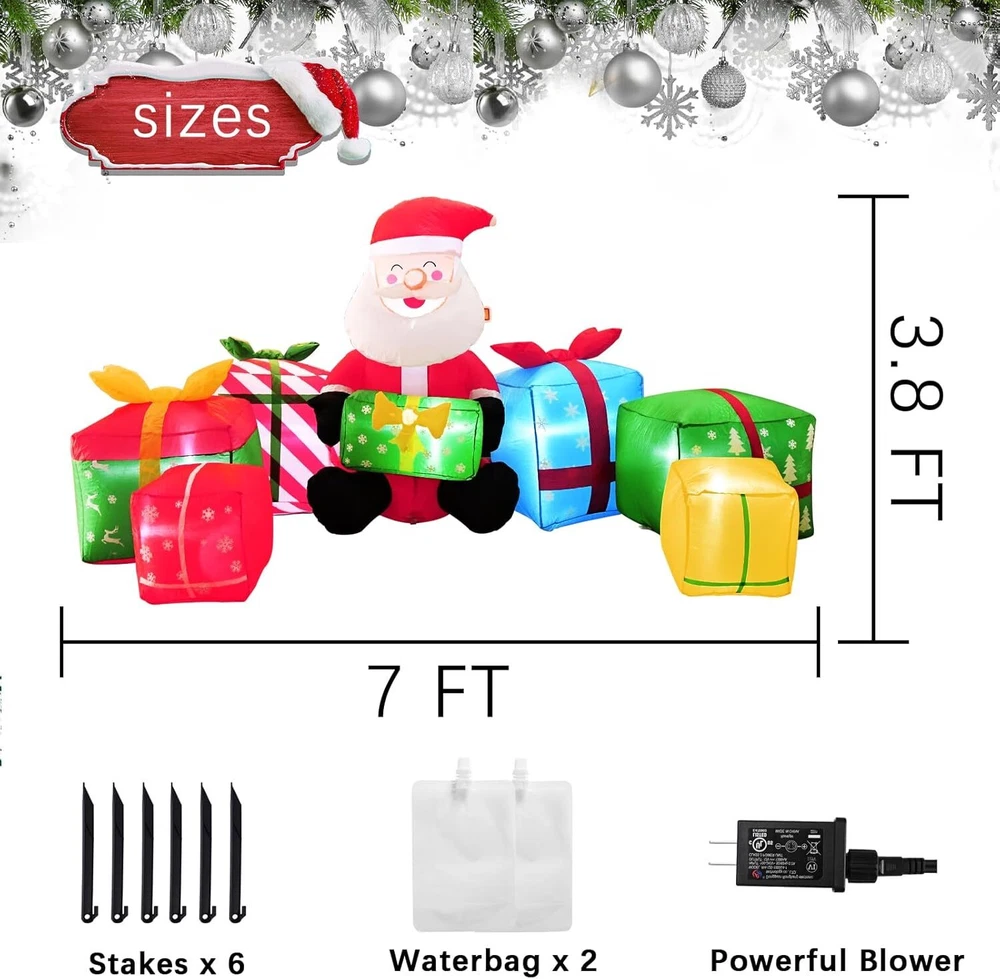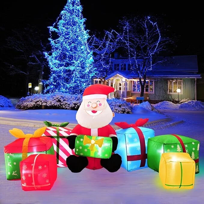 7FT Long Inflatable Santa Claus with Presents, Lighted Christmas Inflatable Gift Boxes Yard Decoration, LED-Lit Blow Up Santa for Outdoor Holiday Decor, Festive Inflatable Christmas Decorations Item Description Santa's Grand Gift-Giving Spectacle: Transform your yard into the ultimate holiday hotspot with our 7 ft inflatable Santa! With a jolly smile, Santa sits merrily among six vibrant gift boxes, each decorated with charming Christmas patterns like snowflakes, reindeer, Christmas trees, and bows. It's a scene straight out of a holiday storybook! Dazzling Holiday Lights: Make your Christmas nights sparkle with built-in LED lights that illuminate Santa and his colorful gifts. It's like having a mini light show right in your yard, spreading cheer to all who pass by. Instant Holiday Fun: Get your festive spirit soaring in minutes! Our powerful air blower and handy UL-certified adapter make setting up Santa and his gifts a breeze. With 6 ground stakes, Santa will stay put, even if he has to brave a winter wind! Built to Sleigh: Crafted from durable 190T polyester with sturdy stitching, our Christmas Santa inflatable is designed to withstand all the holiday fun. It stays inflated and jolly through the season and packs away neatly for the next year. A Present of Pure Joy: Spread the holiday magic by gifting this delightful Christmas Santa blow ups! Its playful design and generous size make it a standout present, arriving in a festive box that's perfect for Christmas lovers. › See more product details Transform your yard into a Christmas wonderland with this adorable 7-foot inflatable! Santa sits happily in the center, holding a gift, surrounded by 6 festive gift boxes, each decorated with classic holiday designs like snowflakes, reindeer, and Christmas trees! As the sun goes down, watch the magic come to life! The built-in color-changing lights will make Santa and his presents glow, creating a bright and festive scene that’ll have the whole neighborhood stopping by for a look. Perfect for day or night, this Christmas inflatable gift boxes will spread holiday cheer to kids, neighbors, and even Santa himself when he comes by! It's super easy to set up—just close the zipper, plug it in, and secure the Christmas blow-up gift boxes in place using the 6 included plastic stakes. It’ll stay put, even on chilly winter nights! When the fun’s over, simply pack it up for next year’s celebrations—easy as can be! Don’t wait to bring this joyful decoration home—it’s not just a display, it’s a holiday memory in the making! Payment We accept payment only through PAYPAL Shipping We ship products worldwide through standard express courier service, it will reach within 7 to 10 days to abroad buyers, we ship the product after recieved clear payment and give full information about shipment to the buyer Return We accept product return within 7 to 21 days from delivery date but product should be in original position and not in damaged condition,the return shipping charges will be buyer responsibility