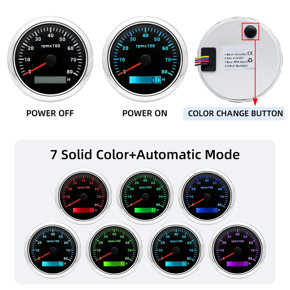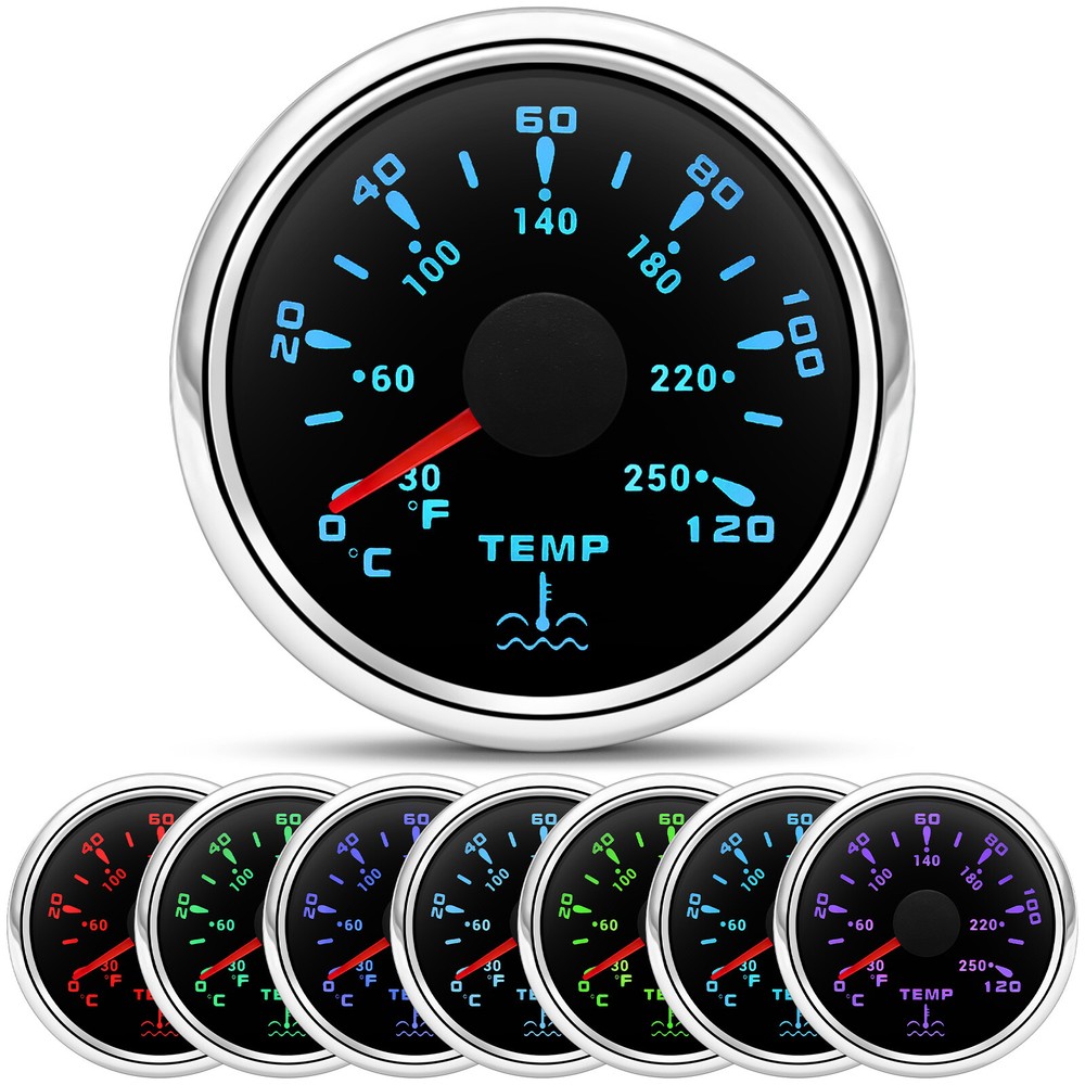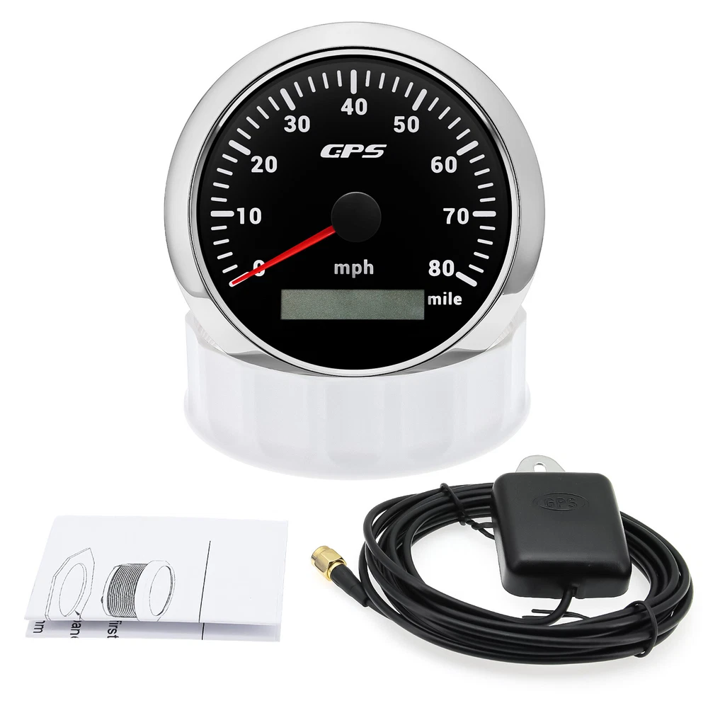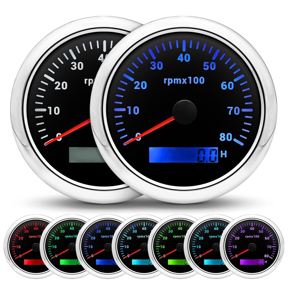 7 Gauge Set GPS Speedometer 0-80MPH Tacho Fuel/Oil Press/Volt/Temp/Trim Gauge 7 Gauge Set 85mm GPS Speedometer 0-80MPH Tachometer with 52mm Gauges Waterproof for Boat Car Feature: High-brightness LED backlight. 316 stainless steel for long-term use even in acid-base, humid environment. IP67 waterproof and dust-proof grade. With curved glass( with anti-fog function). Suitable for all kinds of vehicle modification. Using stepper motor drive pointer, accurate display of the engine speed, and with the LCD display clear display mileage. Gauges have many kinds backlight color (red,yellow,orange,green,blue,purple,white),customers can adjust any color that you like GPS Speedometer Gauge Install Diameter: Φ85mm or 3-3/8" Signal: GPS Working Voltage: 9~32V DC Size: 12x8x12cm / 4.72x3.1x4.75 inch Indication Range: 0-80MPH Backlight:7 Colors Backlight Tachometer Install Diameter: Φ85mm or 3-3/8" Engine hours: 0.0-99999.9H Backlight :7 Color backlight Indicating Range: 0~8000 RPM Signal: Pulse For Tachometer, you can substitute for different unit, please contact us before / after purchase or note on the order. Tachometer: 0-3000rpm/0-4000RPM/6000RPM/7000RPM Fuel Level Gauge Sizes: 52 mm (2-1/16") Measuring Range: Empty - Full Resistance: 240 (E) - 33 (F) ohms Backlight: 7 Colors Water Temperature Gauge Install diameter: Φ52mm Indication range: 0~120℃/30-250℉ Input signal: 287.4~22.4 ohms Storage temperature: -40~+85℃ Backlight: 7 Colors Oil Pressure Gauge Install diameter:Φ52mm or 2-1/16" Indication range:0~10bar / 0-150 PSI Operating temperature:-30~+75 Storage temperature:-40~+85 Backlight: 7 Colors Volt Gauge Sizes: 52 mm (2-1/16") Measuring Range: 8 - 16 (V) Backlight: 7 Colors Trim gauge 7 Color Backlight : Red (default)→green → blue → white →yellow→cyan →Purple →(automatic). Fixing dimension: 52mm(2'') Indicating Range: UP-DN Signal: 0-190ohms Working Voltage: 9-32V(12V/24V) Operation mode: LCD display, stepper motor Package Includes: 1X 85MM Digital GPS Speedometer Gauge 1X GPS Antenna 1X 85MM Tachometer 1X 52MM Fuel Level gauge 1X 52MM Trim gauge 1X 52MM Voltmeter 1X 52MM Water temp gauge 1X 52MM Oil Pressure gauge 7X Installation Instruction Please confirm the size you need before buying