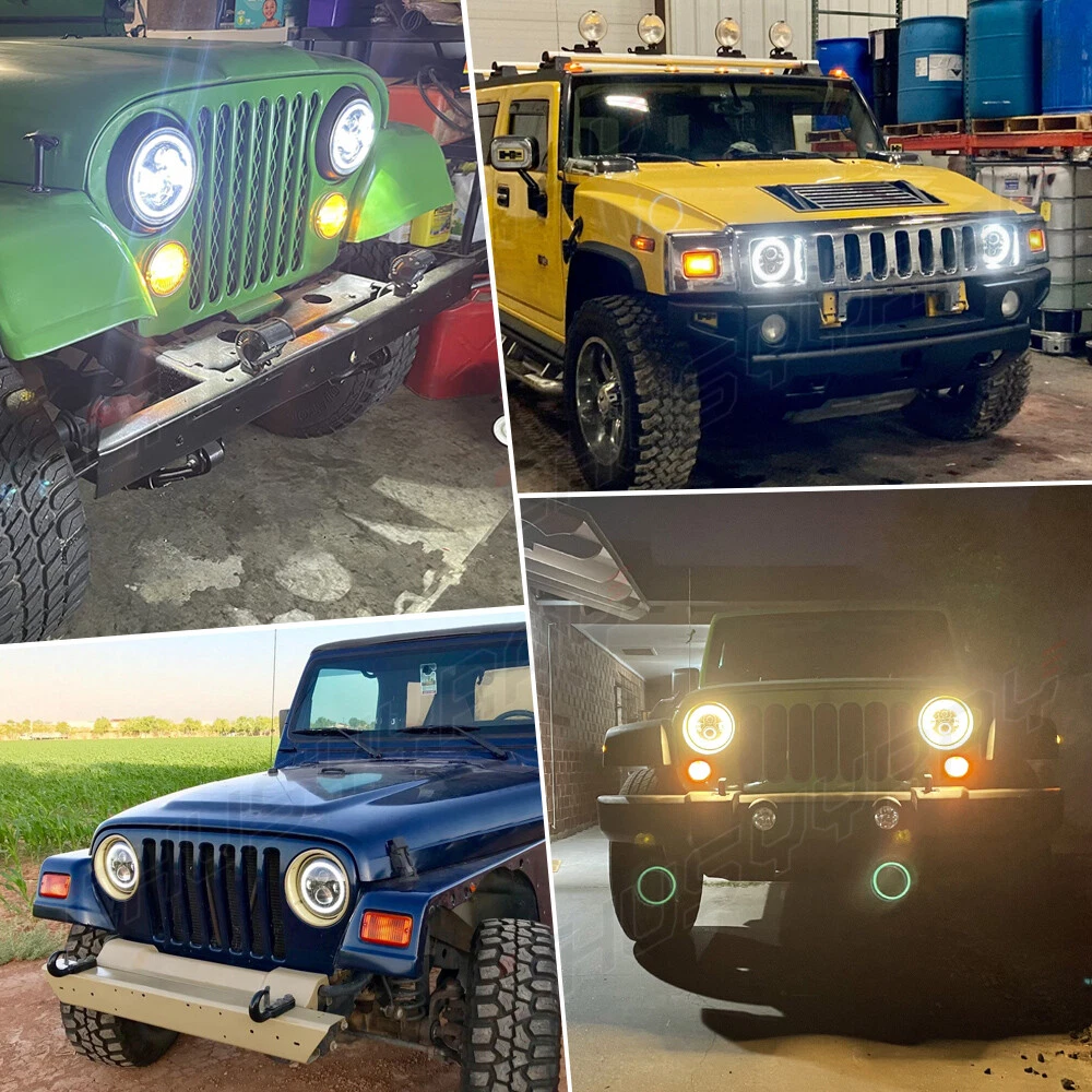 【PACKAGE INCLUDED】 2pcs x 7inch Round LED Headlights + 2pcs 4inch LED Halo Fog Lights + 2pcs x H4 to H13 adapter 【EASY TO INSTALL】 Just plug and play for update Wrangler LED headlights and fog lights assembly (some may need a little modification). DOT approved, legal on the road & built-in EMC function, no need extra decoder 【HIGH PERFORMANCE】 7" LED headlight and front bump LED fog light with halo angel eyes DRL replaces original halogen and HID headlight. Made of DIE-Casting aluminum housing and polycarbonate lens, ribbed design for better heat dissipation. Rustproof and shock-proof. Sealed housing, Water-proof IP67. Over 50000 Hours Lifespan. Specification Condtion: New Brand: chusyyray High beam: 120Watt 9600LM Low beam: 110 Watt 6000LM HI/LO BEAM: Pure White / Turn Signal Color:Amber / DRL Color: Gloden Yellow With rebreather: Better waterproof, dispelling fog inside Anti Flicker and EMC inside: No Electromagnetic Interference or flickering Sharp cut-off line with superior light output EASY INSTALLATION - No extra wire adapter and bracket needed, Just Plug & Play Certification: DOT Waterproof Rate: IP67 Feature: Anti-crash Anti-crash lens are very important for offroad, which will keep headlights intact when attacked by little rocks. They won't be broken even beated by a hammer ! Maximum protection for led headlight from minor abrasions and slight scratching. No worry to have offroad on forest, desert and so on. Plug N Play Other headlights require extra dongles, anti flicker harness, and are built with sub par components. Our headlights feature built in anti flicker technology, DOT approved and and everything you need for installation. Let them be your Jeep Halo headlights, they will never let you down! IP67 Waterproof Our 7'' LED Headlights are well constructed. They come with Double Breather Valve to prevent water getting inside. Avoid moisture or condensation in foggy or raining days. IP68 rated waterproof, can work well in rainy days, snowy days and other weather conditions. Package Includes: 2Pcs x Round 7 Inch LED Headlights 2Pcs x Round 4 Inch LED Fog Lights 2Pcs x 9008/H13 Adapter