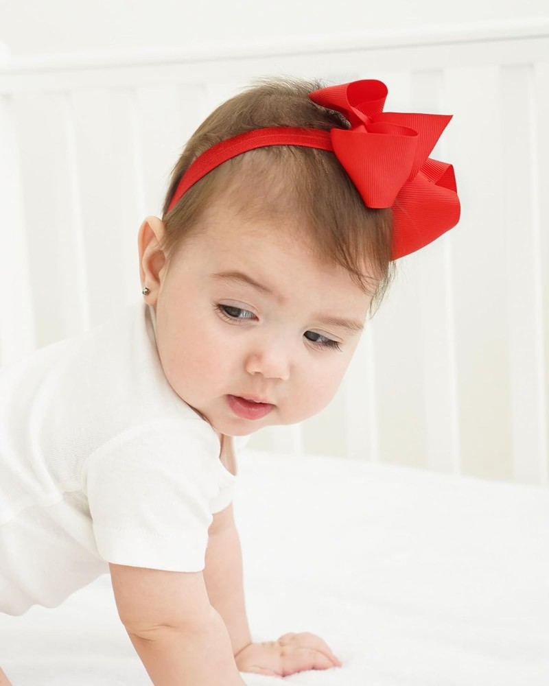 About this item High Quality: The baby girls headbands are made from Grosgrain Ribbon and elastic band,very comfortable and lovely to wear,they will not leave marks on your little one's head Size: Hair bow:4"(10 CM),Headband size:13.5"(34 CM)girth. it allows a baby headband to expand to fit your growing baby! This headband will fit all ages Various of Color: These baby girls hair bands have 7 colors are available for almost all occasions,You'll love these Soft Toddler headbands Lovely and Soft: These cute hair bows headbands are absolutely adorable and well great for baby girls hair decoration,it will make you baby be more lovely Nice Point:This stretchy hair bows headbands are the perfect present for any occasion!Birthdays,Baby Shower,Christmas and more