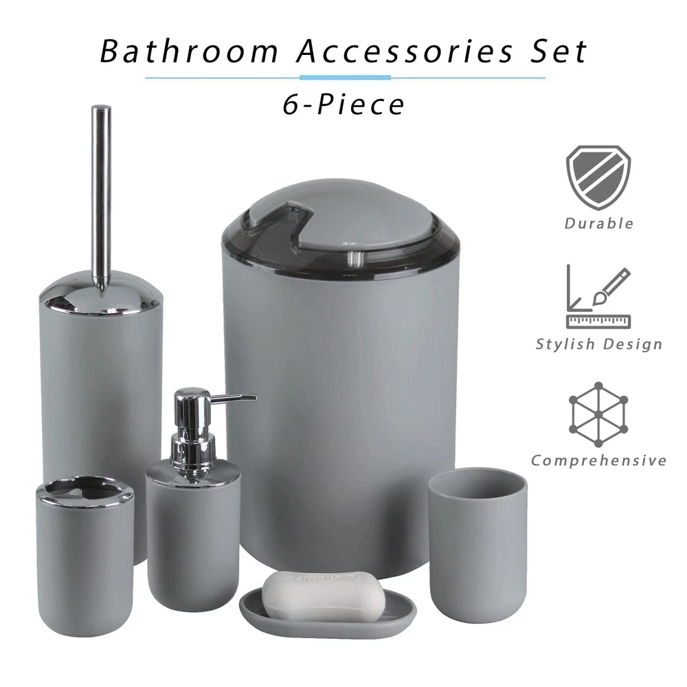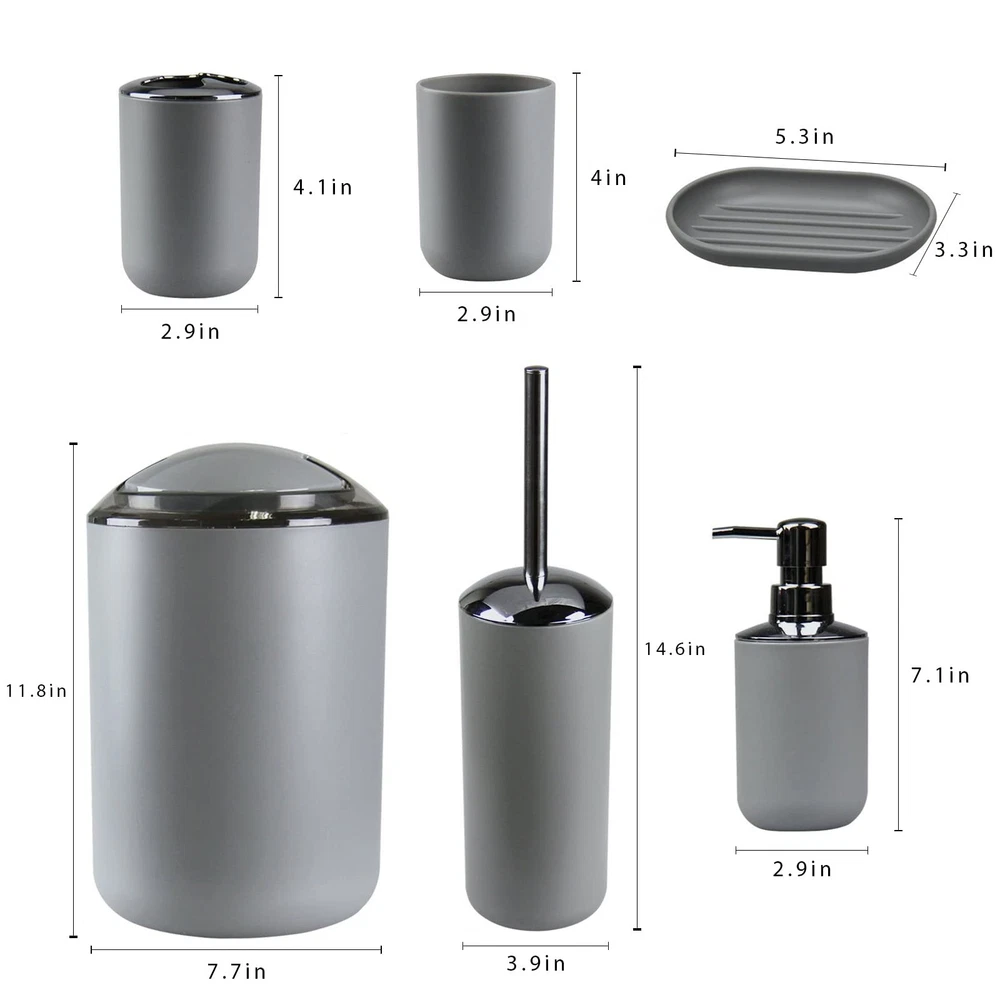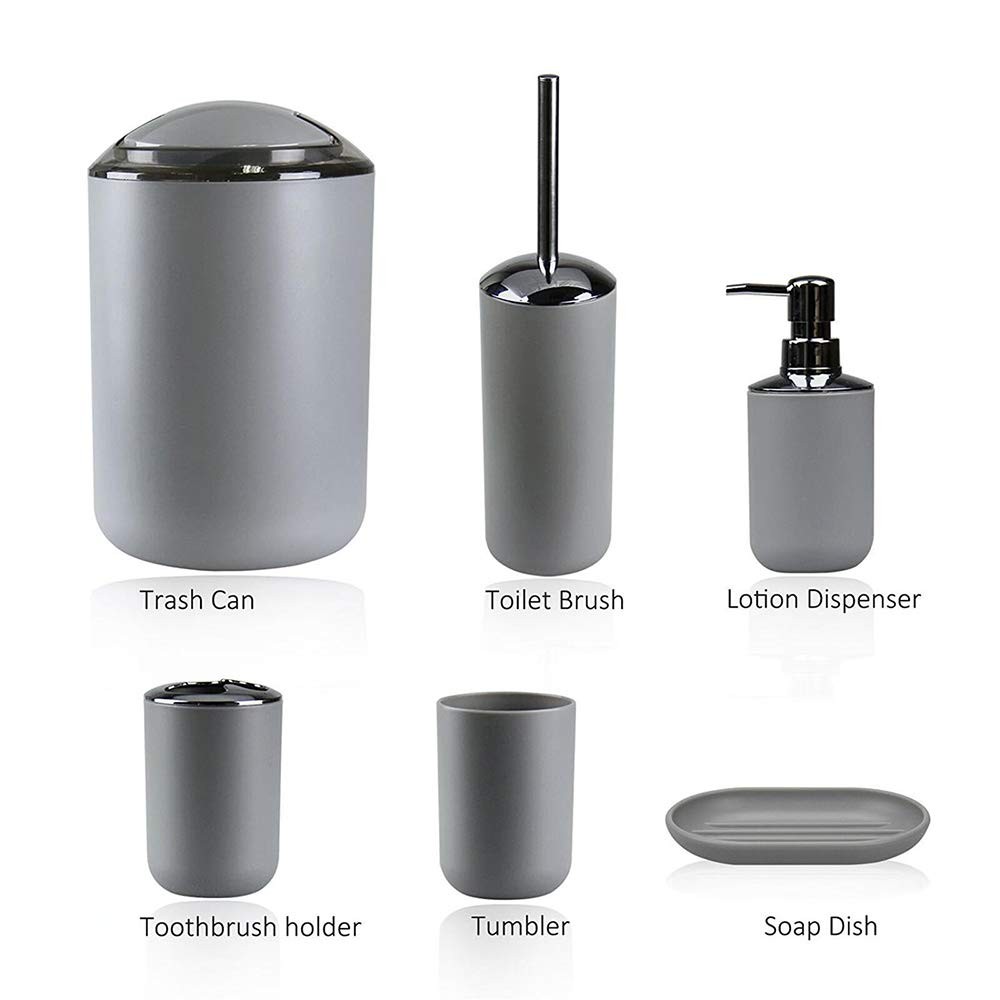 Complete Bathroom Accessory Set:Featuring a Toothbrush Holder,Toothbrush Cup,Soap Dispenser,Soap Dish,Trash Can,Toilet Brush & Holder,our bathroom accessories set ensures a unified and stylish bathroom aesthetic. Durable Design:Our Grey bathroom accessories set crafted from Durable and cleanable plastic, it effortlessly withstands daily wear and tear, ensuring long-lasting use. Space-Saving Design:Maximize your bathroom space with our compact and cleverly designed grey bathroom accessories set.Whether you have a small room or a spacious master bathroom, our bathroom accessories set offers smart storage solutions without taking up unnecessary space. Vibrant and Stylish:Add a pop of color and style to your bathroom with our vibrant and modern bathroom accessories set. they effortlessly enhance the aesthetics of your space while providing practical functionality. Versatile & Nice Gift:Our bathroom accessories set is a perfect fit for any space, whether it's your home bathroom, dorm, hotel, or RV. Its modern design effortlessly complements any bathroom, making it an ideal present for housewarmings or new homes.Whether it's for your family, friends, colleagues, or customers, this bathroom accessories set makes the nice gift.