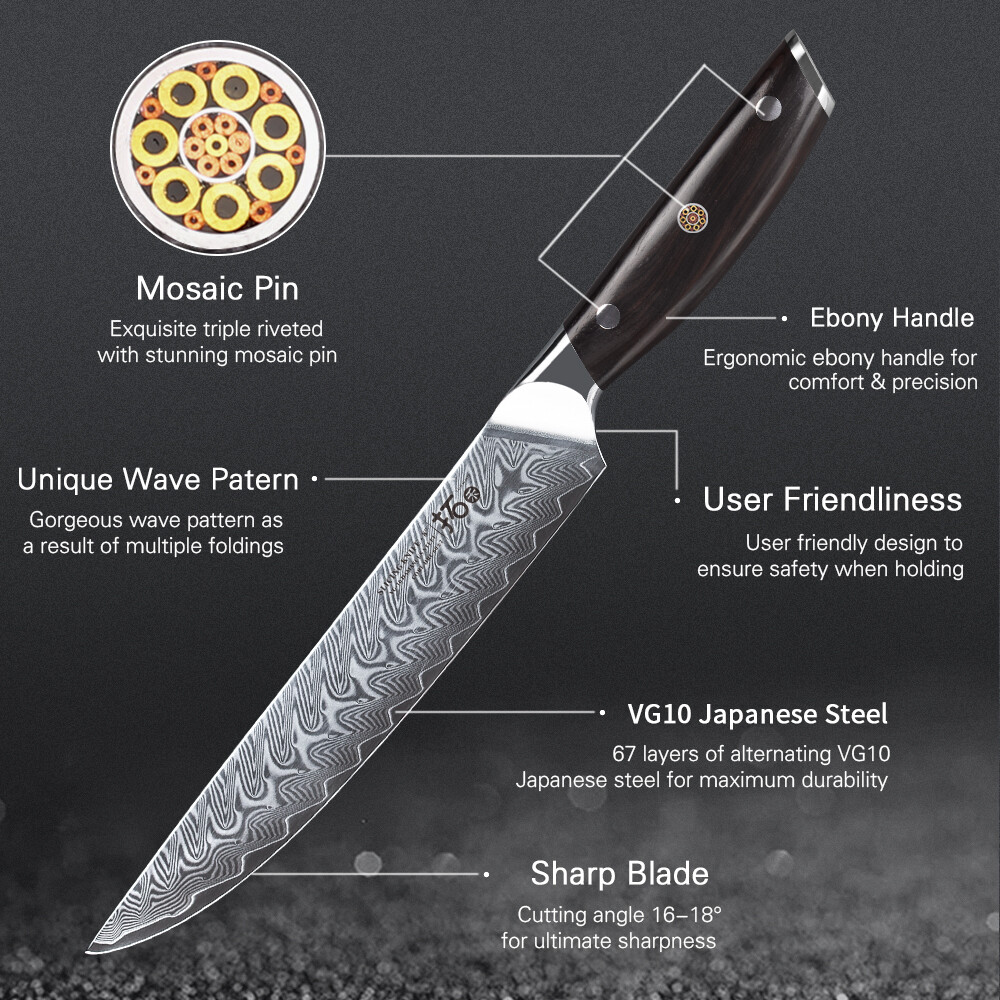 Feature:This kitchen knife set are made of high quality Japanese 67-layer Damascus steel and treated with 60HRC vacuum heat treatment and liquid nitrogen cooling. The Rockwell hardness of the cutting core is 60+. The cutting edge is 16-18 degrees, which means the blade is super sharp. Compared with similar products at this price, it has outstanding performance advantages.Exquisite appearance: beautiful and impressive fish bone pattern. Every time you pick it up, you can't help but taking cooking seriously. AND remember? Serious men are always handsome. Then don’t forget to wipe your chef knife after using, to make a perfect finish to your cooking.The chef Knife are one of the most useful and versatile designs available, which you can... DAMASCUS KNIVES 7x TURWHO Chef Knife Damascus Steel Santoku Kitchen Knife Block Set With Ebony Handle Feature: This kitchen knife set are made of high quality Japanese 67-layer Damascus steel and treated with 60HRC vacuum heat treatment and liquid nitrogen cooling. The Rockwell hardness of the cutting core is 60+. The cutting edge is 16-18 degrees, which means the blade is super sharp. Compared with similar products at this price, it has outstanding performance advantages. Exquisite appearance: beautiful and impressive fish bone pattern. Every time you pick it up, you can't help but taking cooking seriously. AND remember? Serious men are always handsome. Then don’t forget to wipe your chef knife after using, to make a perfect finish to your cooking. The chef Knife are one of the most useful and versatile designs available, which you can use to chop, slice, dice and mince all types of vegetables, fruits, meats, bread and fish. This chef knife will be your most valuable player, no matter what type you pick. So choosing an excellent chef knife is especially important. Design Characteristics: Ergonomic ebony wood handle. The shade of handle is designed based on the human engineering. This can lessen your tiredness, numbness, and soreness even if you grasp it for a long time. EASY CARE:All knives store safely In the acacia wood knife block. Simple appearance can decorate your kitchen without taking up space and reduce knife contact with air and risk of rusting.It is indispensable gift for Christmas parties. TURWHO Trust: We promise a superior product that will give you a lifetime of exemplary service, try it risk free, we know you'll love it. Specification: Brand: TURWHO Blade Material: Japanese VG10 67-layer Damascus Steel Handle Material: Ebony Handle Color: Black Cutting edge: 16-18 degrees Food Compatibility: Universal Manufacturer Warranty: Lifetime Weight: 4.54KG (including box) Package included: 1x TURWHO 3.5-inch Paring Knife 1x TURWHO 6.5-inch Boning Knife 1x TURWHO 7-inch Santoku knife 1x TURWHO 8-inch Slicing Knife 1x TURWHO 8.2-inch Chef Knife 1x TURWHO Multi-Purpose Kitchen Scissors 1x TURWHO Acacia Wood Storage Block Holder 1x TURWHO Premium Package Gift Box 1x TURWHO Cleaning Cloth 1x TURWHO Operation Instructions Item Specifics Brand TURWHO Set Includes Chef's Knife Type Chef's Knife Food Compatibility Universal Material Japanese VG10 Damascus Steel Cutting edge 16-18 degrees Color Black MPN US112468 Blade Edge Straight Handle Material Ebony Handle Features Well Balance, VG10 Damascus Steel, Very Sharp Number of Items in Set 7 Custom Bundle Yes Manufacturer Warranty Lifetime Bundle Description 5x Knife, 1x Shears, 1x Knife Block In Gift Box Making Method Hot Air Room Kitchen Blade Length 3.5in, 6.5in, 7in, 8in, 8.2in Block Holder Material Acacia Wood Payment All purchases will go through eBay secured checkout to ensure that your order is processed without any delays. After you have made your purchase you can either click on 'Pay now' or follow the instructions in an automated email that you will receive shortly after your purchase. During the checkout, you can make an immediate payment by PayPal account, MasterCard, Visa or select an alternative method of payment, and receive the necessary payment details. Please note: If you have already marked payment as sent But actually not paid, then you MUST mark as payment not sent otherwise the PAY NOW button will not be available. Shipping 1.all orders will be Dispatched within 2 working days after payment. 2.orders are not processed on weekends or public holidays. 3.usually takes 3-6 business days to most US destinations. 4.Your patience would be much appreciated. 5.all items will be checked carefully and packaging well before send out. 6.All orders are including the tracking number. Any questions, please feel free to contact us. Returns Refund or replacement request is available only the requests within 60 days after parcel received & return the item as the same condition as received. Please contact us to request a return authorization. Your name, auction number, and reason for return should be included in the email. All items returned must contain all original packaging materials. Please repack the item carefully. Item returned will be tested and a new replacement will be shipped to the buyer immediately when found defective. In the event that a suitable replacement is not available then a refund will be issued. If the item is found non-defective and buyer just don't like it, we will still make you a full refund, but the return shipping fee at buyer's expense. All item return must have a RMA number, Please contact us to request a return detail address and the RMA number, this can help us identify return items accurate. Buyer is responsible for additional shipping costs for items that are returned refused or undeliverable. We do not accept any returns without an authorization number on the box or label it is being returned in. Contact Us We care about our valued buyers, if you have any questions, our Customer Service will be very glad to help you. For more information, please contact us through ebay message system. All questions would be answered within 48 hours. DAMASCUS KNIVES DESCRIPTION PAYME