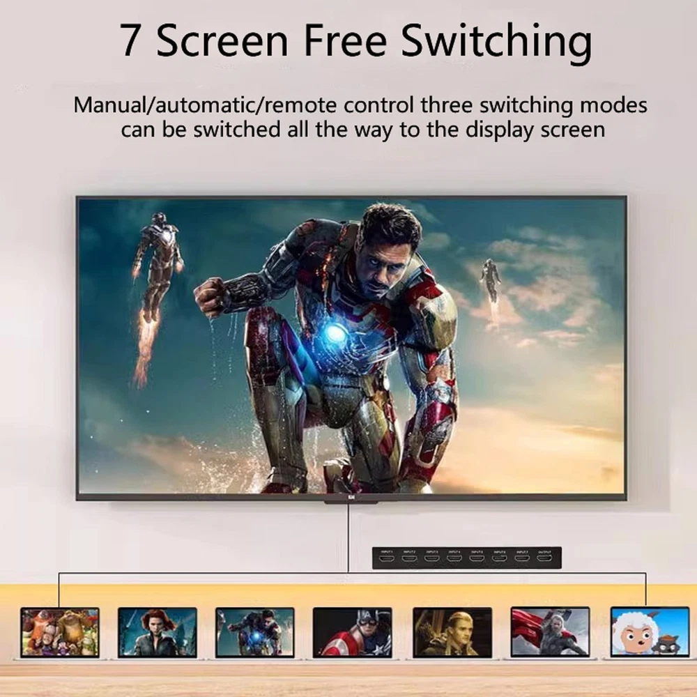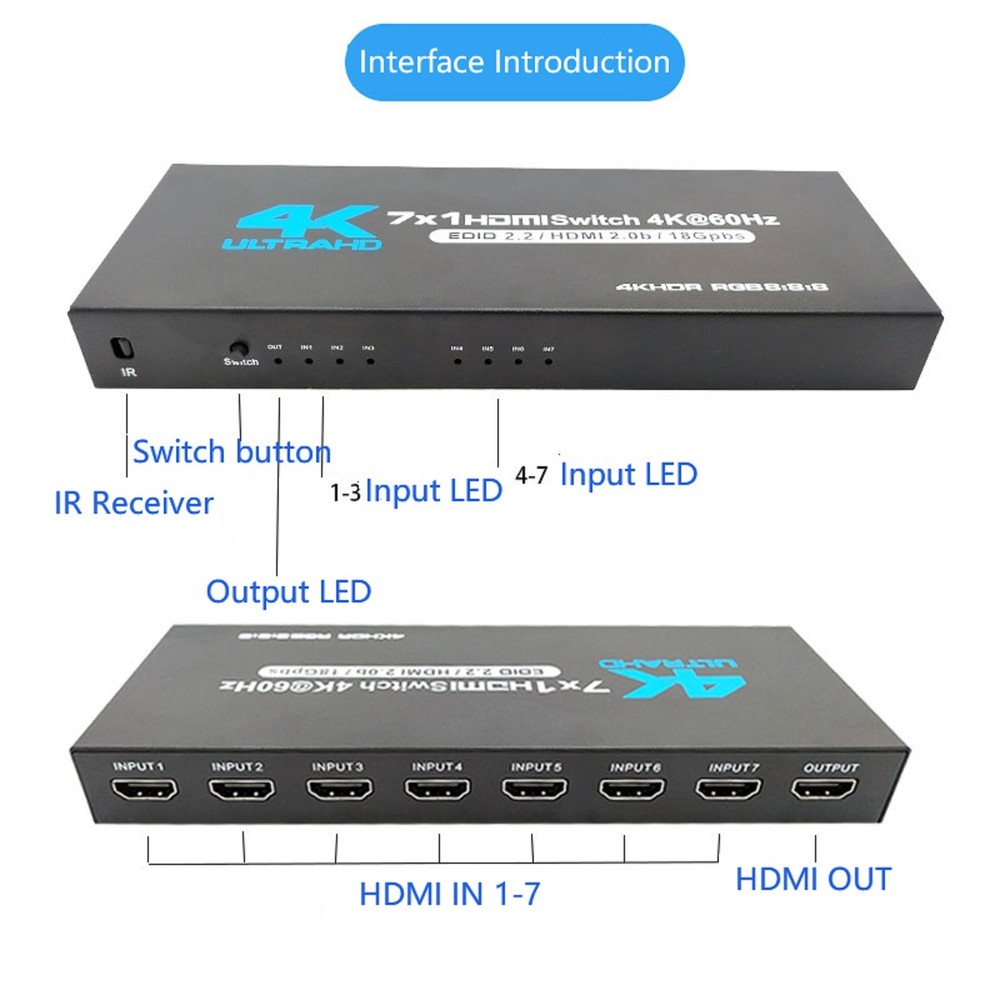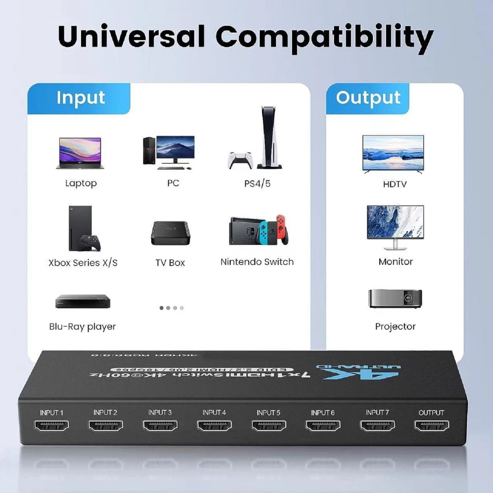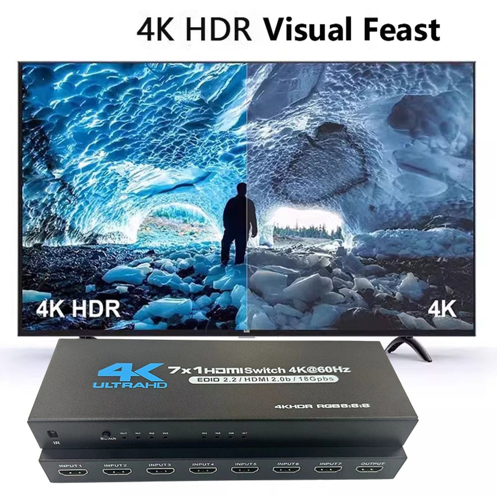 Product Description 7-Port HDMI Switch 2.0 4K@60Hz 7x1 HDMI 2.0 Switcher With IR Remote Support HDR 7 Port HDMI2.0 Switcher with IR Remote 4K@60Hz HDMI 2.0 7x1 Switch 7 in 1 out Switch Support HDR Specifications: HDMI Version: HDMI2.0b, HDCP2.2 HDMI Resolution up to 4K60Hz Supports resolution: 480P, 720P, 1080P, 1080p 3D, 4K30hz Support Video Format: 12 bit deep color Support Audio Format: DTS-HD/Dolby Max Bandwidth: 600MHZ Max Baud Rate: 18.5Gbps Power supply: DC5V1A Material: Iron Color: Black Features: 1. 7 In 1 Out 2.0 Switch: HDMI 7 in 1 Switch connects up to 7 HDMI source components to one HD Display, solving your multiple HDMI devices issue, Seamlessly switch between games, TV, desktop, creating a superb picture quality and seamless sound. NO lag, NO flash or drop in resolution 2. 4K High Resolution at 60Hz: 7 Port HDMI switch supports up to 4K@60Hz resolution, compatible with lower resolution: 4k@30Hz/Full HD 1080P/Full 3D 1080P/720P and more, It allows you to enjoy the crystal-clear display with incredible fluency while freely switching between the four devices 3. Auto-Switch with Remote Control: 4K HDMI Switch will automatically skip to the next port with a viable signal input; will automatically skip to the most recently inserted HDMI signal source, Manual switching can be done by IR remote 4. Wide Compatibility: HDMI switch For box works with all HDMI-integrated devices, such as for Fire TV, for Apple TV, for STB/ for IPTV, for LCD TV, for DVD Player, for Blu-Ray players, for PS3/ for PS4, for Xbox 360, for Roku and other HDMI capable devices. It supports DTS, DTS-HD, and Dolby compressed audios Package Included: 1 * HDMI Switch 7x1 1 * Remote Control(Not included 2*AAA batteries) 1 * Power Cable 1 * Power adapter 1 * User Manual Shipping Returns Contact Us Payment 1. Items sent from US warehouse. 2.Receiving time = Processing time + Shipping time 3. Processing Time: Around 1-2 business Days 4. Shipping Time: 3-5 business day it may have a little delay during some holiday (such as Christmas),any problem ,please feel free to contact 1. 30 days warranty from the purchased date. Please contact us via email before returning the defective item. 2.Our warranty does not extended to any product that are physically damaged or that are not under normal operating conditions as result of misuse or improper installation on the buyer/user's part. 3.Return items should include the original packaging and all accessories. buyers MUST contact us for the returning address. 4.In all cases, buyers pay shipping fees at their own cost to return products for exchange or refund. We will be responsible for the postage of replacements. Refund will be made upon receipt of the returned item. Pls contact us if you have any problems,we will try our best to solve for you We accept all verified payment from eBay. Shipping 1. Items sent from US warehouse. 2.Receiving time = Processing time + Shipping time 3. Processing Time: Around 1-2 business Days 4. Shipping Time: 3-5 business day it may have a little delay during some holiday (such as Christmas),any problem ,please feel free to contact Returns 1. 30 days warranty from the purchased date. Please contact us via email before returning the defective item. 2.Our warranty does not extended to any product that are physically damaged or that are not under normal operating conditions as result of misuse or improper installation on the buyer/user's part. 3.Return items should include the original packaging and all accessories. buyers MUST contact us for the returning address. 4.In all cases, buyers pay shipping fees at their own cost to return products for exchange or refund. We will be responsible for the postage of replacements. Refund will be made upon receipt of the returned item. Contact Us Pls contact us if you have any problems,we will try our best to solve for you Payment We accept all verified payment from eBay. You may also like 22.5W Fast Charging 8 x 18650 Battery DIY Detachable Power Bank Shell Case 15.14 USD 16.82 USD 10% off 2x 3-AAA Battery Holder Cylindrical Case Plastic For Flashlight Round Circular 8.19 USD 9.1 USD 10% off 4* 20x8mm Aluminum Isolation Feet Stand For CD Turntable Radio AMP Amplifier xx 11.57 USD 12.86 USD 10% off OEM AXV417WHP New Pool Cleaner Set Fit For Hayward Navigator Pool Vac Ultra Pool 19.06 USD 21.18 USD 10% off 2pcs Analog Stick Joystick Replacement For PS5 Dualshock Wireless Controller b 7.91 USD 8.79 USD 10% off 2* Ear Pads Cushion For ASTRO Gaming A50 Gen3 Gen4 Wireless Headset Accessories 13.09 USD 14.54 USD 10% off powered by