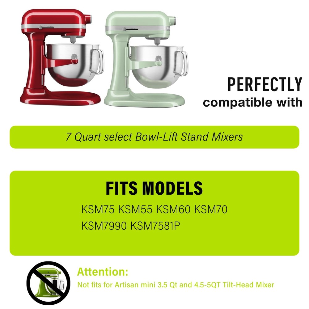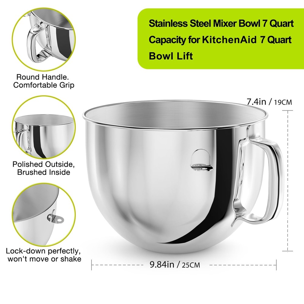 7QT Stainless Steel Mixer Bowl Compatible with Kitchenaid Stand Mixers, Kitchenaid Mixing Bowl Replacement Bowl for 7QT Bow-Lift Stand Mixer with Handle and Lid [Wide Compatibility]: The mixing bowl is perfectly matched with KSM70SKXXVB, KSM70SKXXCA, KSM70SKXXBK , KSM70SKXXCU, KSM70SKXXER, KSM70SKXXFT, KSM70SKXXDR, KSM70SKXXMH, KSM70SKXXMI, KSM70SKXXPT, KSM70SKXXWHK, KSM7581, KSM7591, KSM-7580, KMS7586RSR, KMS7586PCA, KSM7589PFP, KMS7586POB, KMS8990NPK, SM7990, KSM7581P. Ensure the mixing bowl is securely attached to the blender with strong locking features on both ends. (Please note that this product is not currently available for the other model.) [Durable Materials]: This kitchen aid mixing bowl is made of high-quality 304 stainless steel to ensure it is sturdy and durable. Unlike glass bowls, this large stainless steel mixing bowl is lightweight, thick, and sturdy. The stainless steel material is rust-resistant and can withstand long-term use and frequent stirring, providing a reliable choice for your kitchen. [Large Capacity]: Experience the extra large capacity of our 7-quart stainless steel mixing bowl, providing ample space to mix thick dough or batter, whether you are making dough, cakes, etc. or large mixtures, it can be easily handled. The bowl covers are made of splash-guard plastic to prevent ingredients from splattering during high-speed mixing, reducing mess and waste while keeping your countertop clean. Easy to clean: This stainless steel mixing bowl for kitchenaid mixer accessories has a smooth surface and is not easy to adhere to food residue. This makes cleaning very easy, you can easily wash the mixing bowl by hand or put it in the dishwasher. Ideal Gift & Service:This kitchen aid mixing bowls is a great household gift for Thanksgiving, Christmas Day, Mother's Father's Day, Valentine's Day.