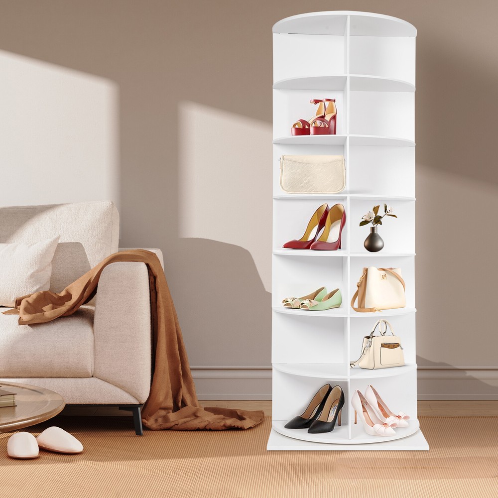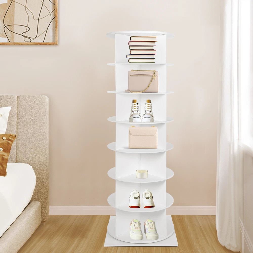7 -Tiers Rotating Shoe Rack Storage Shelves 360 Degree Rotating Shoe Tower Rack Description Are you seeking a sturdy, durable, large-capacity, high-value rotating shoe rack? Come and take a look at our product! Thick boards and stable construction ensure robustness and longevity. It is easy to install, can be rotated 360°, allows you to easily access and store your multiple pairs of shoes, and gives you a neat and organized living space. Key Features Sturdy and Durable: It is made of high-quality foamed PVC boards and ecological boards, basically non-toxic and odorless , not easy to deform and rust, and remains in good condition after long use. Rotating Design: The chassis spindle with a stainless steel axis can be rotated 360° with a gentle push, allowing you to easily browse and select the shoes you need and greatly enhancing the convenience of use. Large Capacity: It adopts a 7-tier design, each has 4 compartments and each compartment measures 11*14.3*8.3", to accommodate up to 28 pairs of shoes, solving the problem of family shoe storage and keeping the home environment neat and orderly. Enough Load Capacity: The thick boards, strengthened chassis axis, and stable structure can support a maximum weight of 77.16 lbs, allowing you to place your shoes confidently while ensuring smooth rotation even when fully loaded. High Space Utilization: Its vertical structure occupies a footprint of 23.62*23.62 inches and makes full use of limited space such as corners in your home, which is ideal for small homes or apartments, freeing up more activity areas. Easy to Assemble: It adopts snap-in installation, so you can easily complete the assembly without additional tools, letting you enjoy the fun of DIY. Stylish Appearance: The classic white appearance with a square base, a round frame, and fan-shaped compartments is full of design and modernity, which harmoniously adapts to various decorative styles. Simple Cleaning: Thanks to its smooth surface and open structure, you can wipe away stains and dirt with just a damp rag. Ideal Gift: Thanks to its practicality and aesthetics, you can give it as your well-chosen gift to your family, relatives, friends, etc. Details Anti-slip Base: The large square base provides more stable support to prevent accidental tipping and sliding. Smooth Edges: The smooth and burr-free edges enhance the beauty of the product and better care for your skin when installing, using, and cleaning it. Application It helps you store most types of shoes, bags, hats, ornaments, small potted plants, CDs, etc., and can be placed in the entrance, living room, bedroom, cloakroom, and more. Specification Color: White Material: Foamed PVC Sheet , Ecological Board, Stainless Steel Mount Type: Freestanding Assembly Required: Yes Number of Tiers: 7 Accommodated Shoes: 28 Overall Load-capacity: 35kg/77.16 lbs Each Slot Size: 28*36.32 *21cm/ 11*14.3*8.3in Product Size(D*W*H): 60*60*165cm/ 23.62*23.62*64.96 in Package Size: 65*65*40cm/25.59*25.59*15.75in Gross Weight: 20kg/44.09 lbs Net Weight: 18kg/39.68 lbs Package Included 1* Rotating Shoe Rack Notes Please check the style and size before purchasing. Shoes and other items for display are not included in this package. Please allow the slight color difference caused by the shooting light and 1-3cm error due to manual measurement and make sure you do not mind before ordering. Payment Delivery details Terms of sales About us Contact us Payment We accept ebay payment 。 Fees such as import duties, taxes are not included in the item price or shipping costs. These charges are the buyer's responsibility. Delivery details Shipping: 2-9 working days to: USA Terms of sales We maintain high standards of excellence and strive for hundred percent customer satisfaction. Feedback is very important to us. We hope that you contact us immediately before you give neutral or negative feedback, so that we can address your concerns. It is impossible to address issues if we do not know about them! About us Your satis faction is our ultimate goal. We work hard to earn your trust and future business. Our certified technicians have tested each item before shipping. The unit comes with 1 year limited warranty on all manufacturing defects. a) If you receive a defective item, you may return it or ask for a discount. Please contact us within 14 days after you receive the package. b) What you returned must be intact and in its original packaging as re? u. Customer is responsible for shipping costs of the returned item. c) We will cover the cost of shipping back t with the shipping rate indicated in the registration page. We will send you a new unit or refund the full payment you paid. Thank you. Contact us Business Hour Business Hour: Monday To Friday: 8:30 AM to 5:00 PM (Beijing China time) Due to time zones, our reply to your questions may not be immediately. But within above working time, we will reply your email within 24 hours. If it's non-workdays, please kindly be patient and wait till Monday. Please contact us with ebay message. Please feel free to contact us if you have any questions. Monday To Friday: 8:30 AM to 5:00 PM (Beijing China time) Due to time zones, our reply to your questions may not be immediately. But within above working time, we will reply your email within 24 hours. If it's non-workdays, please kindly be patient and wait till Monday. Please contact us with ebay message. Please feel free to contact us if you have any questions.
