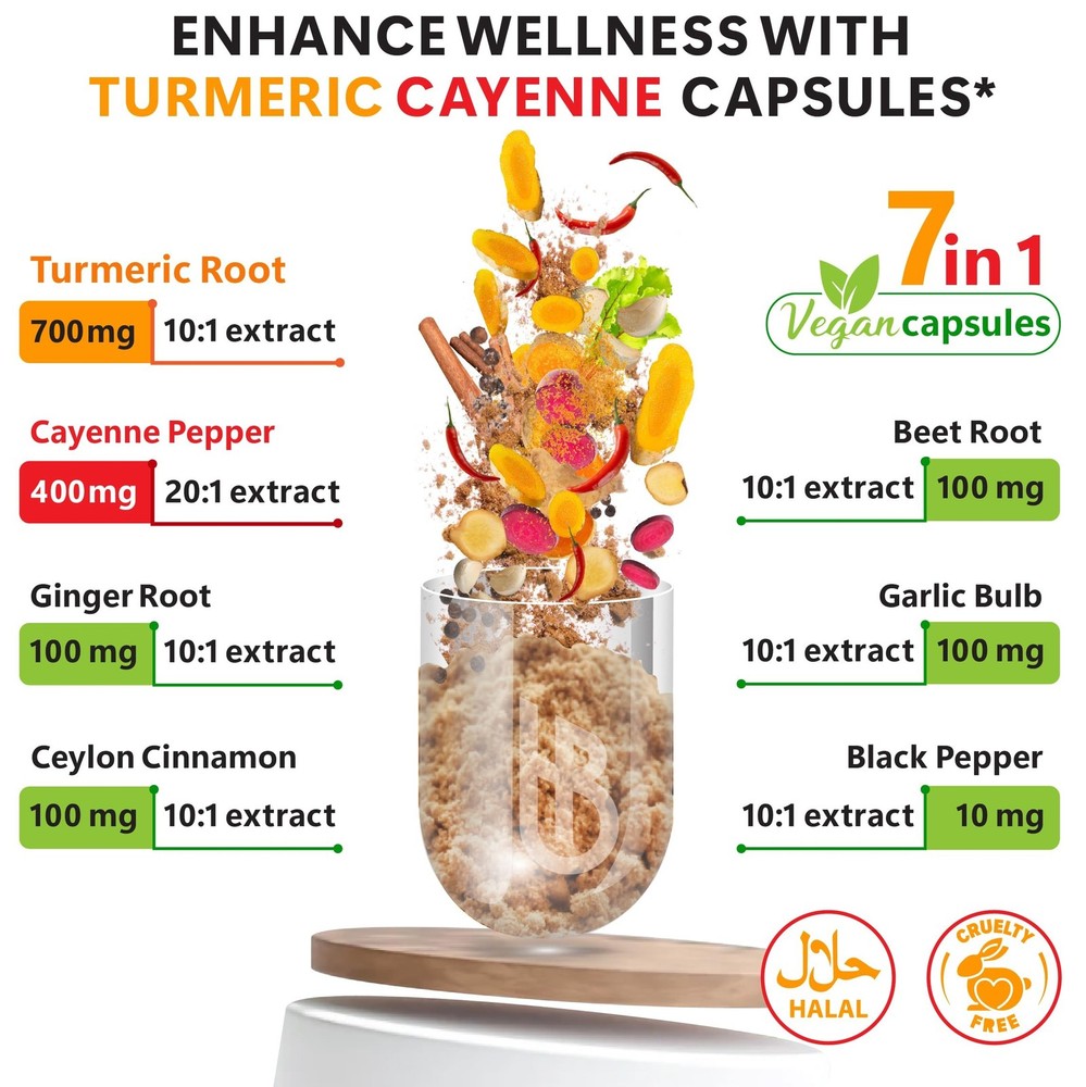 7in1 Turmeric and Cayenne Pepper Supplement - Digestion, Immune, Brain & Heart Health Support with Ceylon, Ginger, Garlic, Beetroot - 2Pack60 - Buy Now with Fast Shipping! 7in1 Turmeric and Cayenne Pepper Supplement - Digestion, Immune, Brain & Heart Health Support with Ceylon, Ginger, Garlic, Beetroot - 2Pack60 Product Details Brand: Herbpy Item Form: Capsule Manufacturer: HERBPY Item Package Quantity: 2 Package Information: Jar Package Dimensions : 5.43 x 5.12 x 2.56 inches; 7.05 ounces Date First Available : February 26, 2024 Manufacturer : HERBPY Country of Origin : India Best Sellers Rank: #80,349 in Health & Household (See Top 100 in Health & Household) #318 in Turmeric Herbal Supplements #318 in Turmeric Herbal Supplements Customer Reviews: 4.5 4.5 out of 5 stars 106 ratings Key Features ✅ 7-Herb Powerhouse: Turmeric & Cayenne Pepper with cinnamon, ginger root, beet root, garlic and black peppermade from pure herbs, gluten-free, non-GMO for premium natural health. Turmeric root supports digestion, vitality, and overall well-being.* Gifts from nature.* ✅ Digestive & Heart Health Support: Made from pure turmeric curcumin and cayenne pepper powder, this turmeric supplement naturally supports digestion and heart health with ginger and black pepper. Turmeric capsules support immunity for daily wellness.* ✅ Vegan-Friendly: Turmeric with black pepper supplement offers 60 quick-release turmeric pills in a 2-pack. Two turmeric curcumin with black pepper pills daily support natural health with a potent blend of turmeric extract, cayenne supplement, and more.* ✅ Expiration & Dosage: Turmeric and ginger supplement, encased in vegetable cellulose capsules, 2-year expiration. We recommend a serving of 2 turmeric curcumin supplement capsules daily, supplying a potent blend of 7 herbal ingredients, rigorously tested for purity and safety.* Product Description