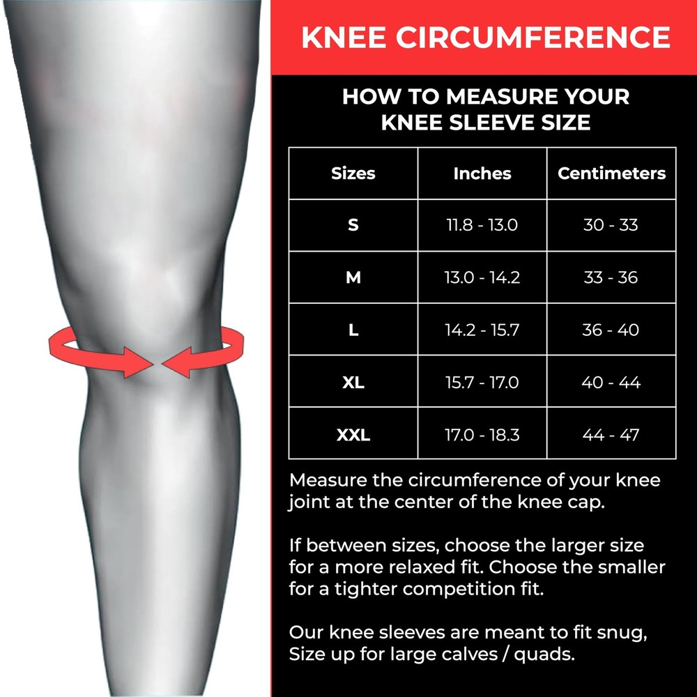 Comfort & durability meet power, safety & performance in the flexible design of our weightlifter knee sleeves. Featuring a single seam up the back & double reinforced seams at the top & bottom, these stretchy knee guards empower you to lift, lunge & squat without limits. They’re well-built, solid, strong & sturdy.WARM KNEES = BETTER AGILITY Don’t let stiff or wobbly knees hold you back! Have the confidence to maximize gains & reach your goals without worrying about stiffness setting in. The thermal properties of neoprene retain body heat to keep joints loose & limber, while a tight compression provides stability to prevent knee injuries.ALL THE COVERAGE YOU NEEDAvoid the embarrassment of constant adjustments! Longer than others, these extra long knee sleeves apply stabilizing support – no matter how intense your workout gets. Their extended 11" length supplies full coverage from mid-thigh to just above the calf, ensuring they won’t slip or budge bit.LIFT HEAVY, LIFT SMART, LIFT SAFEPump up your performance with supportive knee protector sleeves that comfort & cushion the knees without cramping your style. Whether you're squatting deep, lifting heavy or tackling a tough WOD, our precision fit knee sleeves are just the gym essentials you need to unleash your inner beast.PERFECT FIT FOR EVERY ATHLETE Available in small, medium, large, & extra-large unisex sizes for males & females, our sleeves make great weightlifter gifts for him or her! Please refer to our visual size chart to make sure you order the correct sizing. If your knees measure between sizes, we recommend sizing down for a tighter fit.By offering hassle-free returns & world-class , we at couldn’t be more dedicated to the satisfaction & happiness of our customers. If you’re not 100% happy, please reach out so we can make things right. Go on & snap to it. Click ADD TO CART to order your knee sleeve pair! MORE POWER, LESS PAIN: Designed to assist in knee pain , aid in recovery & reduce the risk of injury, our 7mm knee sleeves deliver tight compression to warm, stabilize & protect knee joints without restricting movement. Tougher than usual, they’re the perfect knee sleeves for squats, strongman competitions, Crossfit, deadlifts, power cleans & more. FIT & SIZING NOTE: Sleeves are designed for a snug, performance fit. If between sizes or if you have large calves/quads, choose the larger size. Snugness is normal and provides proper joint support. THICK, SNUG & DURABLE: Strong knee sleeves with just the right amount of stretch, brute strength & cushioning, these knee joint supports are made from 7mm neoprene that has been put through the wringer to ensure it holds up under pressure. Stronger & more secure than knee wraps, our knee compression sleeves stay put to keep you at the top of your game. HEAVY LIFTER APPROVED: IPL, USPA & IWF compliant, our neoprene knee sleeves are preferred by bodybuilders, weightlifters & fitness competitors alike. Use the compressive knee sleeves as knee protection MMA gear, weightlifting knee sleeves, powerlifting knee sleeves, bodybuilding knee sleeves or leg brace undersleeves to cover & guard your knees. COMFORTABLE TO WEAR: Our black knee sleeves for men & women are available in S, M, L or XL. Each order includes 1 PAIR, for each knee. The single seam construction & 11" length offer bodybuilders & powerlifters the freedom to flex, extend & perform at their best. No bull. No rolling. No busted seams. Trusted pick for body building & power lifting. ESSENTIAL FOR LEG DAY: Must have leg day gym accessories for weight lifting & training, these knee sleeves comfortably support every lift, squat, press, lunge, jump or deadlift. No pinching, bunching or discomfort. Lift longer, push harder. Stay ready to conquer whatever challenge comes your way with professional gym equipment by .
