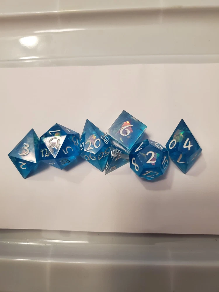 7pcs Set Of Handmade Resin Polyhedral DnD Gaming Dice: sea swirled dice with holographic confetti and metallic bright white colored numbers painted on visibly making the dice perfect for gaming of any sort. Properly weighted for play and obviously beautiful for display. Great gift for any DnD gamer or collector. Comes with a storage bag that's also great for transportation for those game nights at friend's houses!