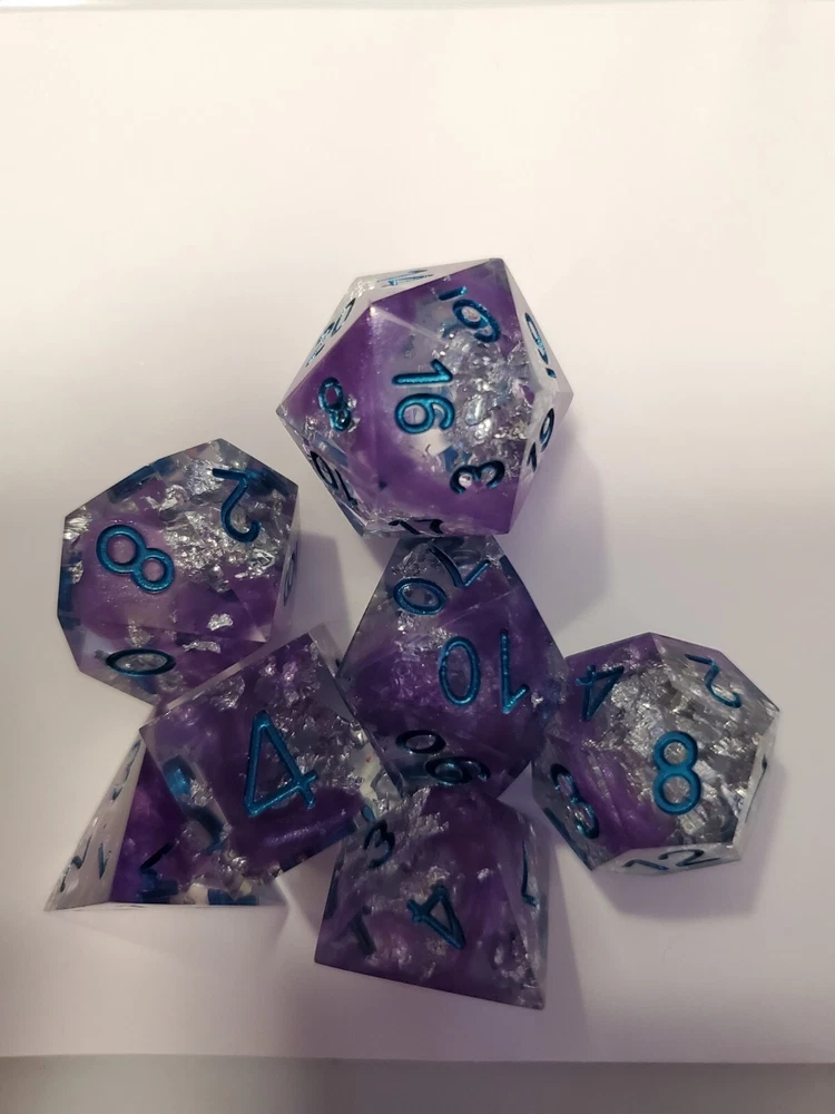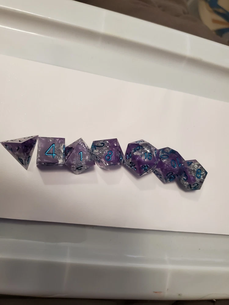 7pcs Set Of Handmade Resin Polyhedral DnD Gaming Dice: purple dice with an gritty and fun crunchy metal inlay. Bright blue metallic numbers painted on visibly making the dice look gorgeous and pulled from a mine. Properly weighted for play and obviously beautiful for display. Great gift for any DnD gamer or collector. Comes with a storage bag that's also great for transportation for those game nights at friend's houses!!