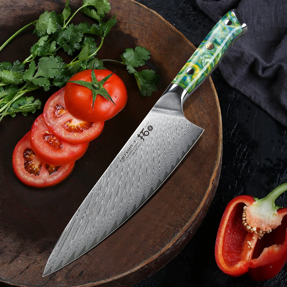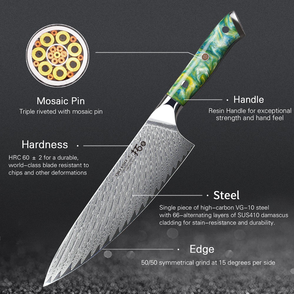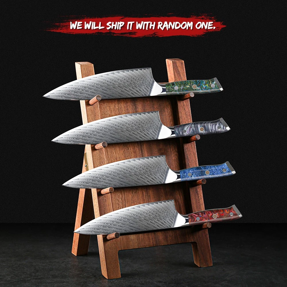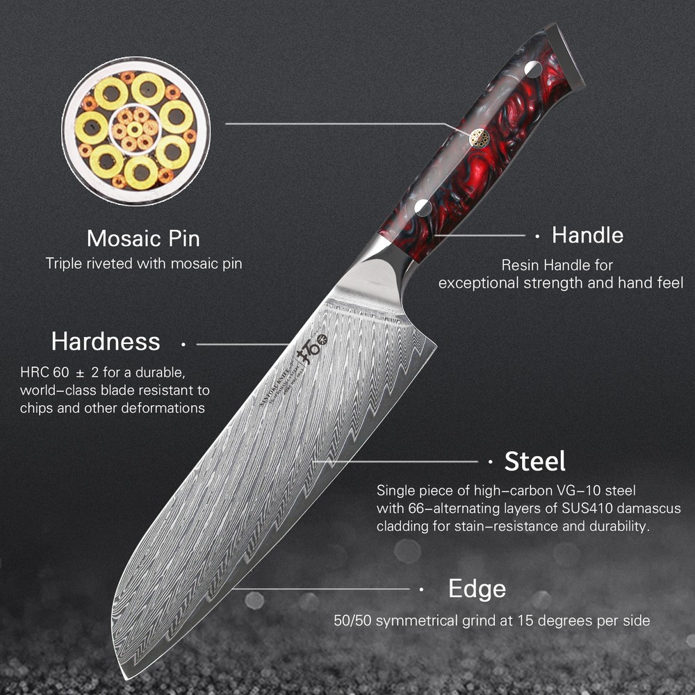 Handle Material: Resin Handle, Red G10 Handle gtin13: Does not apply Food Compatibility: Universal Brand: TURWHO Blade Length: 3.5in, 7in, 8in, 8in, 8in Set Includes: Knife Set Number of Items in Set: 7 Bundle Description: 5x Knife, 1x Kitchen Shears, 1x Knife Block In Gift Box Block Holder Material: Acacia Wood Making Method: Hot Air Color: Random Blade Edge: Straight Custom Bundle: Yes Material: Japanese VG10 Damascus Steel Room: Kitchen Type: Knife Set Manufacturer Warranty: Lifetime Features: Well Balance, Knife Block & Shears Included UPC: Does not apply Cutting edge: 15 degrees MPN: USHHG528