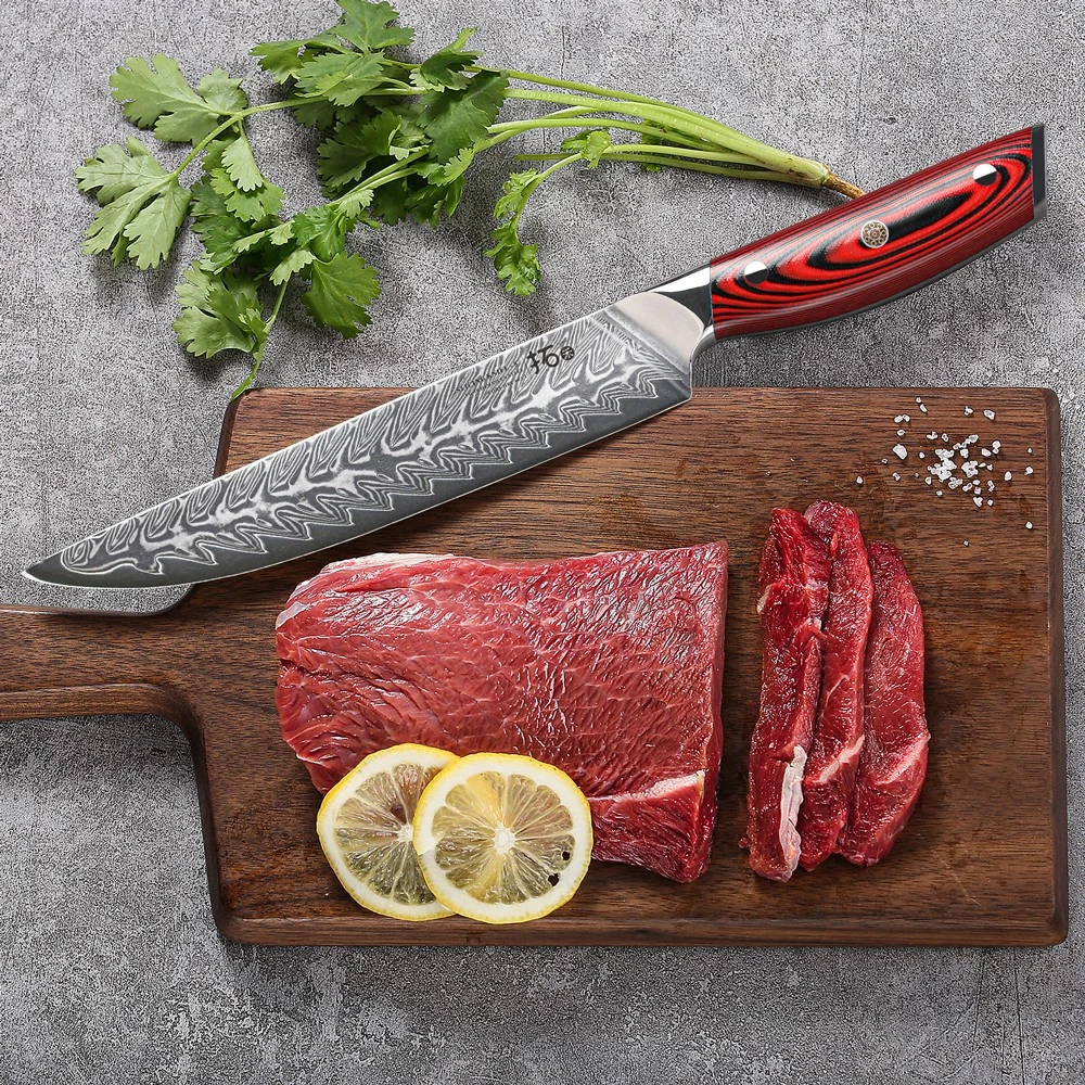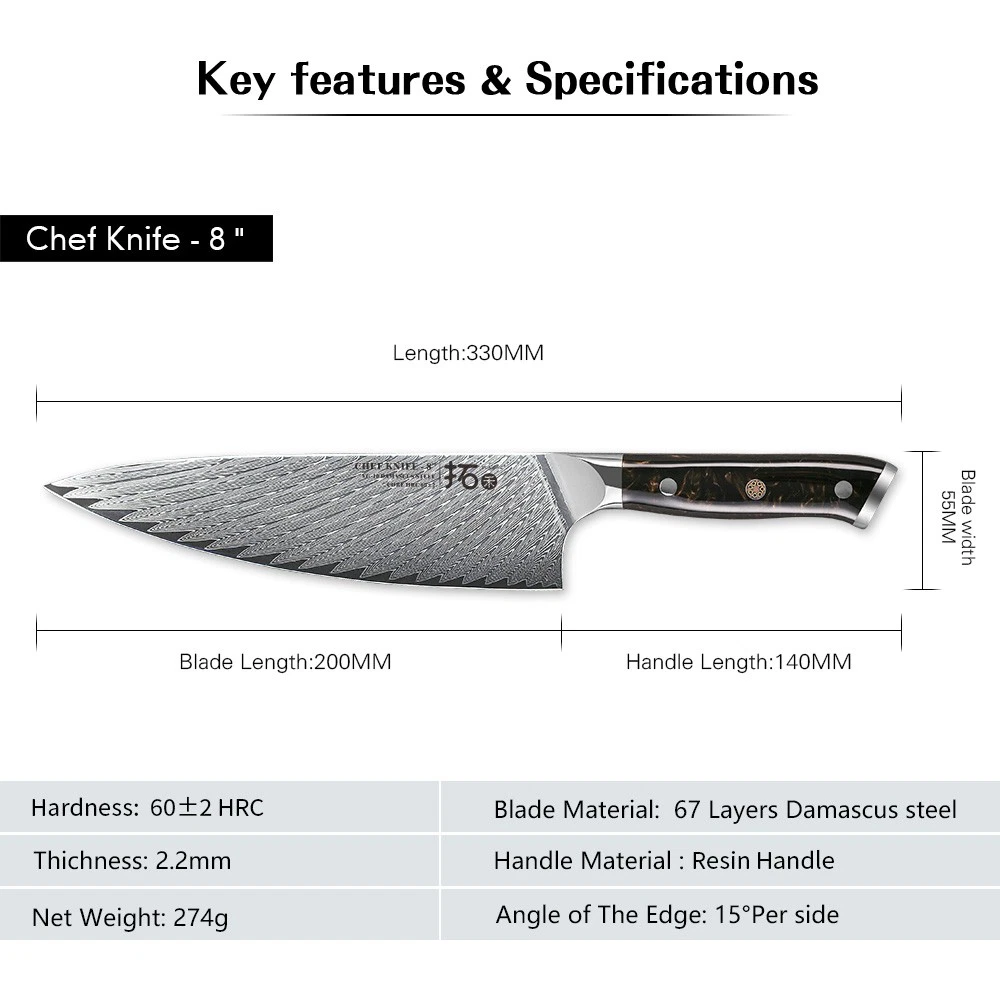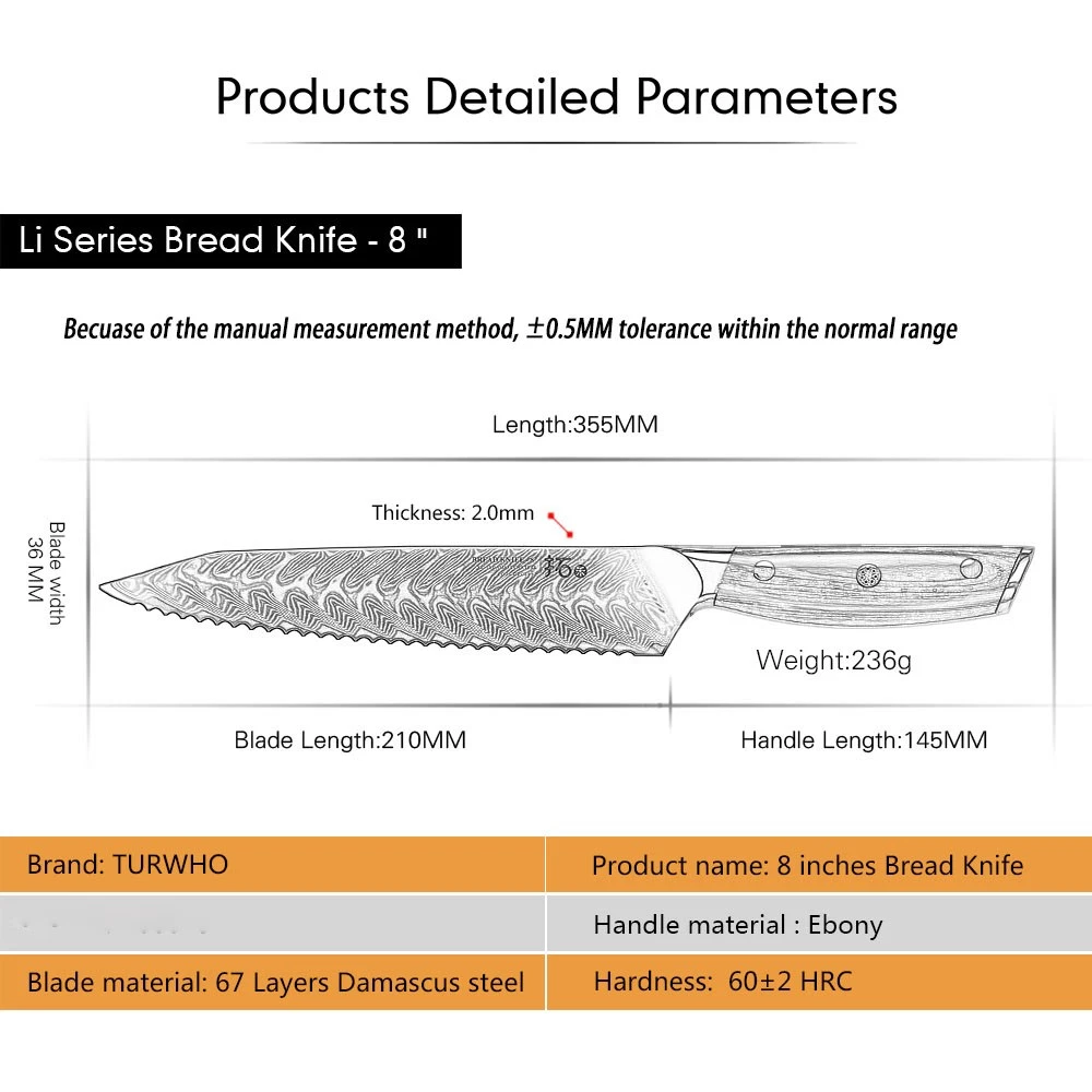 Feature: This kitchen knife set are made of high quality Japanese 67-layer Damascus steel and treated with 60HRC vacuum heat treatment and liquid nitrogen cooling. The Rockwell hardness of the cutting core is 60+. The cutting edge is 15 degrees, which means the blade is super sharp. Compared with similar products at this price, it has outstanding performance advantages.Exquisite appearance: beautiful and impressive pattern. Every time you pick it up, you can't help but taking cooking seriously. AND remember? Serious men are always handsome. Then don’t forget to wipe your chef knife after using, to make a perfect finish to your cooking.The chef Knife are one of the most useful and versatile designs available, which you can use to chop... DAMASCUS KNIVES 7x TURWHO Kitchen Knife Set Japanese VG10 Damascus Steel Chef Cook Slicing Knife Feature: This kitchen knife set are made of high quality Japanese 67-layer Damascus steel and treated with 60HRC vacuum heat treatment and liquid nitrogen cooling. The Rockwell hardness of the cutting core is 60+. The cutting edge is 15 degrees, which means the blade is super sharp. Compared with similar products at this price, it has outstanding performance advantages. Exquisite appearance: beautiful and impressive pattern. Every time you pick it up, you can't help but taking cooking seriously. AND remember? Serious men are always handsome. Then don’t forget to wipe your chef knife after using, to make a perfect finish to your cooking. The chef Knife are one of the most useful and versatile designs available, which you can use to chop, slice, dice and mince all types of vegetables, fruits, meats, bread and fish. This chef knife will be your most valuable player, no matter what type you pick. So choosing an excellent chef knife is especially important. Design Characteristics: The optimal size and weight own a best balance.The shade of handle is designed based on the human engineering. This can lessen your tiredness, numbness, and soreness even if you grasp it for a long time. EASY CARE:All knives store safely In the acacia wood knife block. Simple appearance can decorate your kitchen without taking up space and reduce knife contact with air and risk of rusting.It is indispensable gift for Christmas parties. Specification: Brand: TURWHO Blade Material: Japanese VG10 67-layer Damascus Steel Handle Material: Resin Handle, G10 Handle, Ebony Handle Handle Color: Black, Red Cutting edge: 15 degrees Food Compatibility: Universal Manufacturer Warranty: Lifetime Weight: 4.89KG (including box) Package included: 1x TURWHO 3.5-inch Paring Knife With Red G10 Handle 1x TURWHO 6.5-inch Boning Knife With Ebony handle 1x TURWHO 8-inch Slicing knife With Red G10 Handle 1x TURWHO 8-inch Chef knife with Black Resin handle 1x TURWHO 8-inch Bread Knife With Ebony handle 1x TURWHO Multi-Purpose Kitchen Scissors 1x TURWHO Acacia Wood Storage Block Holder 1x TURWHO Premium Package Gift Box 1x TURWHO Cleaning Cloth 1x TURWHO Operation Instructions Item Specifics Brand TURWHO Set Includes Chef's Knife Type Chef's Knife Food Compatibility Universal Material Japanese VG10 Damascus Steel Cutting edge 15 degrees Color Multicolor MPN 113162126-7P Blade Edge Straight Handle Material Resin Handle, Red G10 Handle, Ebony Handle Features Well Balance, Damascus Steel, Very Sharp Number of Items in Set 7 Custom Bundle Yes Manufacturer Warranty Lifetime Bundle Description 5x Knife, 1x Kitchen Shears, 1x Knife Block In Gift Box Making Method Hot Air Room Kitchen Blade Length 3.5in, 6.5in, 8in, 8in, 8in Block Holder Material Acacia Wood Payment All purchases will go through eBay secured checkout to ensure that your order is processed without any delays. After you have made your purchase you can either click on 'Pay now' or follow the instructions in an automated email that you will receive shortly after your purchase. During the checkout, you can make an immediate payment by PayPal account, MasterCard, Visa or select an alternative method of payment, and receive the necessary payment details. Please note: If you have already marked payment as sent But actually not paid, then you MUST mark as payment not sent otherwise the PAY NOW button will not be available. Shipping 1.all orders will be Dispatched within 2 working days after payment. 2.orders are not processed on weekends or public holidays. 3.usually takes 3-6 business days to most US destinations. 4.Your patience would be much appreciated. 5.all items will be checked carefully and packaging well before send out. 6.All orders are including the tracking number. Any questions, please feel free to contact us. Returns Refund or replacement request is available only the requests within 60 days after parcel received & return the item as the same condition as received. Please contact us to request a return authorization. Your name, auction number, and reason for return should be included in the email. All items returned must contain all original packaging materials. Please repack the item carefully. Item returned will be tested and a new replacement will be shipped to the buyer immediately when found defective. In the event that a suitable replacement is not available then a refund will be issued. If the item is found non-defective and buyer just don't like it, we will still make you a full refund, but the return shipping fee at buyer's expense. All item return must have a RMA number, Please contact us to request a return detail address and the RMA number, this can help us identify return items accurate. Buyer is responsible for additional shipping costs for items that are returned refused or undeliverable. We do not accept any returns without an authorization number on the box or label it is being returned in. Contact Us We care about our valued buyers, if you have any questions, our Customer Service will be very glad to help you. For more information, please contact us through ebay message system. All questions would be answered within 48 hours. DAM