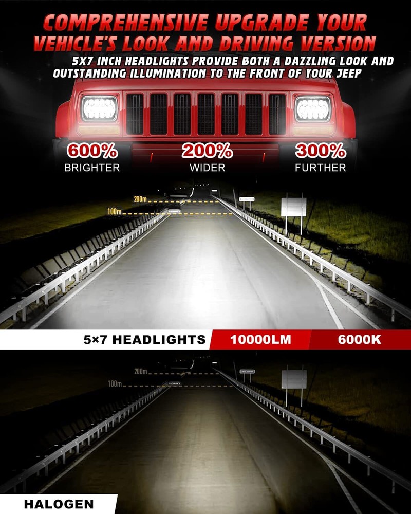Package Included: 2 x 16-LEDs Tail Lights for Jeep Wrangler 2 x 5x7" 7x6" LED Headlights Fitment: Fit for Jeep Wrangler YJ 1987-1995 7x6" Headlight Specification: Product name : LED Headlight Material : Aluminum alloy housing, PC lens Housing color : Black Voltage : 12-24V Power : H/55W,L/30W Lumen : H/8250LM,L/4500LM Color Temperature : 6000K Waterproof : IP68 Beam Type : Running light / turning light / high beam / low beam Working temperature : -20°to 40° Lifespan : 50,000 hours Plug type : H4 Size : 19.5cm/7.68" x 14.1cm/5.55" ( L x W ) Tail Light Specification: Name: tail light Voltage: 12V Light source: 16LEDs 4 light modes: reverse light, tail light, brake light, turn light(Both lights flashing yellow at the same time indicate hazard light) Light color: white light, red light, amber light Location: rear Lens color: smoke black Note: 1. Due to manual measurements and slight color variations, please allow 1-3 cm (0.4-1.18 inches) difference to suit different display settings. 2. Due to the light and screen difference, the item\'s color may be slightly different from the pictures. Please understand.