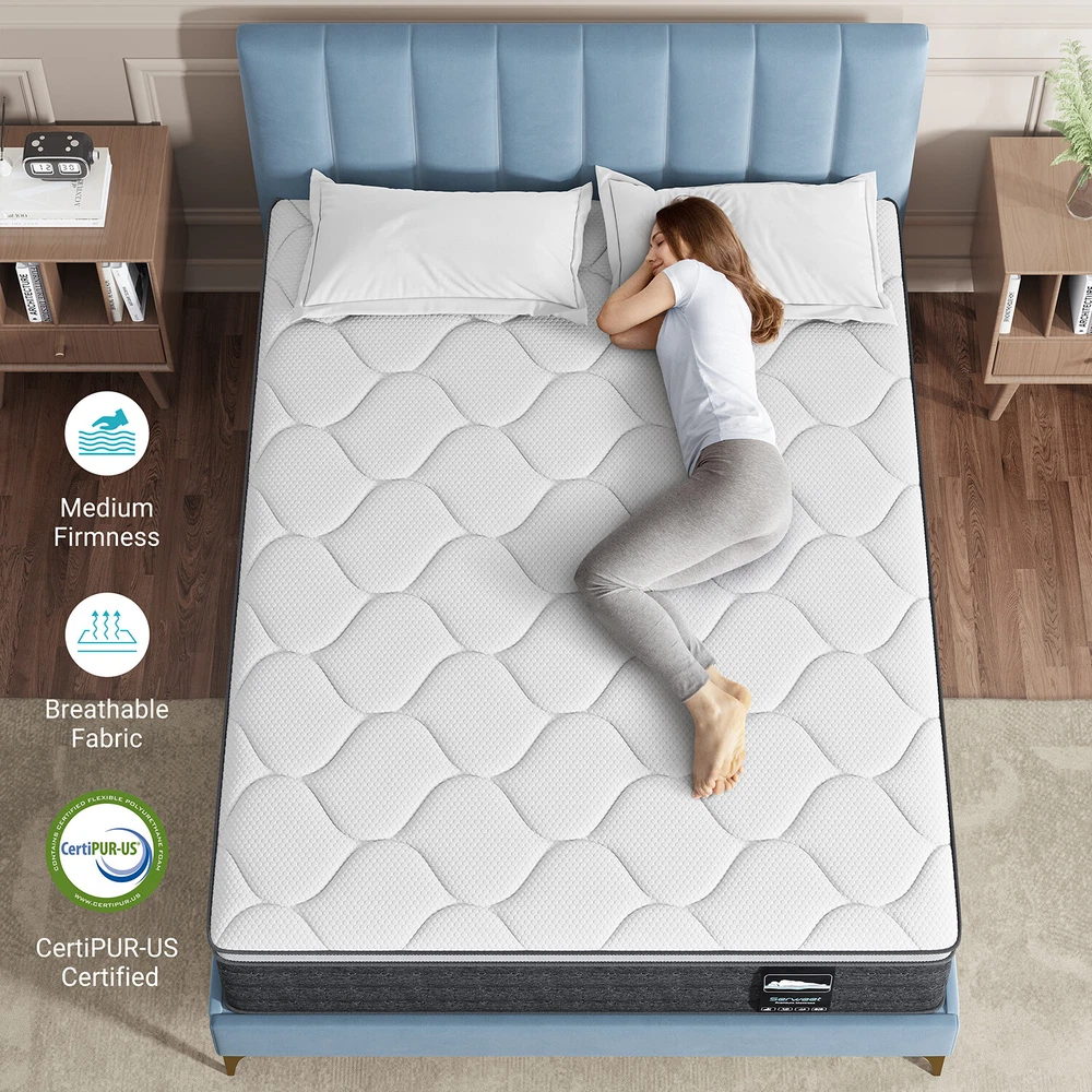 Description: POCKETED SPRING & BREATHABLE AND SOFT FABRICS -Engineered with heavier gauge steel independent pocket innersprings for added stability and medium firmness. With soft comfort foam and quilted jacquard cover offer a medium firm feel. The knitted top cover made with fiberglass-free and skin-friendly fabrics adapt to the environment dispersing body heat as well as releasing moisture, keep the mattress surface temperature. Ideal for plus-sized individuals and those who enjoy medium firm mattress. 5-ZONE & POCKETED SPRING & EDGE SUPPORT – 5-zone pocket springs targeted support for head, shoulder, back, waist, hips, legs and feet. Slept in ergonomic alignment with all-night comfort. An independent coil system base layer encased with foam edge support resists motion transfer from a sleeping partner, promotes customized spinal alignment and joint pain relief. The premium tempered steel coils makes the mattress bouncy yet supportive, supports a greatest weight of more than 500 lbs. CERTIPUR US CERTIFIED & PRESSURE RELIEVING - Highest quality foam is CertiPUR-US Certified for durability, performance, and content. 2 foam layers for optimal softness and support. Provide cushioning and serve as protective buffer, relieve painful pressure points on the body. Ideal for stomach sleepers and those who suffer from back and neck pains. MADE IN CENTURY-OLD BRAND FACTORY OF NORTH AMERICA FOAM AND GLOBAL MATERIAL - Innovative performance in every layer, manufactured right here. Our R&D Center located in South Carolina of USA. Customized according to North American customer standards. Straight out of our first ever, state-of-the-art, global production technology and facility in North American. EXPERTLY PACKAGED AND GENERAL NOTE - Serweet mattress is efficiently compressed into a box that’s shipped right to your door, simply unbox, unroll and the mattress does the rest, expanding to its original shape within 72 hours. 30 hassle-free night trial, 30-Days Money Back and worry-free 10 year limited warranty included. Please don't hesitate to contact us if there is any question, we will reply to you within 24 hours. Specification: Feature: Pressure Relief Item Firmness Description: Medium Fill Material: Memory Foam Brand: Serweet Product Dimensions: 75"L x 54"W x 12"Th Top Style: Euro Top Color: White, Grey Coil Type: Pocketed Coil Age Range: Adult Packing list: 1x Serweet Mattress Soft, body-hugging foam makes you feel like sleeping on a cloud. High-elastic support sponge ensures the mattress will not collapse after a long use. These springs feature excellent elasticity to offer target support, while working independently without squeaking. Minimal transfer motion from or to your sleeping partner. A soft-to-touch plush cover keeps you cozy and cool. Breathable fabrics on the back and side ensures excellent airflow.