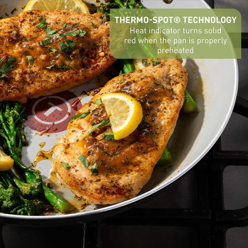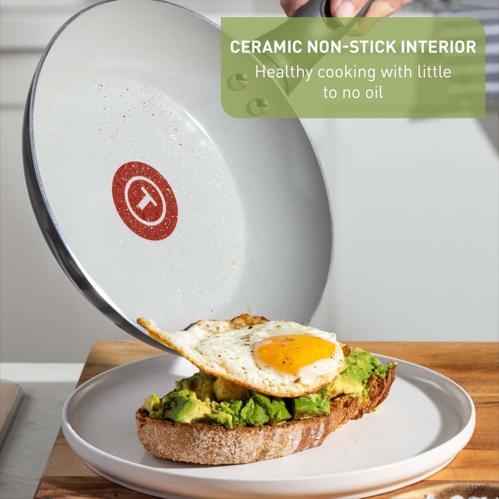 Add a touch of color and style to your kitchen our with T-fal Healthy Chef Ceramic cookware line, crafted with 100% recycled aluminum body and a ceramic non-stick interior for healthy and delicious meals. Featuring Thermo-Spot Technology, even heat base and comfortable handles to make cooking a breeze. 8 and 10.5" Easy Care Ceramic Nonstick Frypan, Set of 2 Healthy cooking with reduced eco impact: Crafted with 100% recycled aluminum body and a ceramic nonstick interior, allowing you to prepare nutritious meals with little or no oil Includes two versatile frypans: 8 inch and 10.5 inch, perfect for browning, searing, and pan-frying a variety of foods including eggs, vegetables, and meats Thermo-Spot Technology®: Unique heat indicator turns solid red when the pans are properly pre-heated, ensuring optimal cooking results without hot spots Stylish and practical design: Adds a touch of color to your kitchen with comfortable handles for a sturdy and secure grip Effortless cooking and easy cleanup: Compatible with all cooktops except induction, oven safe up to 350°F, and recommended for hand washing
