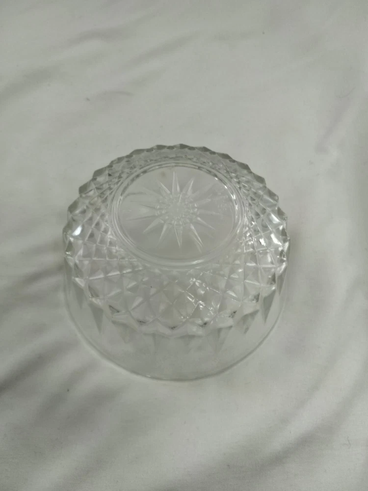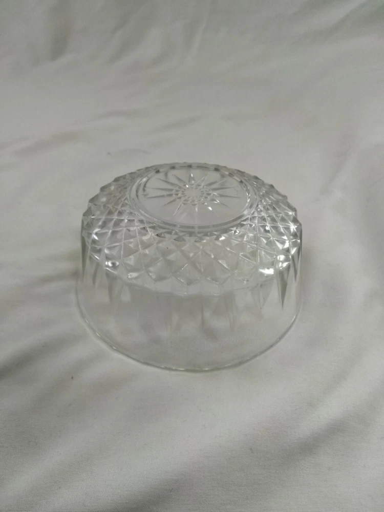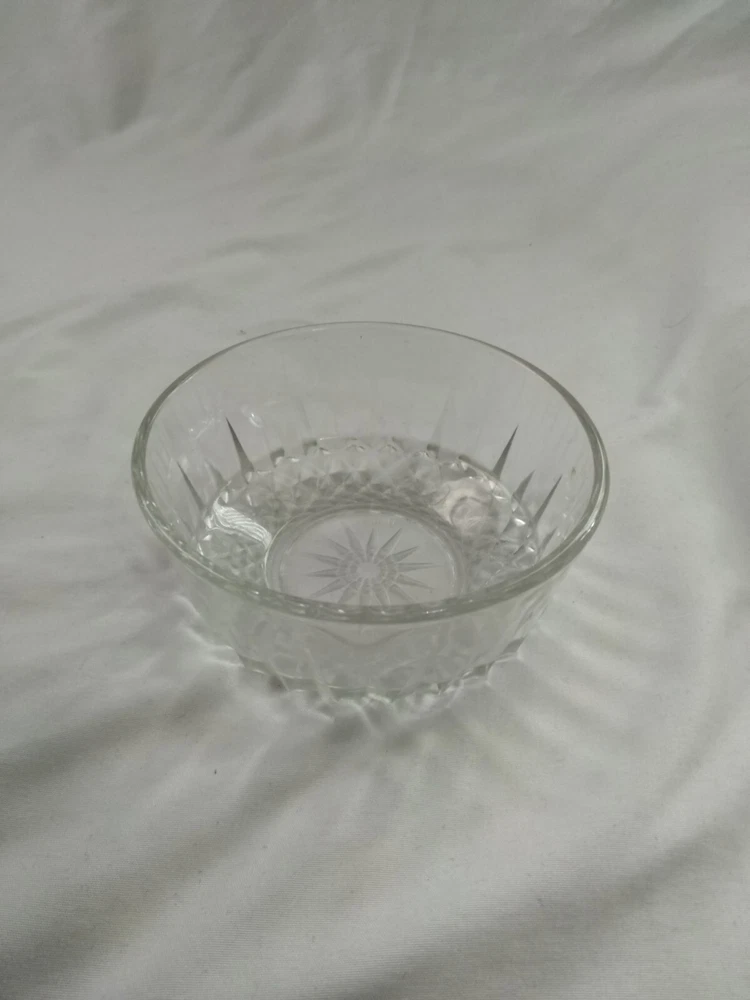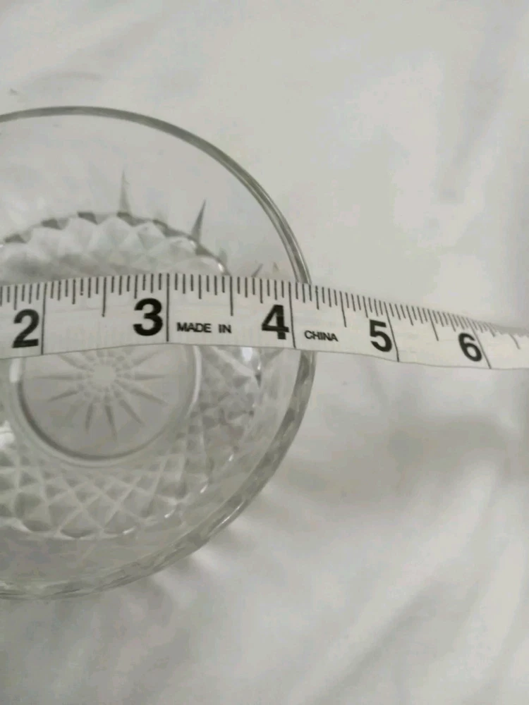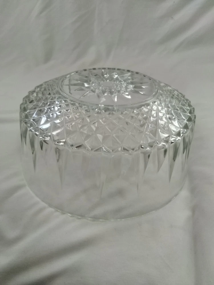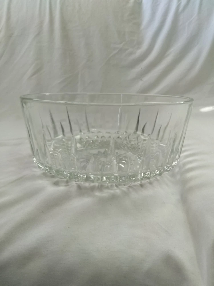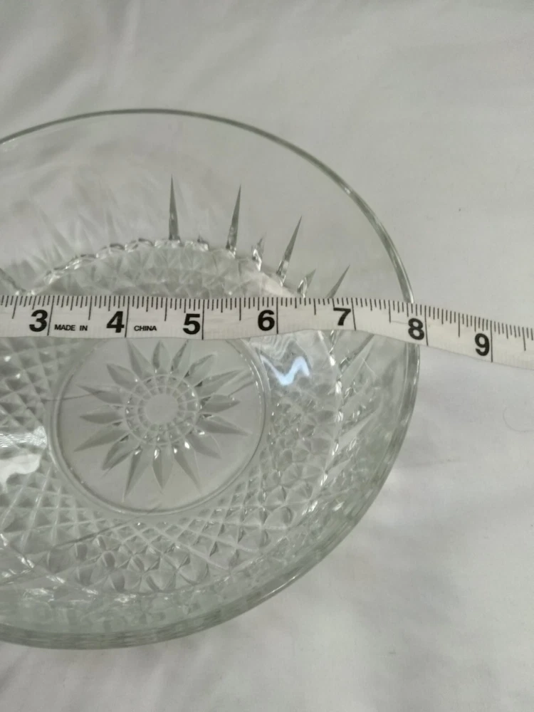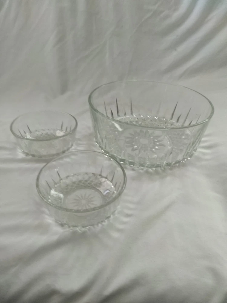 Set of 3 decorative clear glass bowls with starburst and diamond pattern. The only Hallmark I am able to identify is U.S.A on bottom Large serving bowl is 8 inches across top and two smaller fruit bowls are 4" across Very nice