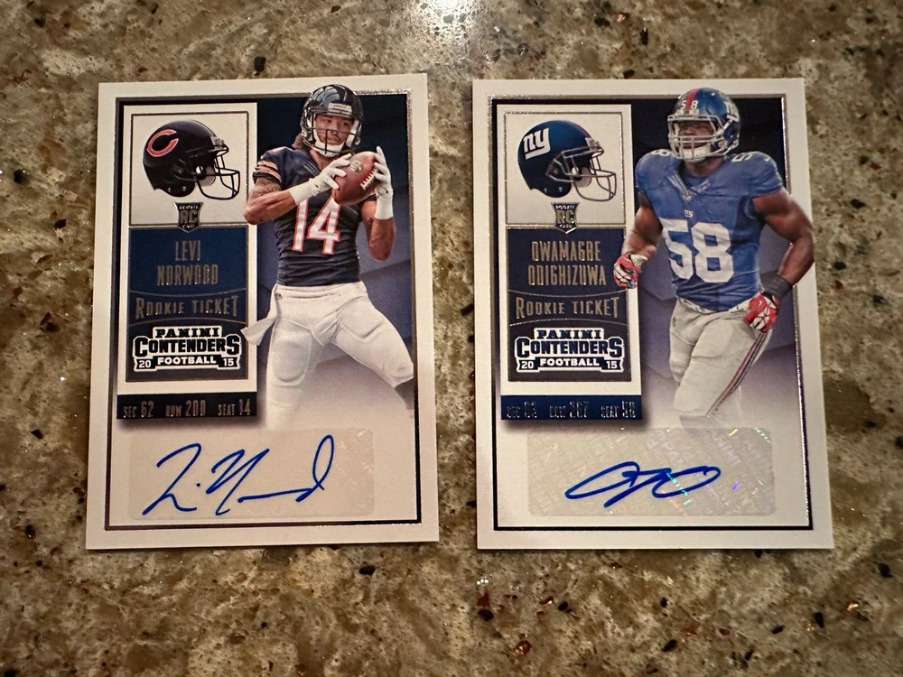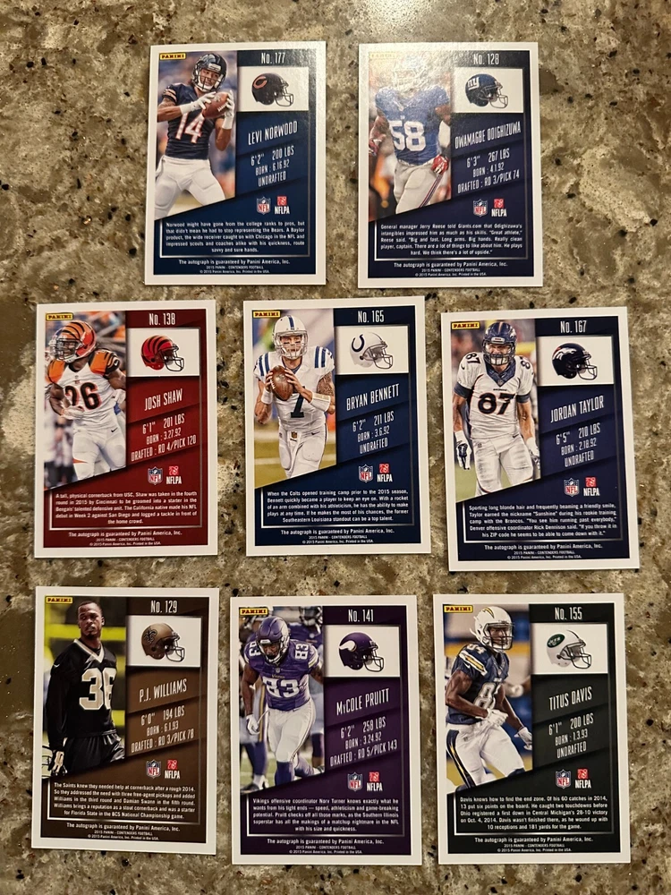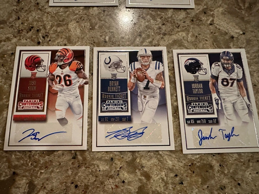 8 Card Lot 2015 Panini Contenders Rookie Ticket Autograph NFL 1 2015 Panini Contenders Rookie Ticket Autograph Bryan Bennett Card #165 - Indianapolis Colts 1 2015 Panini Contenders Rookie Ticket Autograph Josh Shaw Card #138 - Cincinnati Bengals 1 2015 Panini Contenders Rookie Ticket Autograph Owamagde Odighizuwa Card #128 - New York Giants 1 2015 Panini Contenders Rookie Ticket Autograph Levi Norwood Card #177 - Chicago Bears 1 2015 Panini Contenders Rookie Ticket Autograph Jordan Taylor Card #167 - Denver Broncos 1 2015 Panini Contenders Rookie Ticket Autograph PJ Williams Card #129 - New Orleans Saints 1 2015 Panini Contenders Rookie Ticket Autograph MyCole Pruitt Card #141 - Minnesota Vikings 1 2015 Panini Contenders Rookie Ticket Autograph Titus Davis Card #155 - New York Jets