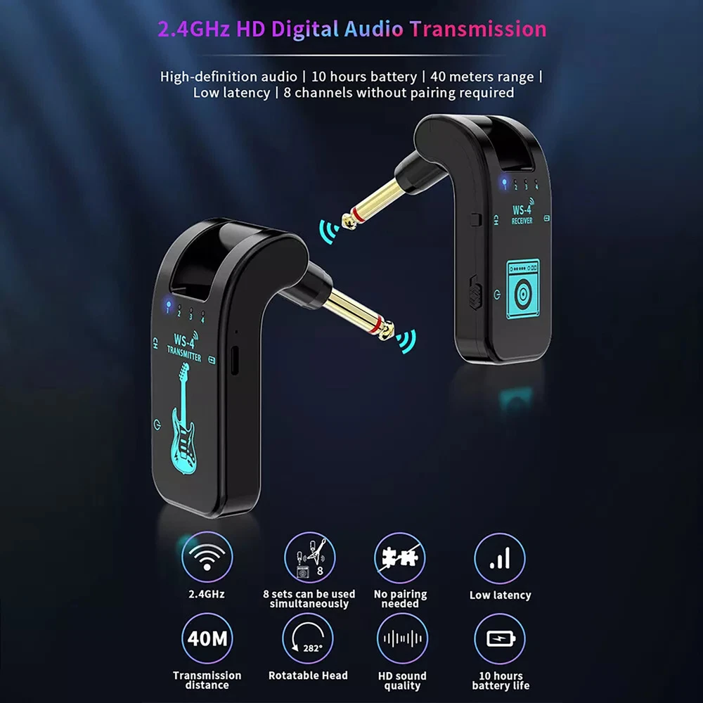 Product Description Features: This 2.4G wireless guitar transmitter and receiver system boasts a large capacity battery that provides up to 10 hours of continuous use. It comes with charging cable, allowing both the transmitter and receiver to be charged simultaneously. It only takes 2 hours to fully charge. With 2.4G high-definition sound quality and 48K/16bit concert-grade audio, this system offers all-digital, high-frequency interference-resistant, high-definition audio transmission. It guarantees pure and authentic sound quality, making your performance sound its best. The system features a 282-degree rotatable head, making it easy to use with different guitars and a wide variety of instruments. It requires no pairing - simply switch to the same channel on the transmitter and receiver. This system offers a transmission distance of up to 40 meters, and can even transmit through walls up to 20 meters away. It's completely free from the limitations of wired connections, giving you the freedom to move around on stage. With 8 channels to choose from and the ability to support 8 devices at the same time, this system is incredibly versatile. It features a 6.35mm audio plug, compatible with all 6.35mm jack electric instruments. The true gold-plating technology ensures continuous, stable, and high-fidelity transmission. It's suitable for a wide range of electronic instruments, including electric guitars, electronic drums, electric basses, electronic wind instruments, digital pianos, synthesizers, and more. Specifications: Sample Rate: 48K/16bit high definition transmission Transmission Band: 2.4GHz ISM Transmission Distance: 40m/131ft outdoors and 20m/66ft through walls Transmission Latency: 12ms THD+Noise: -98dB THD: <0.02% Dynamic Range: >105dB Frequency Response: 20-20KHz; +1dB/-3dB Rotation Angle: 282 º Supported Device Groups: 8 at the same time Transmission/Receiver Battery Capacity: 480mAh Color: Black Note: The real color of the item may be slightly different from the pictures shown on website caused by many factors such as brightness of your monitor and light brightness. Please allow slight manual measurement deviation for the data. Package includes: 1 x Transmitter 1 x Receiver 1 x USB Cable 1 x User Manual If you have any doubts or uncertainty about this item, contact us with no hesitation, we are always here and will solve your problems. Thanks and wish you a nice day! About Us We dedicated to provide excellent products and services for all customers on ebay. hope we all can have a nice experiences on eBay. Payment We accept all verified payment through PAYPAL payment. Shipping Usually, Item will be shipped within 1-2 working day after full payment is received. Normally, you will receive the item in 5-7 days. Please contact us if you don’t receive the items after 10 working days after the payment If you have any questions about shipping, please feel free to contact us. Returns Always believe we can solve problems by communication if it comes to any problems about products or any others. If it comes to a return, the products must be intact and as original when you received, and should be within 30 days after you received it. Contact Us Work time: 9:00 AM to 18:00 PM Beijing Time You can contact us at anytime you want, we will reply all messages at the first time. powered by
