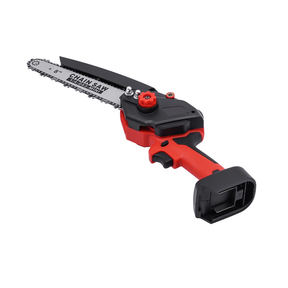 Description Using traditional axes to cut wood is inefficient and very tiring, so you can choose our mini cordless chainsaw for improving efficiency in pruning, wood cutting, and gardening. It boasts a high quality and provides a great cutting effect, all while featuring a lightweight and compact design. With a battery-powered power source, it can be conveniently used for outdoor operations, emergencies, and in locations without access to sockets. Having it will make your work easier and simpler! Key Features Long Service Life: This product consists of high-quality plastic housing and cold-rolled steel guide plate&chain with a quenching treatment, effectively reducing wear and making it high-strength, anti-rust, and durable. Self-lubrication System: After adding lubricating oil and pres ✨✨✨ Welcome to my store! Have a nice day~ ✨✨✨ Description Using traditional axes to cut wood is inefficient and very tiring, so you can choose our mini cordless chainsaw for improving efficiency in pruning, wood cutting, and gardening. It boasts a high quality and provides a great cutting effect, all while featuring a lightweight and compact design. With a battery-powered power source, it can be conveniently used for outdoor operations, emergencies, and in locations without access to sockets. Having it will make your work easier and simpler! Key Features Long Service Life : This product consists of high-quality plastic housing and cold-rolled steel guide plate&chain with a quenching treatment, effectively reducing wear and making it high-strength, anti-rust, and durable. Self-lubrication System: After adding lubricating oil and pressing the oil ball, the chain is automatically oiled when the machine is running. It can provide necessary lubrication for the chain, extend its service life, increase the safety of use, improve work efficiency, and protect the chainsaw. Moreover, the visual design facilitates the observation of oil levels. High Efficiency: Thanks to an 850W all copper brushless motor with overload protection function and 5000rpm high speed, a solid guide plate, and a high-strength quenched chain with wooden teeth design and fast chain speed(43.64ft/s), this chain saw can achieve a large cutting diameter (8") while consuming less energy, realize continuous use with less vibration and maintenance, and provide you with pruning, sawing, and logging functions, saving you time and effort. Simple Operation : With the 1.87 lbs lightweight, compact design(17.32in total length), and a detailed English&Chinese manual, you can operate the cordless chainsaw with one hand. Even the elderly and women can easily operate and control it, making cutting and trimming a pleasure. Environment-friendly : Adopting rechargeable lithium batteries as the power source without plugging in wires, this chainsaw is more environmentally friendly compared to other gasoline-powered chain saws because it does not generate gas and emissions. Excellent Heat Dissipation: The built-in cooling fan and heat-sink holes can effectively prevent the motor from burning out, making this chainsaw work more safely and stably. Convenient Storage&Carry: The detachable design, portable case, and 1.87 lbs lightweight allow for convenient and effortless storage and carrying. Its cordless design(battery-powered) makes it an excellent tool for ladder work, and you can take it with you when going outdoors. Durable Battery: The 4500mAh lithium-ion batteries with over-charge, overheat, and overload protections can provide longer battery life without frequent charging and worrying about insufficient electricity that affect your work. The equipped charger can help recharge it to save money and energy. Excellent Gift: With a fashionable style, portable design, and powerful functions, this chainsaw is an excellent gift to your husband, father, friends, etc. at Christmas, Father's Day, and birthdays, making their cutting/pruning job easier. Customer Service : We are honored that you have chosen our product. We have sufficient confidence in the quality of the product so that you can buy it confidently. But if you have any questions, you can contact our customer service, then we will provide one-on-one after-sales service. Details Safe Lock: You must press the safety lock first and then the switch to start the chain saw, avoiding miscontact and accidental injury caused by the accidental start of the machine. Protective Baffle: The protective widening baffle reduces workpiece debris splashing and protects you from injury during cutting. Ergonomic Handles: The ergonomic handle made of nylon has textured skin, gives you a comfortable grip without slipping, absorbs shock, and reduces hand fatigue even in long-time use. The auxiliary handle is easy to control to achieve a good balance and high-cutting performance. Chain Adjustment Knob: It makes the replacement and installation of the chain and the adjustment of the tightness of the chain convenient and quick by simple rotation. Application It is widely used in gardens, parks, farms, ranches, pastures, orchards, greenhouses, forests, camping, etc., and can be used for forest harvesting, wood cutting, small branch pruning, bush pruning, gardening, home woodworking, bamboo sawing, logging, DIY crafts, and so on. How to Change the Chains&Guide Plate Remove the compression nuts and screws, and remove the motherboard cover plate. Replace the chain and bar, please make sure the end of the chain is on the gear. Rotate the chain tension system to control screw alignment to the hole. Align the holes and cover the cover plate. Tighten the nut with the wrench. Rotate the chain adjustment knob to adjust the chain tension to the right tightness. Specification Color: Red, Black Material: Molten Steel, High Manganese Steel, Nylon, Copper Surface Treatment: Quenching Motor Type: Brushless All Copper Motor Power Source: Battery Powered Battery Capacity: 4500mAh Charging Time: About 6 Hours Chainsaw Voltage: 110-220V Mot