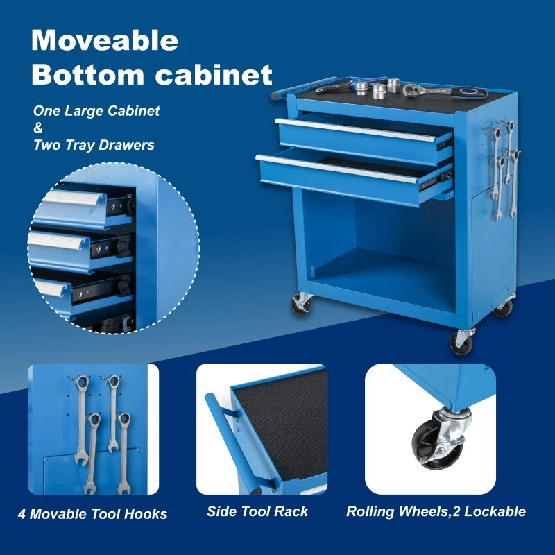 Product Features Durable All-Steel Construction: Crafted from high-quality, thickened cold-rolled steel with a triple-layer powder coating, this metal tool cabinet delivers exceptional durability and resistance against rust and corrosion, ensuring long-lasting performance for indoor and outdoor use. Spacious and Organized Storage: Featuring 8 drawers of varying sizes, including 3 small drawers and 5 large drawers, this tool cabinet offers ample storage capacity for organizing and securely storing a wide range of tools, keeping your workspace tidy and efficient. Mobile and Versatile Design: Equipped with four universal casters, two of which are lockable, this tool cabinet allows for effortless mobility and stability within your workspace. The comfortable side handle further enhances maneuverability, while the detachable top chest adds versatility, enabling you to transport or use it independently. Easy to assemble: We have assembled most of the parts. You only need to install the wheels at the bottom and the hooks on the side. P.S.: The top chest toolbox is packed in the bottom toolbox with wheels. When you receive it, please open the bottom toolbox with wheels and take out the top toolbox with drawers. Flexible Design: The detachable top and bottom sections offer versatility, enabling you to use them separately as a workbench or storage unit, perfectly adapting to your specific needs. Description
