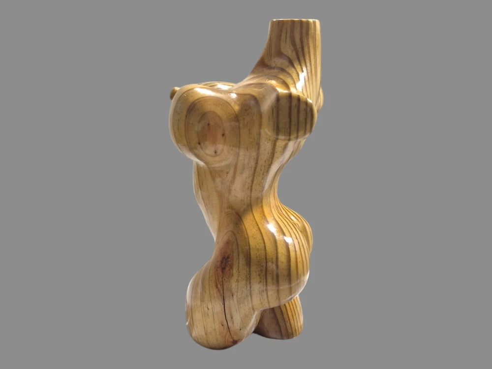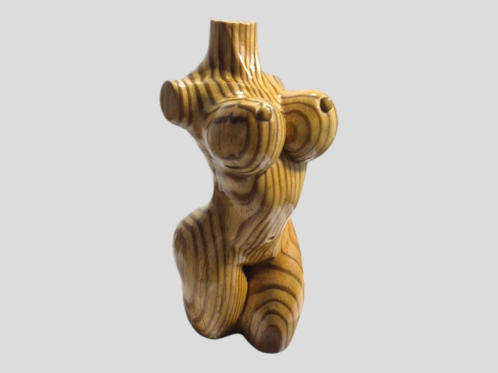 "This captivating hand-carved wooden female torso sculpture is a unique and sensual work of art. Each curve has been carefully crafted to create a realistic and elegant representation of the female body. The wood used - recycled pine - provides a warm tone and a natural texture that enhances the beauty of the sculpture. This 8" high and 4" wide piece is perfect for those looking to add a touch of erotic and contemporary art to their home."