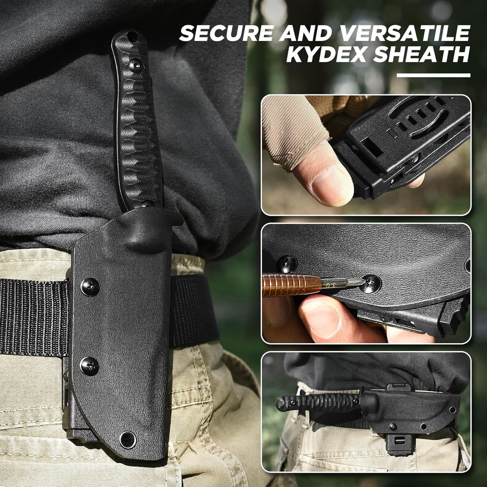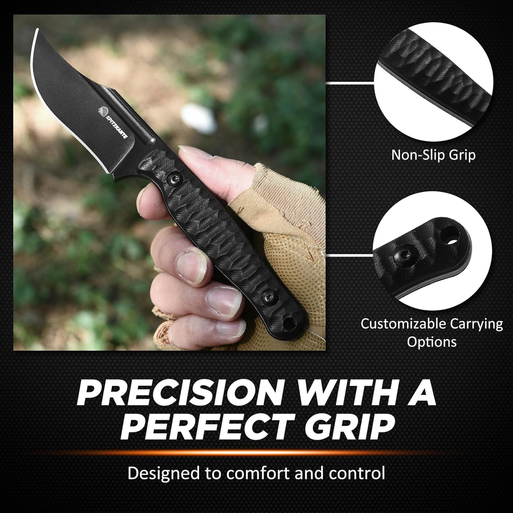 D2 Steel Blade: Crafted from high-quality D2 steel, the blade of the SPITZKANTE Fixed Blade Knife provides corrosion resistance, and durability. Designed for outdoor and tactical tasks, this blade performs reliably, whether in wilderness settings or everyday use. Full Tang Construction: This horizontal knife’s full tang design offers strength and stability, reducing the risk of breakage during tasks. Paired with a G10 handle, the full tang construction ensures a balanced, solid feel in the hand, making it a dependable tool for any challenging environment. Ergonomic G10 Handle with Non-Slip Grip: Choose a handle designed for comfort and safety. The textured ergonomic handle provides a non-slip grip that remains stable in wet or rough conditions, giving users greater control and confidence. Kydex Sheath with Horizontal Carry: The included Kydex sheath is designed for secure horizontal carry, keeping your edc fixed blade knife safe when not in use. Its durable construction protects the blade while allowing access, making it ideal for both tactical use and outdoor exploration. Versatile Outdoor and Tactical Tool: Ideal for survivalists, campers, hunters, and EDC enthusiasts, the SPITZKANTE tactical fixed blade knife with sheath is suited to a variety of tasks. From preparing firewood, this knife’s versatility and reliability make it a must-have for anyone who values gear. Product Description SPITZKANTE Knives Add to Cart Add to Cart Add to Cart Add to Cart Add to Cart Customer Reviews 4.5 out of 5 stars 27 — 4.2 out of 5 stars 4 4.5 out of 5 stars 2 4.7 out of 5 stars 4 3.7 out of 5 stars 14 4.1 out of 5 stars 45 Price $33.99 $ 33 . 99 — $35.99 $ 35 . 99 $22.99 $ 22 . 99 — $19.99 $ 19 . 99 $12.99 $ 12 . 99 Blade Material D2 Steel D2 Steel D2 Steel 5Cr14MoV Stainless Steel D2 Steel D2 Steel 5Cr14MoV Stainless Steel Whole Length 20.3 cm/ 7.99" 20.3 cm / 7.99" 17.6 cm / 6.92" 16.5 cm / 6.49" 21.2 cm / 8.35" 20.1 cm / 7.91" 14 cm / 5.51" Blade Length 8.9 cm / 3.5“ 8.9 cm/ 3.5“ 8.7 cm / 3.42" 6.2 cm / 2.44" 10.6 cm / 4.17" 9.4 cm/ 3.7" 7.1 cm/ 2.79" Handle Length 11.3 cm / 4.44" 11.3 cm/ 4.44" 10.5 cm /4.13" 9.4 cm / 3.7" 10.5 cm / 4.13" 11.3 cm/ 4.45" 7.4 cm/ 2.91" FULL TANG ✔ ✔ ✔ ✔ ✔ ✘ ✔