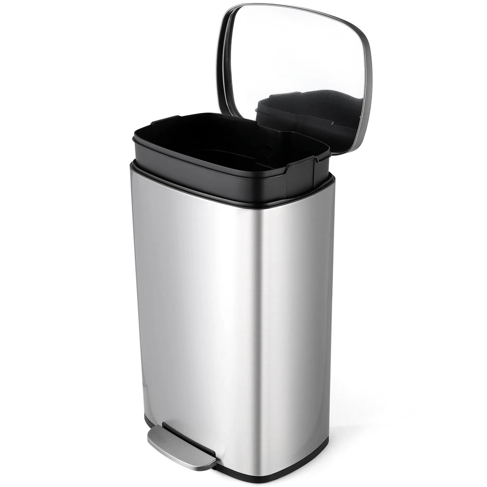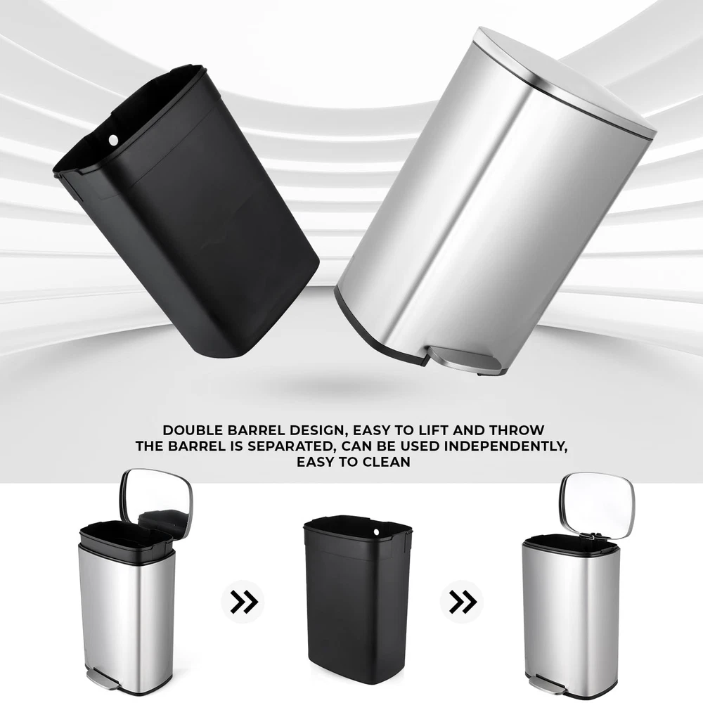Description: Step trash can is constructed of brushed stainless steel. Surface treatment of stainless steel wire drawing makes it easier for you to clean the kitchen trash can an keep it clean all the time. The back side has a convenient handled bucket for easy lifting. A strong wide steel pedal is designed to last, and the soft-close lid ensures a smooth, silent close every time. Suitable for all kinds of occasions, kitchen, bedroom, living room. Stainless steel trash can is convenient and practical, you can place it anywhere you need Specification: Whole Dimensions: 13.6"W x 9.3"D x 24.6"H. Height with lid open: 32.5" Pedal Size: 5.9''*1.6'' Inner Buckets: 13"W x 9"D x 22.6"H. Note: Manual measurement, there may be errors Stainless Steel&ABS Buckets: Kitchen trash can is made of 410 stainless steel and adopts a wire drawing process. It has a delicate appearance and is easy to clean. Trash can uses detachable ABS inner barrel is convenient for garbage disposal and of garbage bags. Quiet Closing&Lid-lock: Heavy-duty garbage can is built with integrated step pedal mechanism and the force damper, which soft open and close lid while preventing slamming and banging. Lid-lock can help keep trash can open without stepping if you are inconvenient to keep stepping on pedal. Large&Enduring Foot Pedal: Stainless trash can features 5.9" wide pedal, providing a comfortable stepping surface, making it effortless to open the lid. It is crafted from sturdy stainless steel ensuring smooth and reliable operation for years to come Portable Handle: Potable handle in the back of trash can is easy for you to move it to anywhere you need. Rubbish can uses oval-shaped lid, If you don't want the whole house to smell like you don't like, you just need to make sure that the lid of trash can is always closed Bag Holder& Side Handle: Hole design in the back of inner buckets will fix the trash bag well, avoiding the excess part of the garbage bag from accumulating on the side of the barrel. And side handle on both sides of inner buckets help you take out of buckets easily