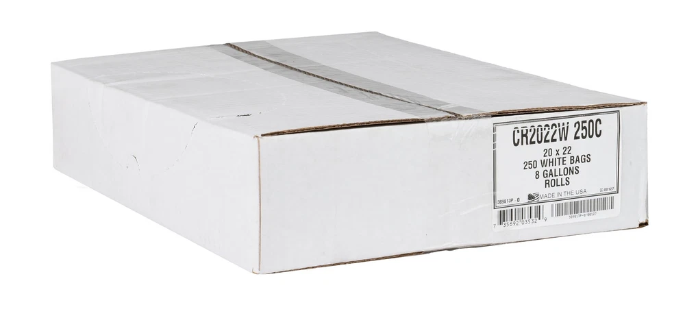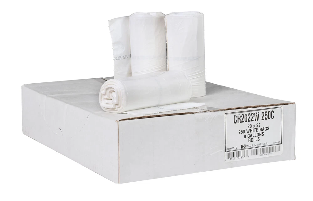 8 Gallon 0.7 Mil White Trash Bags - 20" x 22" - Pack of 250 - For Home, Kitchen, Bathroom, & Office Frustration Free - Our 8 Gallon garbage bags are as tough on trash. 0.7 Mil thick gauge means your project will stay frustration free. Save Money - Our 8 gallon liner bags are tough on debris; not on your wallet. We provide the same value the big brands do at half the price. Proudly Made in the USA - All products are carefully and proudly made in the United States of America. Never Waste a Bag - Bags are packed neatly and disperse at a time so no bag ever goes wasted.