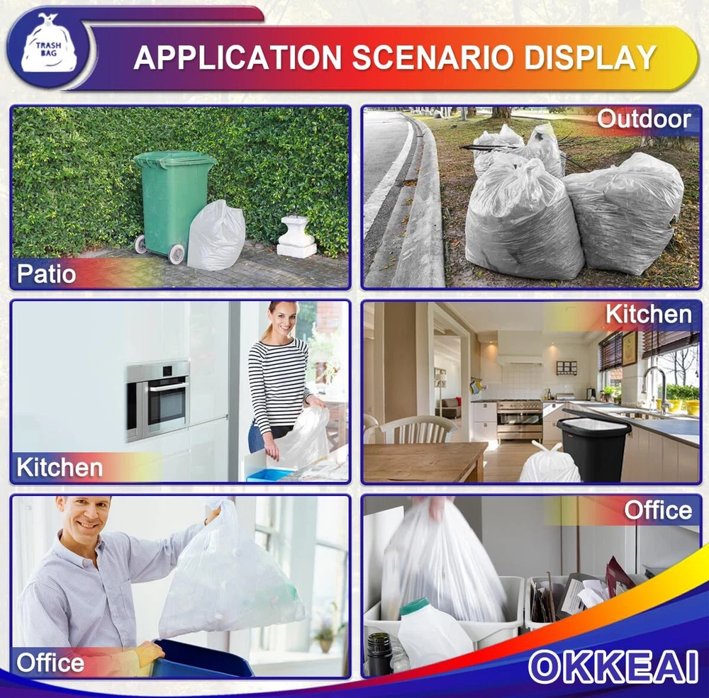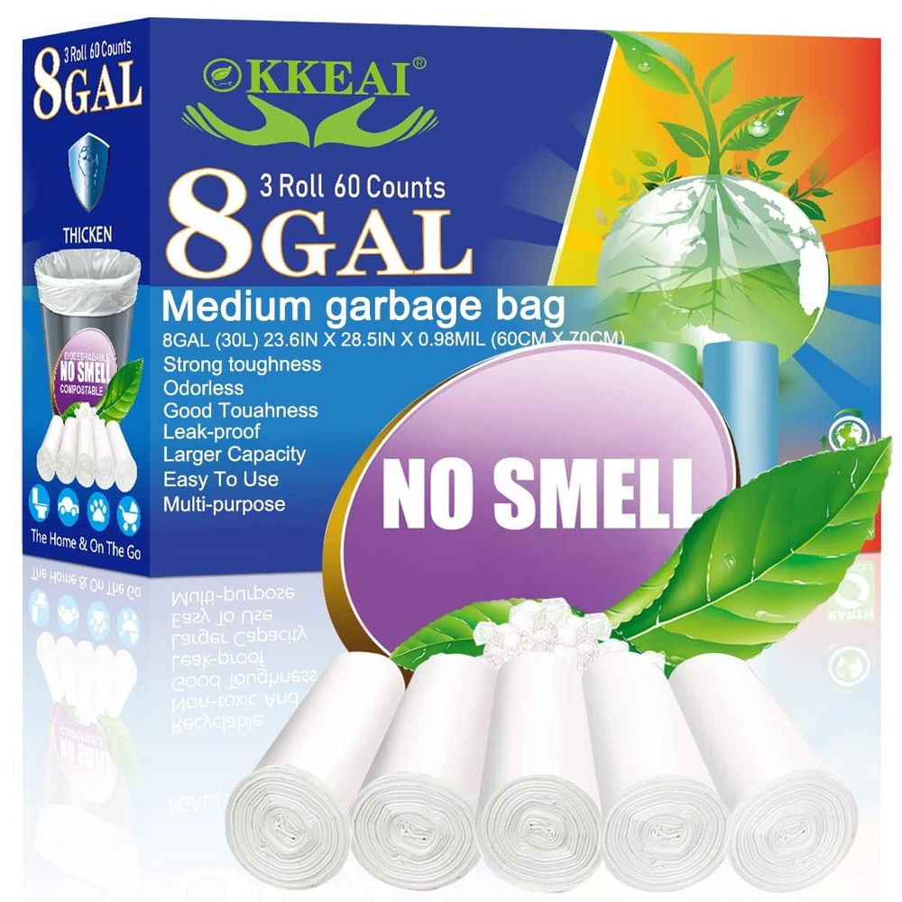 Sturdy Thick Garbage Bags:Our kitchen garbage bags are designed to be tear-resistant, leak-proof, perforated, compact. They are thicker than other kitchen trash bags, have a 115 mil design and hold up to 8 gallons (30 liters). You'll find our waste paper liners to be unbreakable, leak-proof, extra strong, and extra durable New Material:Our 8 gallon clear trash bags are made of colorless, odorless and safe material, you can use them with confidence Medium Garbage Bags:Our 7-10 gallon trash bags measure 23.5* 28 inches (60 ±1cm x 71 ±1cm). These white tall garbage bags are nice for 20-30 liter trash cans of different shapes including round, square and rectangular borders Multipurpose:Our bathroom trash bags are not only suitable for indoor use (office, kitchen, living room, bedroom, bathroom, diaper disposal, shredder, etc.), but also for outdoor applications (cat litter, dog poop, car waste, etc.). 100% Satisfaction:If you are not satisfied with our 8 gallon garbage bags, you can us, we will do our best to solve the problem and create a better shopping experience for everyone