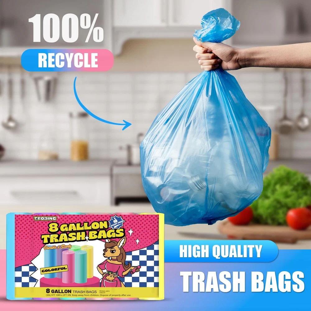 【8 Gallon Size】Just the right size to perfectly fit most medium trash cans. The 8 gallon garbage bags are 21.65” W x 26.77''H,suitable for up to 30L trash can. They come in 6 rolls, 150 count in total. 【Thick & Unscented】 Adopted the durable HPDE material, medium colored trash bags are sturdy, strong, and odorless. Durable and leak-proof, the 8 gallon trash bag is ideal for everyday use. 【Tear Resistant 】 With great tensile strength, the medium garbage bags are sturdy enough for daily household and everyday demands. The medium trash bags 8 gallon can hold up a lot of weight without breakage or leakage. 【Versatile Usage】Handle daily household trash needs with our unscented 8 gallon garbage bags. Suitable as office, bedroom, kitchen, and bathroom garbage bags. Great medium trash can liners to meet your daily cleaning needs. 【Customer Satisfaction】 At , our customers are like family. If you have any questions or concerns about our 8 gallon trash bags, our friendly team is here to help. Your satisfaction is our top priority.