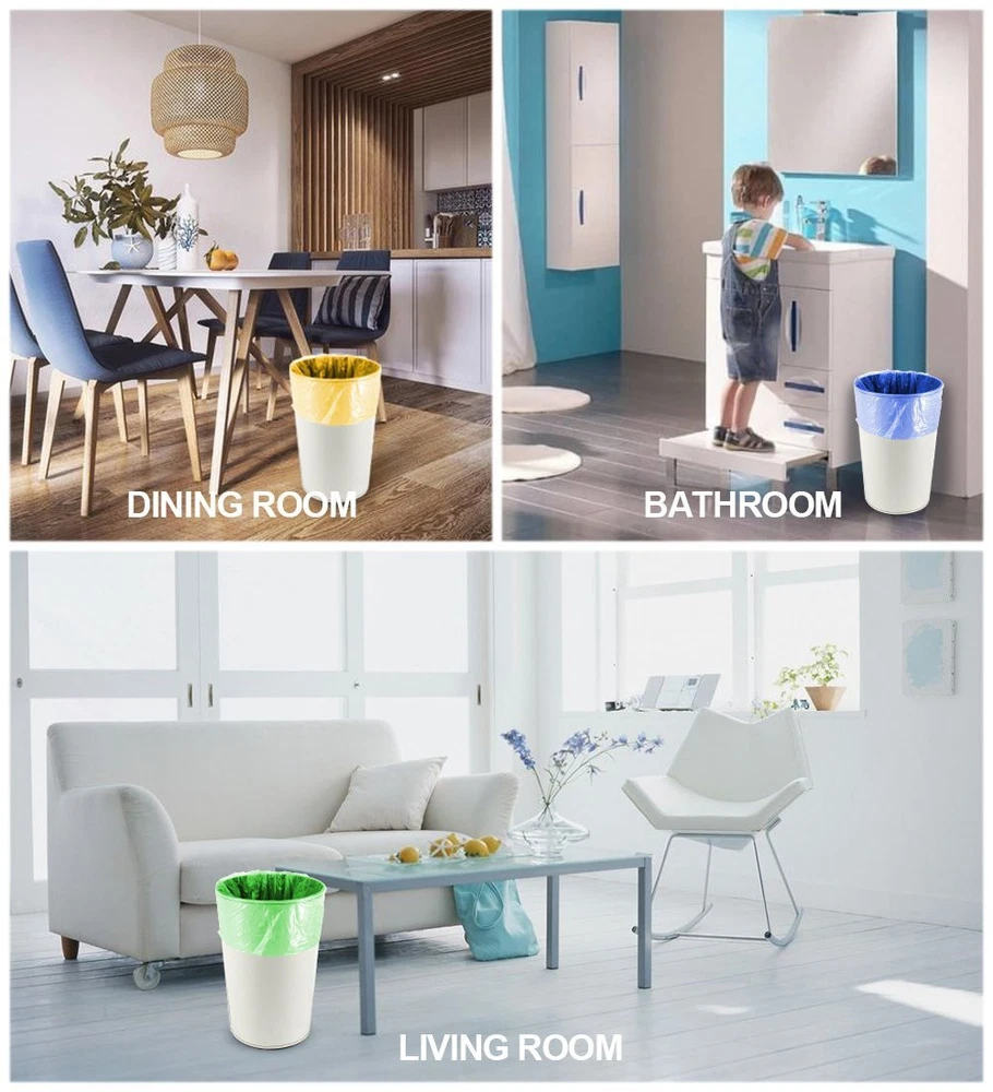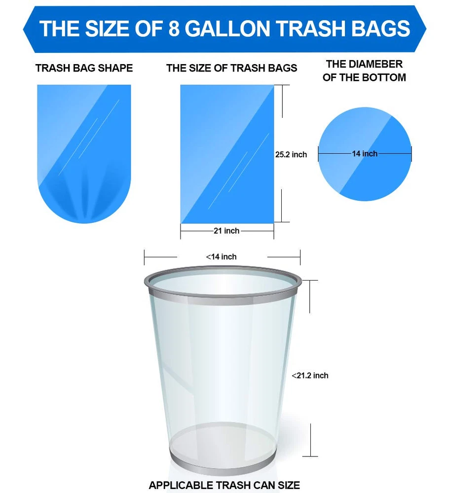 Dimensions - 21 inches * 25.2 inches. 150 count of 8 gallon trash bags. Thickness: 0.48mil. Fit most of medium size trash bins. Our trash bags are all no smell, good for . Durable and Thick - Made of pure PE material, no smell, no breakable, more durable, more environmentally friendly. An integral forming on the bottom leave no space to leak. Multi-Color Trash Bags - Include 5 colors: Blue, Green, Pink, Yellow and Purple. They arrive in a neat roll, perfect for storage. Multipurpose & Convenient - Not only a wastebasket bag for office, kitchen, living room, bedroom, bathroom, cleaning pet's litter, baby diapers and garage, this bag can also blankets, books and clothes according to season, and organize your holiday decorations. Guaranteed - If you have any questions and issue, please feel free to us!