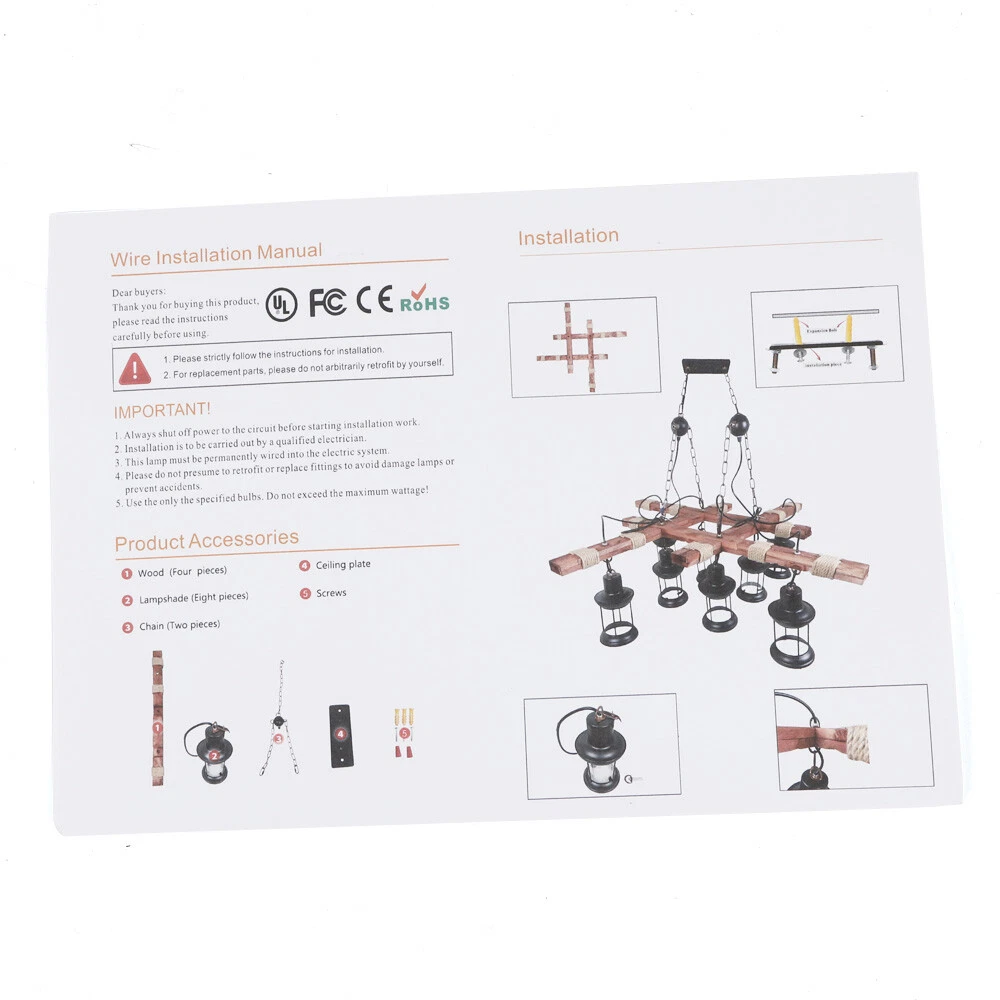 Specification Material: Iron, Wood, Glass Irradiation Area: 10-25m²/107.64-269.1ft² Height: 80+30cm/31.5+11.81in Length: 100cm/39.37in Chain Adjustable Range: 30-80cm/11.81-31.5in Lamp Holder: E27 Input Voltage: 110-120V Light Source: Not Included Installation 1.Fix the hanging board on the ceiling with screws. 2.Assemble the four wooden sticks in a two-by-two crossover pattern( as instruction shown). 3.Lead the lampshade power cord out of the hoisting ring and the chain. 4.The dental rod passes through the wooden board lamp body and is fixed with a nut. 5.Fix each lamp head line along the lamp body with a wire buckle, buckle the movable buckles on the four hanging chains into the light ring and tighten them. 6.Pass the main power cable through the round iron ball and along the hanging 8 Heads Wood Chandelier Iron Ceiling Lamp Industrial Rustic Pendant Retro Light Description This Is a Chandelier with Vintage Industrial Features. Made of High-quality Iron, Wood, and Glass, It Has a Novelty and Elegant Appearance. and It Has a Wide Range of Applications, You Can Decorate It in Restaurants, Cafes, Bookstores or Bars, and Many Other Places. Key Features Good Material: the Quality of the Wood Is Very Hard, Not Easy to Deform, or Fade. the Lampshade Is Made of Highly Translucent Glass, Which Can Provide You with Enough Bright Light. the Lamp Cover Is Made of Excellent Baked Metal with High Strength, and Corrosion Resistance, Which Is Not Easy to Rust. Highly Waterproof : the Lamp's Shade Is Made of Glass and Has a Strong Seal, so It Is Highly Waterproof. You Don't Have to Worry About the Water Damage, and Also You Can Easily Clean It. Height Adjustable : the Adjustable Range of the Chandelier Is 30-80 Cm / 11.81-31.5in, You Can Choose Your Favorite and the Most Comfortable Height. This Will Also Effectively Reduce the Pressure of the Lamp Pendant, More Secure. Easy to Install: It Includes All the Installation Accessories, You Can Follow the Installation Steps to Install It Quickly and Easily, but Also Be Able to Enjoy the Fun of Do-it-yourself Installation. Wide Illumination Range: the Chandelier Has 8 Bulbs, It Can Lighten up Your House with Ease. Coupled with Its Ability to Adjust the Height. These Features Have Created a Brightness Range of 10-25 Square Meters That It Can Reach. Vintage Industrial Style: This Chandelier Subtly Combines the Industrial Feel of Metal with the Vintage Feel of Wood, Creating a Comfortable and Novel Sense of Atmosphere for You. Wide Application: This Chandelier Is Suitable for Homes, Bookstores, Bars, Restaurants, Cafes, Etc. Customer Service: We Aim to Provide Quality Products and Services. If You Have Any Problems, Please Feel Free to Contact Us. We Will Reply and Solve the Problem for You As Soon As Possible. Details Iron Ceiling Pan: the Ceiling Pan Uses Hardware Iron-baked Gold so That It Is Obvious Texture, Anti-corrosion and Wear-resistant, and Durable. Adjustable Chain: It Can Effectively Reduce the Pressure of the Lamp Pendant, Making This Chandelier Safer. 8-Head Light: It Can Be Fitted with Eight Bulbs to Provide You with Plenty of Light. Glass Lampshade: It Has a Good Light Transmission and Can Provide You with Plenty of Light. Application The Irradiation Range of This Lamp Is 10-25m²/107.64-269.1ft² and It Is Suitable for Homes, Bookstores, Bars, Restaurants, Cafes, Etc. Specification Material: Iron, Wood, Glass Irradiation Area: 10-25m²/107.64-269.1ft² Height: 80+30cm/31.5+11.81in Length: 100cm/39.37in Chain Adjustable Range: 30-80cm/11.81-31.5in Lamp Holder: E27 Input Voltage: 110-120v Light Source: Not Included Installation Fix the Hanging Board on the Ceiling with Screws. Assemble the Four Wooden Sticks in a Two-by-two Crossover Pattern( As Instruction Shown). Lead the Lampshade Power Cord out of the Hoisting Ring and the Chain. The Dental Rod Passes Through the Wooden Board Lamp Body and Is Fixed with a Nut. Fix Each Lamp Head Line Along the Lamp Body with a Wire Buckle, Buckle the Movable Buckles on the Four Hanging Chains into the Light Ring and Tighten Them. Pass the Main Power Cable Through the Round Iron Ball and Along the Hanging Chain to the Ceiling Plate. Pass the Main Power Cable Through a Round Iron Ball Along the Hanging Chain, and Then Lead to the Ceiling Plate Along the Hanging Chain. Package Included 4* Woods 8* Lampshades 2* Chains 1* Ceiling Plate 1*English Instructions Other Accessories for Assembly Notes The Chandelier Does Not Contain a Light Bulb, Please Prepare Yourself Before Use. Please Be Sure to Remember to Disconnect the Power When Installing the Chandelier. Please Allow the Slight Color Difference Caused by the Shooting Light and 1-3 Cm Error Due to Manual Measurement, and Make Sure You Do Not Mind Before Ordering. Payment Delivery details Terms of sales About us Contact us Payment We accept ebay payment 。 Fees such as import duties, taxes are not included in the item price or shipping costs. These charges are the buyer's responsibility. Delivery details Shipping: 2-9 working days to: USA Terms of sales We maintain high standards of excellence and strive for hundred percent customer satisfaction. Feedback is very important to us. We hope that you contact us immediately before you give neutral or negative feedback, so that we can address your concerns. It is impossible to address issues if we do not know about them! About us Your satis faction is our ultimate goal. We work hard to earn your trust and future business. Our certified technicians have tested each item before shipping. The unit comes with 1 year limited warranty on all manufacturing defects. a) If you receive a defective item, you may return it or ask for a discount. Please contact us within 14 days after you receive the package. b) What you returned must be intact and in its original packaging as re? u. Customer is responsible for shipping costs of the returned item. c) We will cover the cost of shipping back t with the shipping rate indicated in t