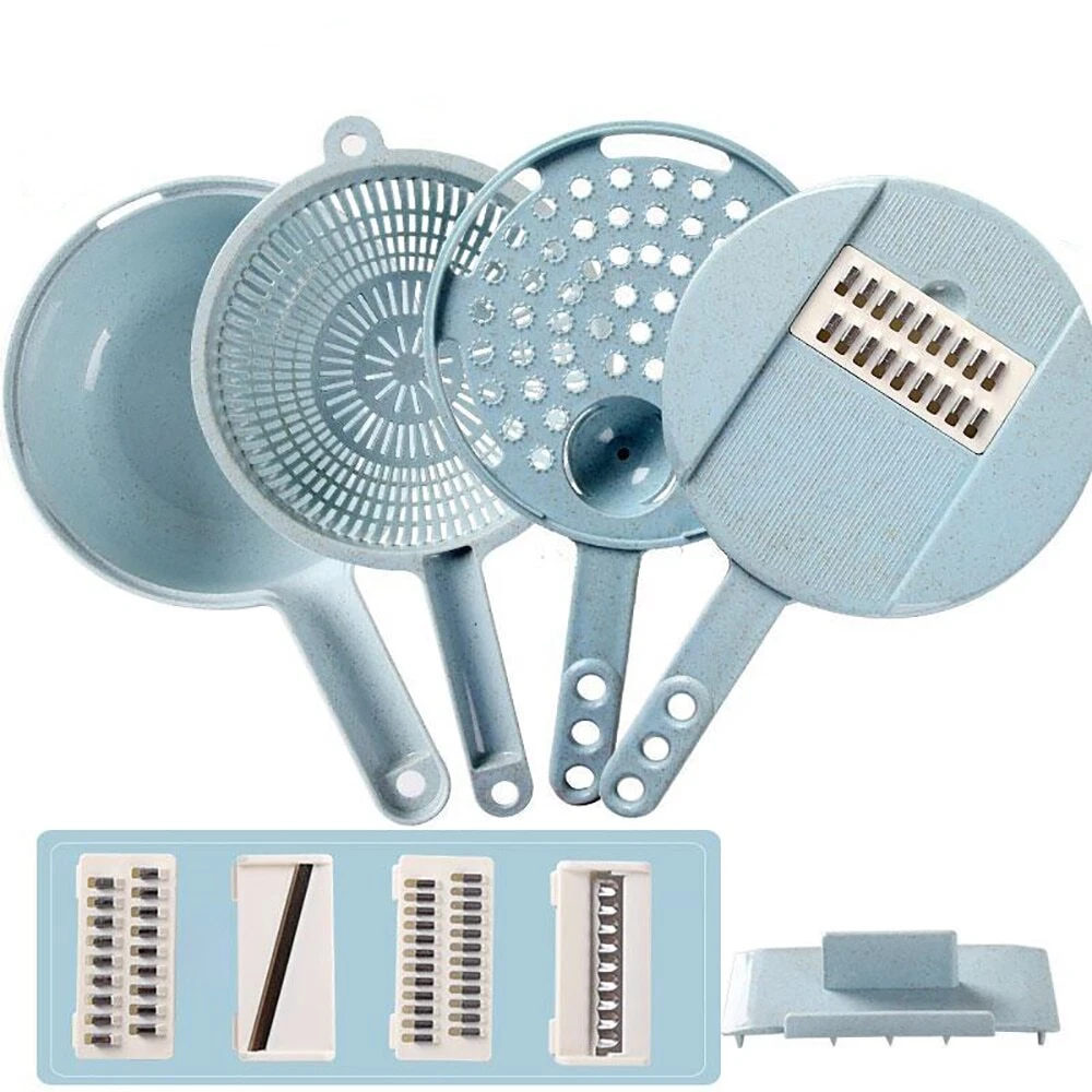 Overview: This hand-held slicer made from Food-Grade stainless steel & BPA-Free plastic offers. It offers all the functionality of multiple appliances with changeable stainless blades. These blades can cut through all kinds of vegetables, grate cheese, slice potatoes, and cutting fruits, and even can create paste-like vegetables or mashed potatoes. With this kitchen cutting kit, you can save 70% time, say bye to watery eyes when slicing onions; And helps you prepare food more elegantly. Specification: Material: wheat straw + PP + stainless steel Size:29.5 cm * 12.0 cm * 9.5 cm Weight:0.55kg Package Content : 4x Blades 1xContainer 1xSlicing Guard hand Protector 1xDrain basket 1xSlicer 1xEgg Divider+Grater