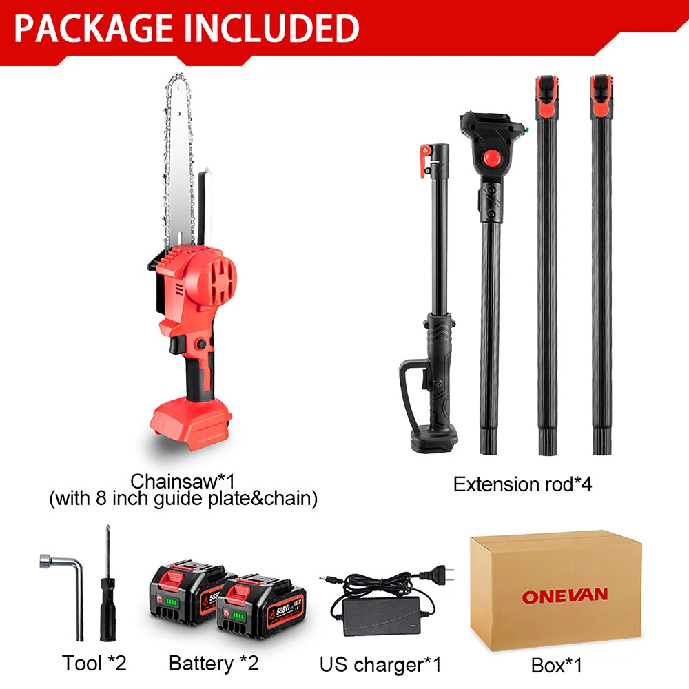 Store Categories Store Categories Impact Wrench Power Tools Other Welcome To Our Store Product Description 【2-in-1 Cordless Pole Saw & Mini Chainsaw】The power tool for convenient high or low trimming.ONEVAN battery operated pole saw handles high branches and wood cutting, eliminating the need for risky ladder climbing or traditional manual tools. Whether you're a gardening enthusiast or a pro, this pole saw is your reliable helper. 【 Powerful Motor】With Brushless powerful motor, you will receive consistent performance and reliability from this streamlined machine. 【Flexible Operation】Our pole saw with 4 adjustable angles meets various trimming needs. The telescopic pole length can be adjusted in three sizes: 4.3 feet, 5.90 feet, 7.4 feet, easily trim branches, shrubs, or hanging plants. 【Powerful Performance】Equipped with a high-capacity battery, enjoy prolonged working time. No frequent battery changes or interruptions for charging. The robust motor provides strong power to handle larger branch and wood cutting with ease. 【Versatile Application】Cordless pole saw is perfect for both home gardening and professional landscaping. It is a multi-functional tool for various trimming needs, making your work easy, efficient, and precise. Specification: Motor Type: Brushless Type: Pole Saw, Mini Chainsaw with Extension Pole, Tree Trimmer Pole Chainsaw, Cordless Pole Saw, Battery Operated Pole Saw, Pole Saws for Tree Trimming Color: Red+Black Whole Length: 2.25m Rated Power: 450W Motor: Brushless Motor No Load Speed: 2300rpm Rated Speed: 10m/sec Battery Capacity: 5.0Ah*2 Battery Voltage: 20V Package Include: 1 x 8 inch Pole Chainsaw 4 x Extension Rod 2 x Li-ion Battery 1 x Charger 2 x Tool Please know before placing an order: Our power tools are compatible for Makita 18V batteries, this does not mean that it is an original product. Compatible for Makita 18V Battery: (Refers that our machines are compatible with the following battery models.) √ Compatible for 18V B series lithium battery, such as BL1850B (197285-8), BL1840B (197270-1), BL1830B (197602-2), BL1430B (197618-7), BL1820B (197487-6) √ Compatible for BL1850, BL1840, BL1440(196391-6), BL1415(194560-3), BL1815N(196781-3) Payment Policy Shipping Policy Returns Policy Payment Policy 1. We accept PayPal only. 2. All major credit cards are accepted through secure payment processor PayPal. 3. Payment must be received within 7 business days of auction closing. 4. We ship to your eBay or Paypal address. Please make sure your eBay and Paypal address is correct before you pay. Shipping Policy 1. We ship to your eBay or Paypal address. Please make sure your eBay and Paypal address is correct before you pay. 2. Items will be shipped within 1-3 business day when we received payment. 3. Delivery time depends on destination and other factors; 4. International buyers please note: a.Import duties, taxes and charges are not included in the item price or shipping charges. These charges are buyer’s responsibility. We will try our best to reduce the risk of the custom duties. b.Please check with your country's customs office to determine what these additional costs will be prior to buying. Returns Policy 30-day returns. Buyer pays return postage Copyright © 2023 Dianxiaomi