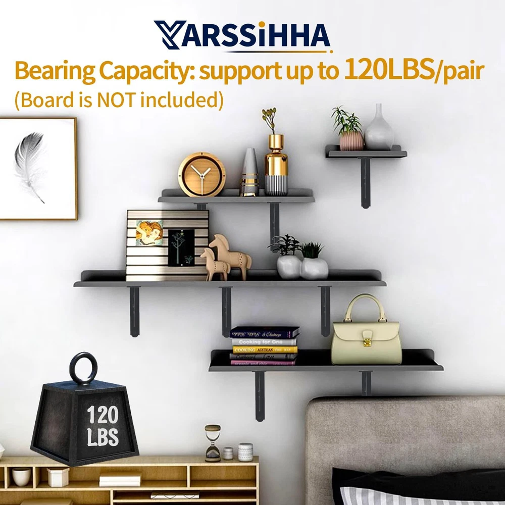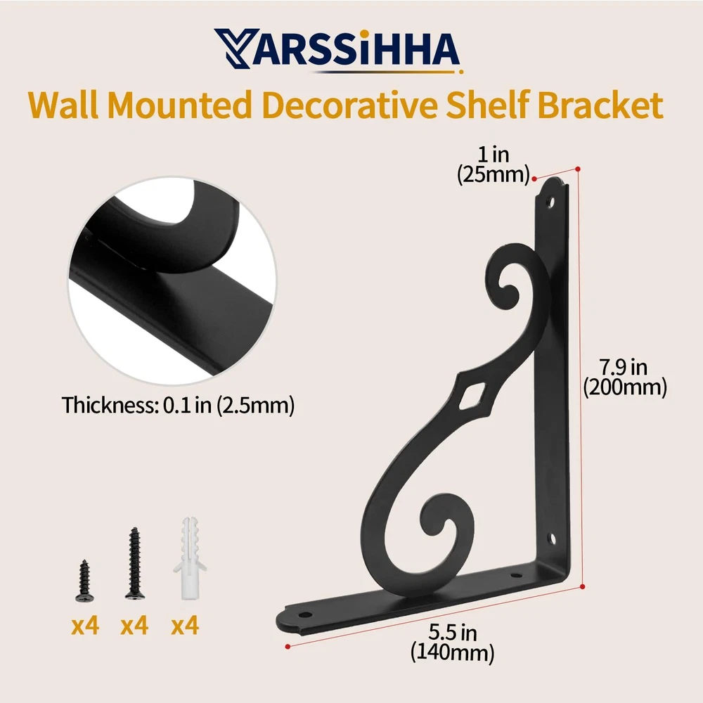 Attention: First, please confirm the sizes and quantities of wall shelf brackets you needed before purchasing. Second, the distance between shelf brackets and numbers of brackets will affect carrying capacity. Add more brackets to hold more weight easily Size & Specification: The dimensions of 8 inch decorative shelf brackets are 7.87"L x 5.51"H x 0.98"W, thickness are 0.1" (2.5 mm). They are made available for 6" to 10" deep shelves, both short and long sides can be used to install the floating shelves. Our heavy duty metal shelf brackets can hold up to 120 LBS per pair Advantage & Feature: Adopting fine cast iron materials, combining integral casting process, the shelf support has excellent bearing capacity. Vintage slant support is welded and fixed, right triangle structure increases stability and will not deform easily. coated glossy black surface brings you a completely new enjoyment, it is fine workmanship with smooth edges, never hurt your hands, durable and has long service life Installation Guideline: Comes with all installation hardware (Board is NOT included): 8 inch wall mounted shelf brackets, four long screws, four short screws as well as four concrete anchors, the shelving brackets are quick and easy to install. Brackets for shelves can be used on most walls, such as wall, ceramic tile wall, brick wall, solid wall Used Widely: Best for study decoration, living room decoration, kitchen storage, bathroom storage, supermarket shelves, bar storage, balcony or outdoor potted plants placement. DIY your space by decorative shelving brackets. Our decorative brackets will maximize the use of your space, bring you a tidy and orderly home