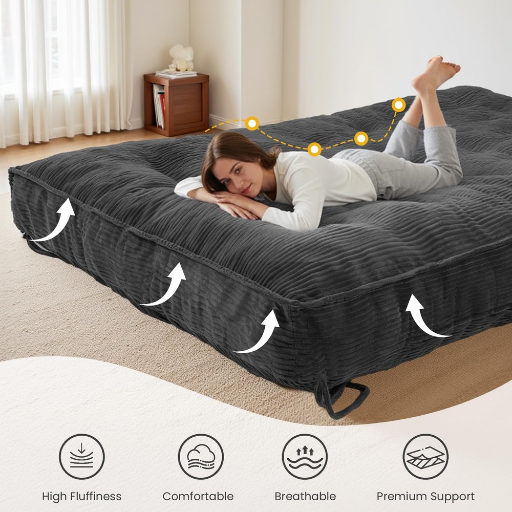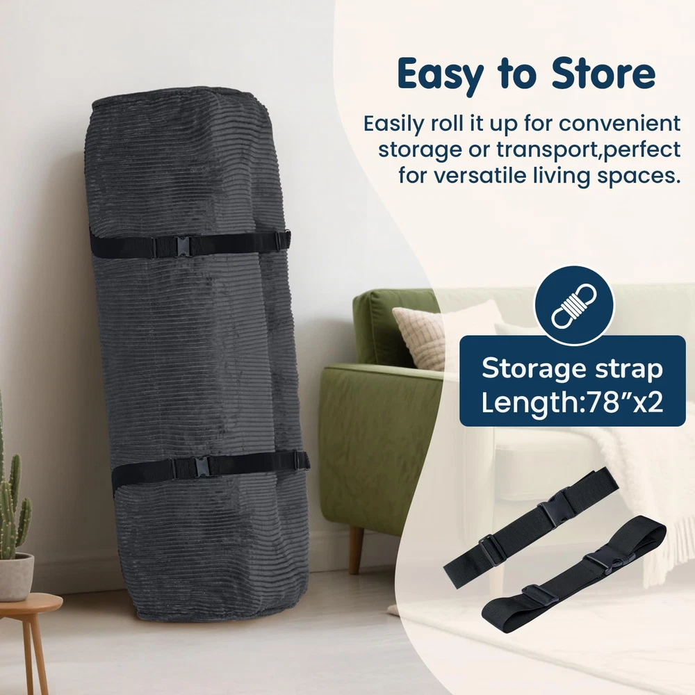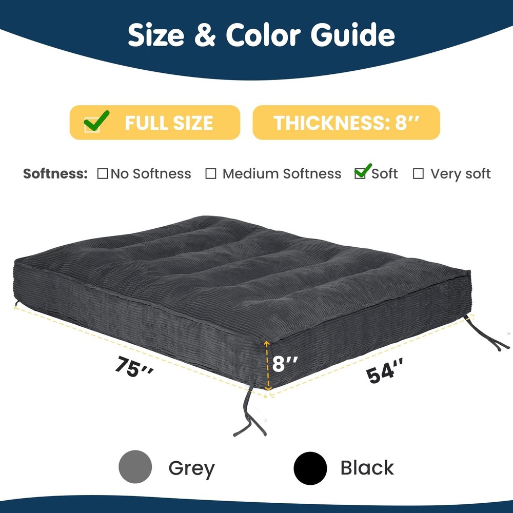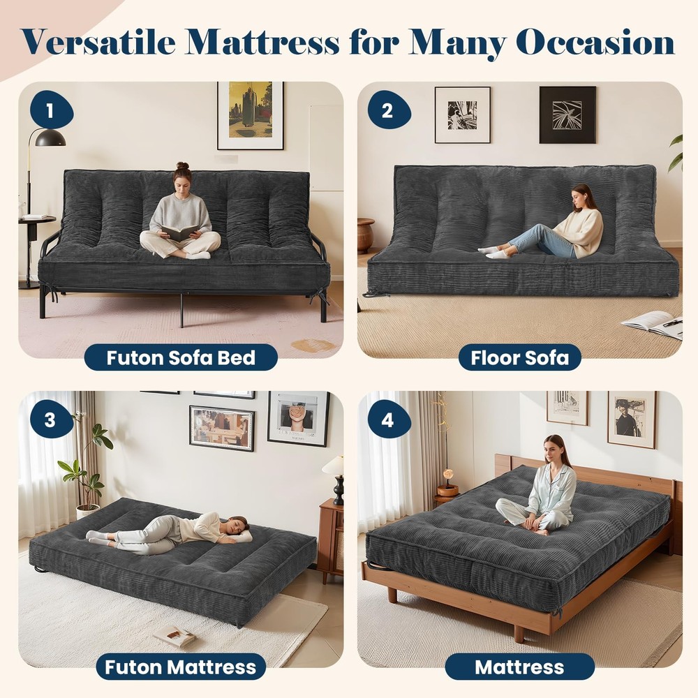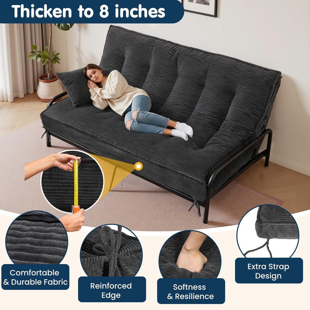 Note: Frame Not Included 🏗️ Secure Strap Design & Versatile Use: This 8-inch thick futon mattress features 4 reinforced corner straps for secure attachment to most bed frames, preventing slippage. Includes 2 additional storage straps for easy folding, storage, and transport. Functions as a mattress or effortlessly converts into a futon sofa bed or temporary guest bed, meeting diverse household needs 🌿 Year-Round Comfort & Skin-Friendly Material: Futon mattress full size crafted with premium soft corduroy fabric, it offers a cozy touch and excellent breathability for all seasons. The high-quality material ensures durability while delivering a warm, comfortable home experience, providing an ideal sleep and relaxation solution for bedrooms, living rooms, guest rooms, or apartments 💤 High-Support Filling: The futon couch internally filled with high-resilience foam chips, scientifically proportioned to perfectly balance support and softness. Effectively contours to body curves, relieves pressure points, ensures comfortable sleep, while maintaining shape and preventing sagging to extend lifespan of full size futon 🏠 Space-Optimized & Convenient: No complicated tools required—simply unfold and use. Compact when folded, our futon mattress stores easily in closets or corners, perfectly solving space constraints in smaller homes. An ideal choice for apartments, dorm rooms, guest rooms, children's spaces, or meditation areas, balancing comfort with space efficiency 🔒 Quality Assurance & Safety Design: Meticulous attention to detail ensures durability. Futon sofa bed with sturdy straps and reinforced stitching guarantee long-term reliability. All materials meet relevant safety standards, providing peace of mind for you and your family. Note: For hygiene, use a mattress cover and air regularly to maintain optimal condition
