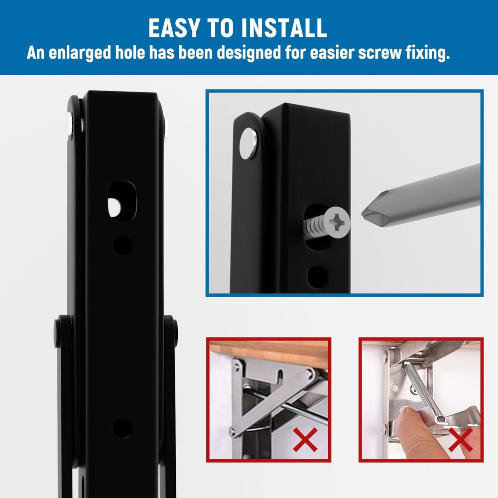 Efficient Space Utilization - The folding brackets offer a space-saving solution that allows you to free up more room in various settings such as garages, kitchens, shops, stores, workshops, boats, motorhomes, backyards, trailers, rooms, balconies, and bathrooms. Simply mount these fold-able brackets on your walls. Robust & Enduring - Crafted from high-quality premium grade steel and coated with a resilient baked black paint finish, these brackets ensure remarkable durability and resistance. This protective baked black paint treatment enhances its capacity to withstand daily wear, scratches, and corrosion. Simple Installation and Usage - Equipped with a lock for securing the folded table position, a wall mounting option for flush installation, and the ability to be fixed on 25/32 mm radius pipes, these brackets are user-friendly and versatile. The integrated hinge mechanism ensures that the flap automatically locks when opened and can be easily released by pressing the lever. Effortless Installation - Mounting the shelf brackets is a breeze; just ensure they align accurately with the studs during installation. The package includes mounting accessories, premium stainless steel screws, and high-quality anchors, ensuring a secure attachment. Product Description Meet this LEOPO L type shelf bracket design that blends with both contemporary or rustic styles and it’s versatile to fit any room of the house. · Folding Shelf brackets · Wood Wall Screws · Wood Board Screws · Concrete Plastic Expansion Anchors · Installation Instructions *NOTE: Please use our guide for proper installation. Easy to Install An enlarged hole has been designed for easier screw fixing 90°Fixation Innovative lock, versatile mounting options, and intuitive release mechanism for seamless use. Installation Guide Comes with step by step instructions for easy installation.