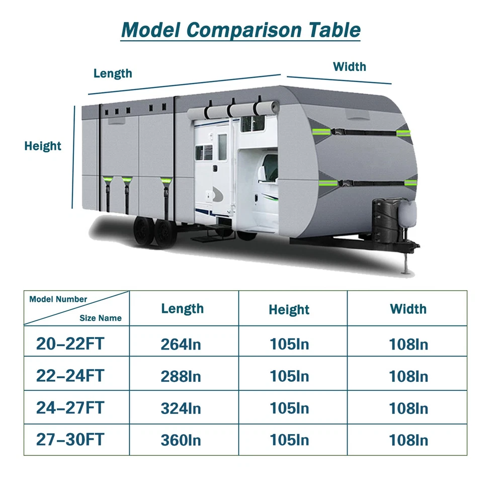 Store Categories Store Categories Other 8 Layers Top Camper Cover Windproof Travel Trailer RV Cover Fit 22' to 24' Product Description 【Material】Upgraded Rv cover& Trailer covers, RV cover fabric to extra thick 8-ply non-woven fabric mixed with waterproof membrane, protect against rain, snow and scratches. Reduces premature aging of RV prolonging service life. 【Waterproof&Windproof】8 layers of fabric built-in waterproof film,fabric is thicker and more durable than others on the market, strong waterproof performance.Our trailer cover provides super windproof, with elastic hem,9 extra long straps to keep the RV cover firmly fixed on the camper without being blown away. 【 Air Permeability】There are 6 air vents placed on the RV cover can effectively reduce the wind pressure and discharge the internal moisture.The breathable material can maximize the speed up water evaporation ,keep the inside of the cover clean to keep the RV dry all the time. . 【Features】The interior is soft enough not to scratch the car paint, good air permeability,2 reflective strips in front and rear for safety avoid collision during night.Note: Make sure that the size matches your needs before purchasing, so you can have a better shopping experience. 【PACKING LIST】22-24 ft Travel Trailer Cover *1, Front and End buckle straps *4, Bottom buckle straps *3, 12 -meter body bundle webbing straps *2, Tire covers *4, Jack cover*1, Adhesive repair patche *1, Storage Bag*1. Contact Us Shipping Policy Returns Policy Contact Us Please feel free to contact us if you have an issue with the part you receive. Please do not open a case directly through eBay as it will hurt the seller's good standing. We ask you to please give us the opportunity to resolve any issue you might have directly with you first. We usually reply within 24 hours, holiday and weekends might take slightly longer. Thanks for your patience, understanding and cooperatio We strike to make the buying and selling experience pleasant for both. Thank you for your time and cooperation. Shipping Policy The item will be shipped within 24 hours on payment received except the holidays.(except weekends & official holidays). You can log on to eBay to check your logistics tracking number.Please confirm address before purchase, and cannot change address once purchased. If you need to receive the item quickly, please contact us, you can pay the postage to choose other logistics. Returns Policy Please contact us first when return, exchange and refund is required. Any direct return of purchased items will not be processed. Item must be returned in new condition, as received with all accompanied accessories and literature, including the factory carton. Shipping, handling is not refundable unless item is returned because of defect. If the product is defective or damage upon arrival,please contact us immediately,we will provide the solve the problem. Returns accepted within 30 days of delivery date and item must be in original new condition. Copyright © 2023 Dianxiaomi
