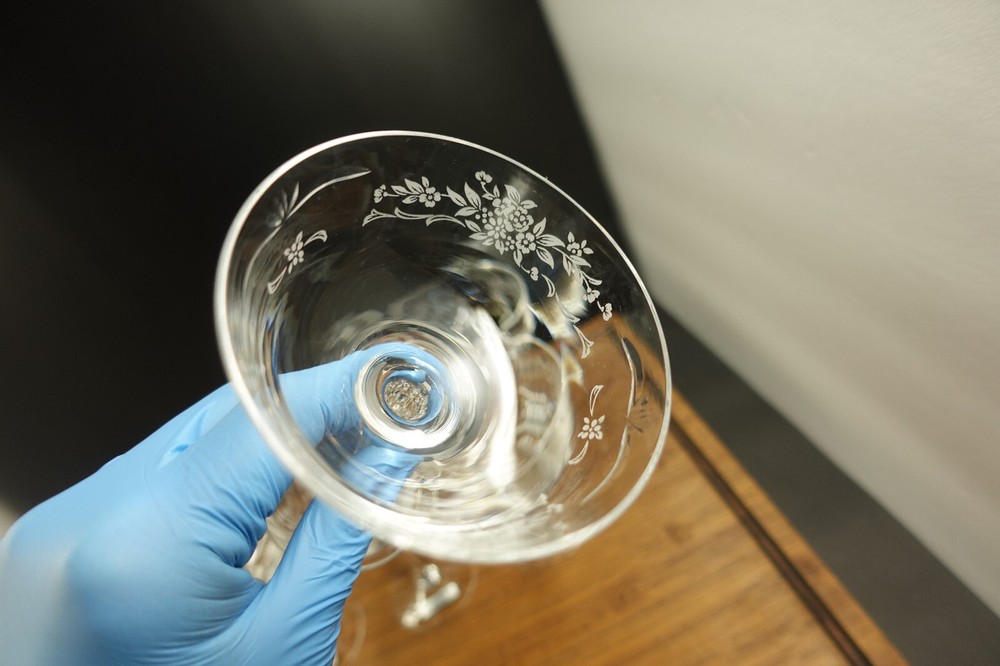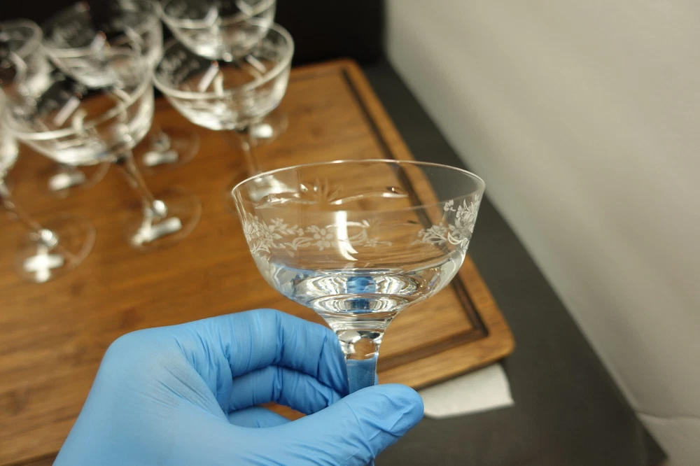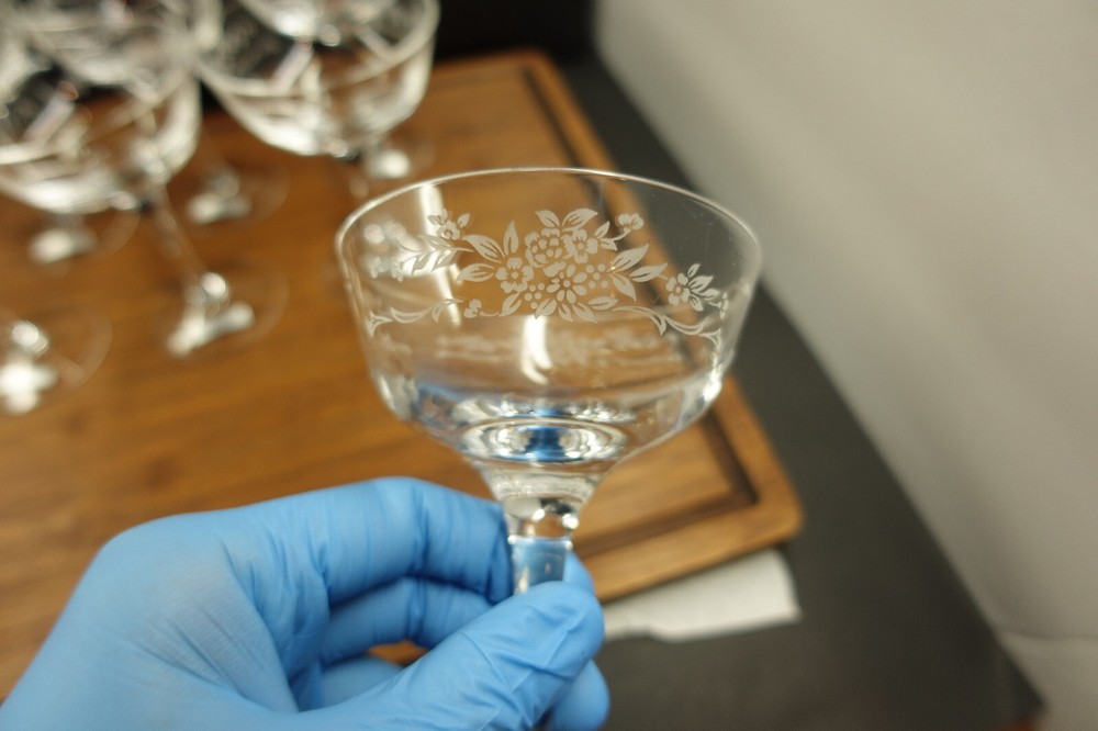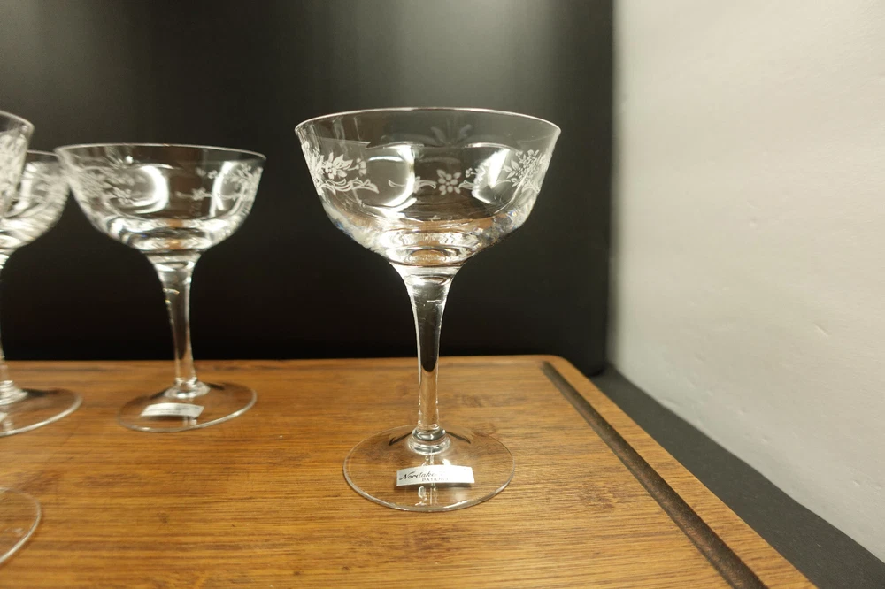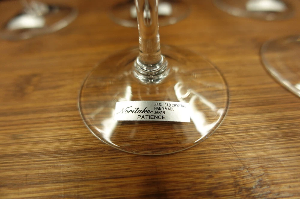 Features: Decorative, Etched Occasion: All Occasions Vintage: Yes Year Manufactured: 1984 Item Height: 5 3/8'' Production Style: blown glass Style: Contemporary Color: Clear Type: Wine Glass Pattern: Patience Material: Crystal Brand: Noritake Care Instructions: Hand Wash Only
