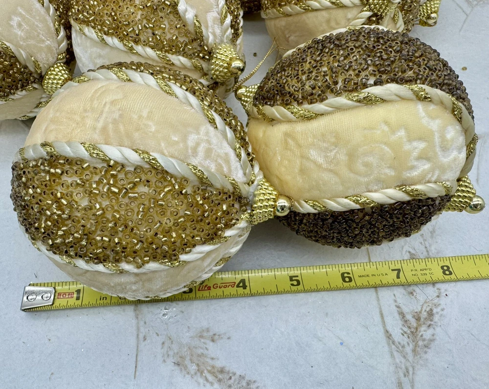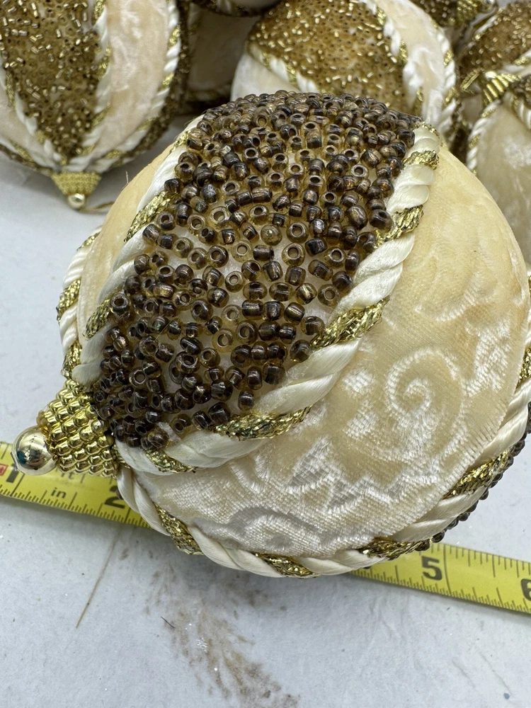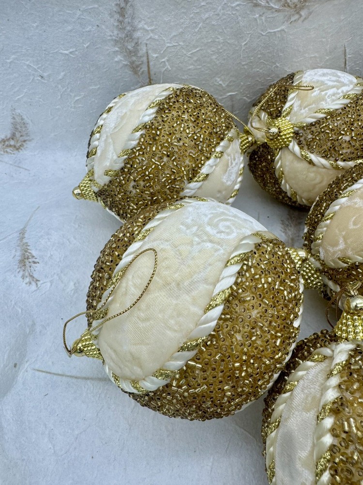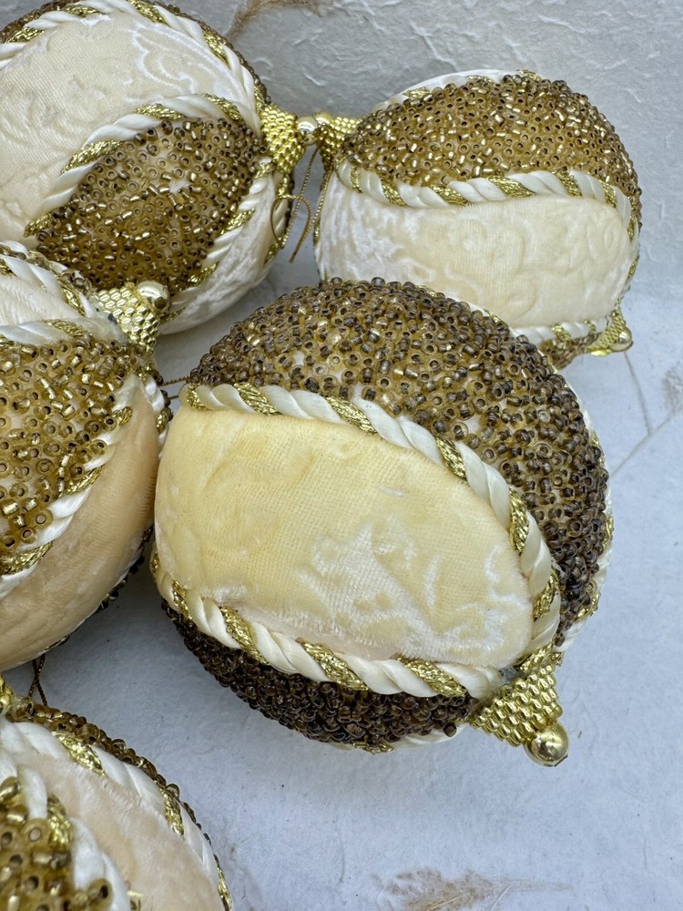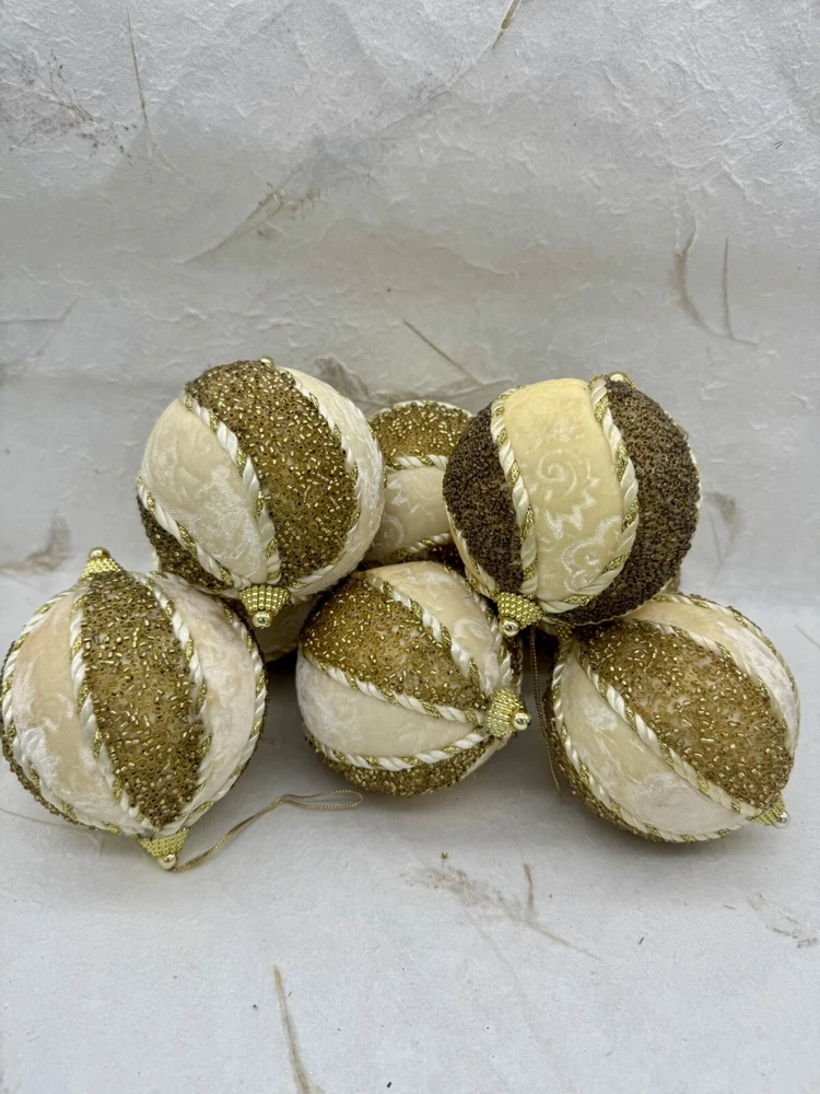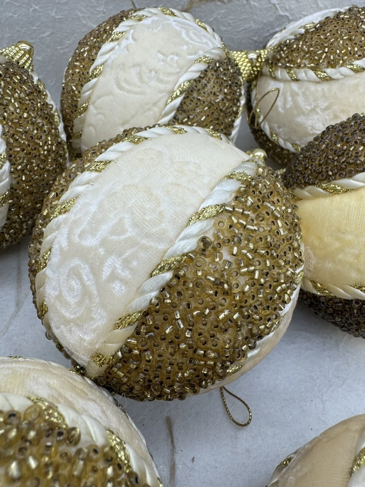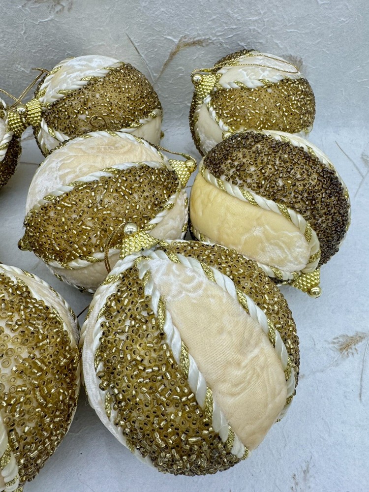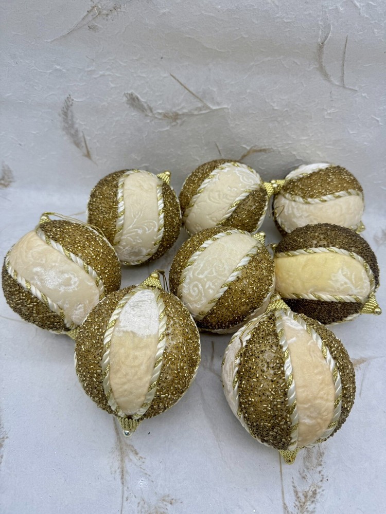 ๐ธ Add a touch of elegance to your holiday decorations with this set of 8 vintage-style ornaments. ๐ธ These round ornaments feature a beautiful brocade pattern and are made of mixed materials such as velvet and beads. ๐ธ The gold and cream color combination gives them a luxurious look that will complement any Christmas tree. ๐ธ Each ornament is handmade and unique, with original Victorian-style designs that are perfect for collectors. ๐ธ The set includes 8 ornaments, each measuring 4 inches in width. ๐ธ Whether you're looking to start a collection or just want to add some vintage charm to your holiday decorations, these ornaments are sure to impress. ๐ธ๐ธ Preowned vintage condition with minimal wear. A few loss beads but overall nice condition. NOTE: one of the 8 is a slightly darker color overall. SEE PICTURES!!!! ๐ธ Please view photos for closer inspection and more details. ๐ธ Smoke free environment Thanks for shopping ๐ธ