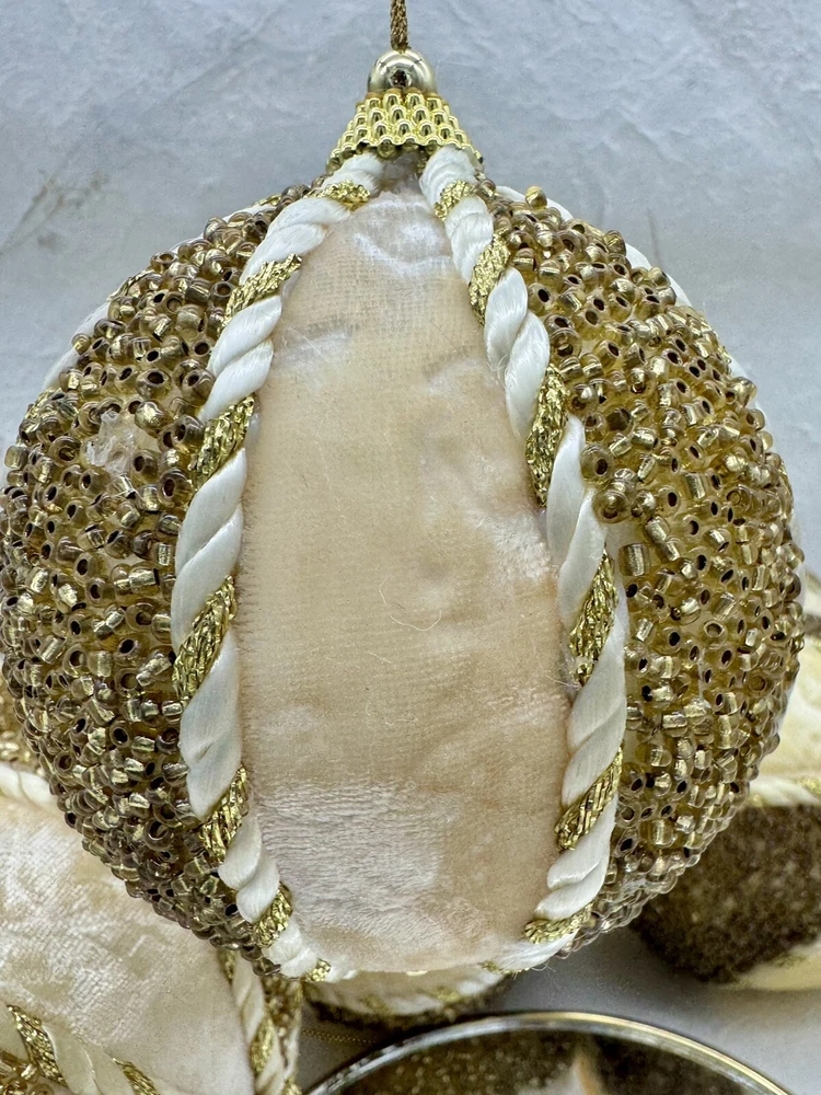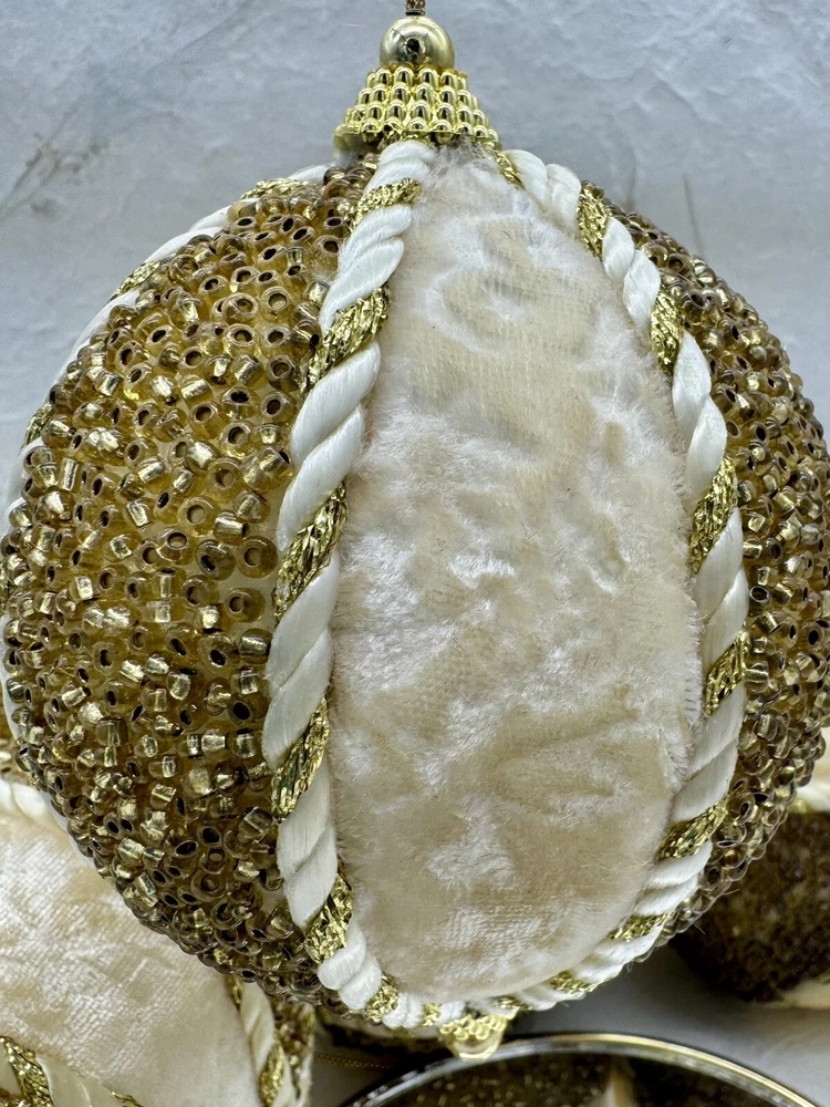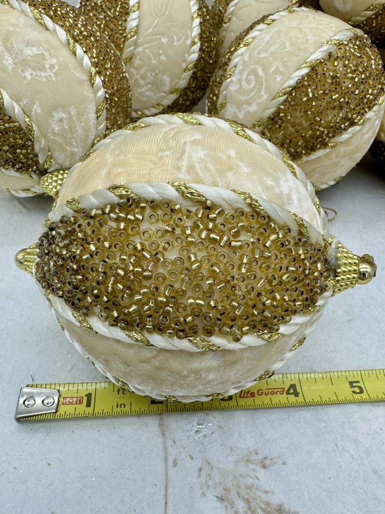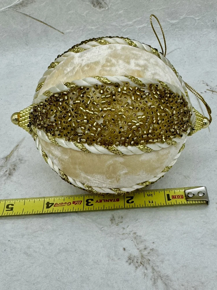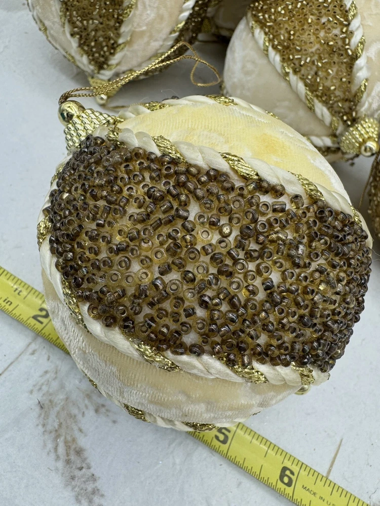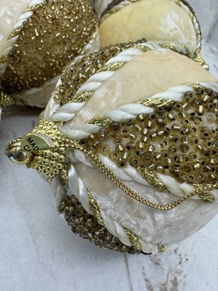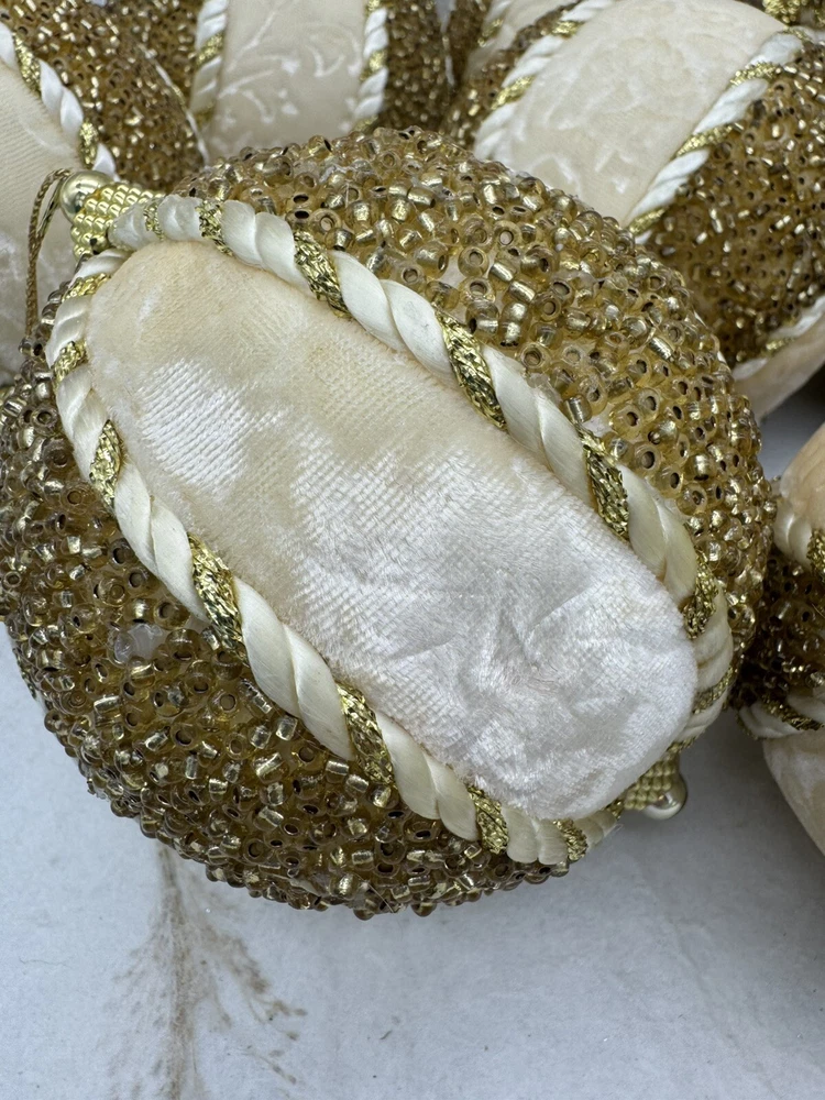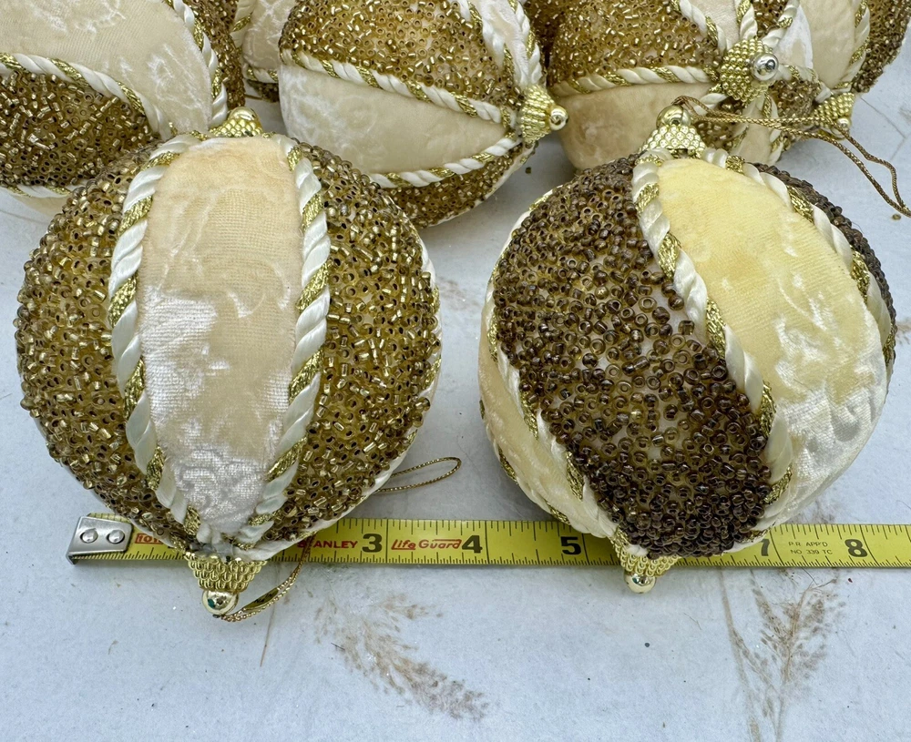 ๐ธ Add a touch of elegance to your holiday decorations with this set of 8 vintage-style ornaments. ๐ธ These round ornaments feature a beautiful brocade pattern and are made of mixed materials such as velvet and beads. ๐ธ The gold and cream color combination gives them a luxurious look that will complement any Christmas tree. ๐ธ Each ornament is handmade and unique, with original Victorian-style designs that are perfect for collectors. ๐ธ The set includes 8 ornaments, each measuring 4 inches in width. ๐ธ Whether you're looking to start a collection or just want to add some vintage charm to your holiday decorations, these ornaments are sure to impress. ๐ธ๐ธ Preowned vintage condition with minimal wear. A few loss beads but overall nice condition. NOTE: one of the 8 is a slightly darker color overall. SEE PICTURES!!!! ๐ธ Please view photos for closer inspection and more details. ๐ธ Smoke free environment Thanks for shopping ๐ธ