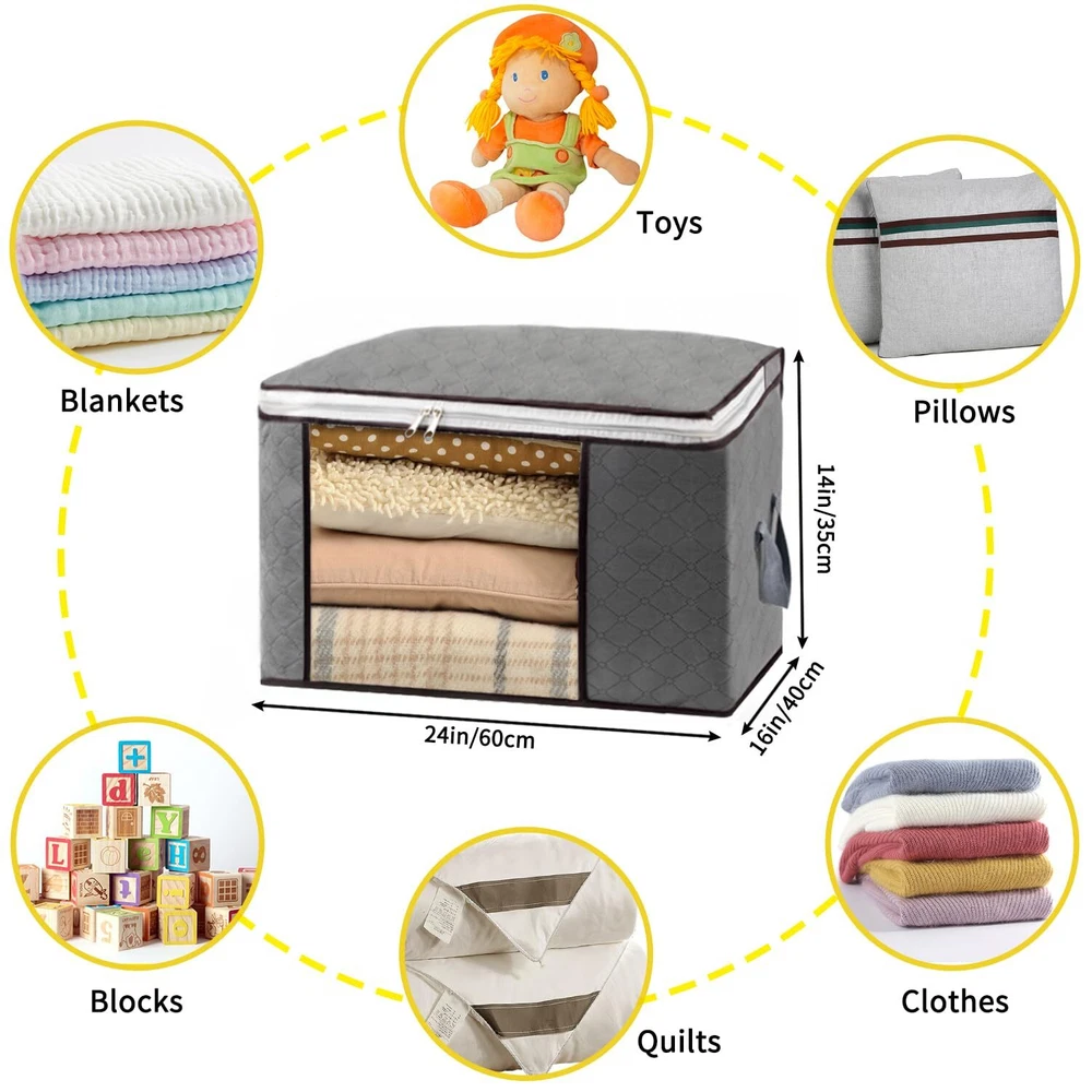 LARGE CAPACITY: Each clothe storage bag measures 23.6 x 15.7 x 13.8 inches / 60 x 40 x 35 cm. The kit contains 8 clothes storage containers with a total capacity of 90L. UPGRADE MAKINGS: Our foldable storage bags are made of 120g thick three-layer non-woven fabric in premium quality. STRENGTHEN DOUBLE HANDLE: Different from the others one layer handle, clothes storage bags sewed with three layers of thick fabric which can withstand loads about 13 lbs. VISIBLE WINDOW & TWO-WAY ZIPPERS: The visible clear window allows you to quickly view the contents of the storage bag. The high-quality two-way zipper is more sturdy and not easy to break, ensuring that your items are dust-free. VERSATILITY: Folding storage bag can be used in the closet or under the bed. Suitable for line, quilts, pillow, winter clothes and so on. In addition, the foldable design makes it easy to store when not in use.