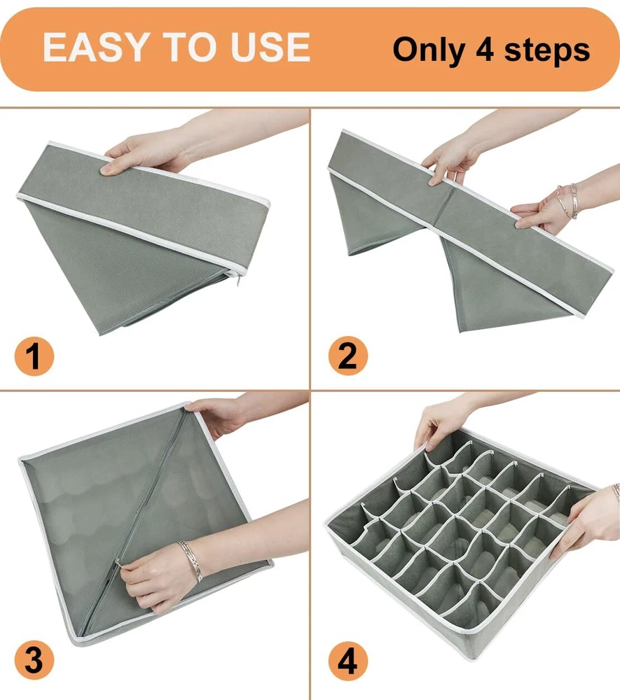 【MULTI USES CABINET ORGANIZER】Our drawer dividers are very suitable for wardrobe/ drawer/ table/ closet/ dresser and can underwear, bras, ties, socks, belts, scarves, t-shirts, towels, baby clothes, etc. Your closet and drawers won't be a mess anymore. 【DRAWER ORGANIZERS FOR CLOTHING】With our organizer bins, your drawer or wardrobe will be tidy and clean, greatly improving the utilization of your drawer space and helping you find what you want. This will greatly reduce the time spent searching for clothes. 【DRAWER ORGANIZER IN 4 SIZES】This 8-pack clothes organizer set includes 2 x 6-compartment T-shirt/underwear organizers, 2 x 7-compartment bra/scarf/belt/baby clothes organizers, 2 x 24-compartment sock organizers, 2 x 8-compartment tie/underpants organizer. 【FOLDABLE DRESSER ORGANIZER】The fabric drawer organizer is collapsible to save space when not in use, freeing up closet and dresser space for easy storage. When using them, just unfold them and zip them up the bottom. 【STURDY CLOSET ORGANIZERS】The dresser drawer organizers are made of breathable non-woven fabric, keeping the air flowing and clothes don't smell. This wardrobe dresser organizer with exquisite stitching is sturdy and can be reused for a long time. 【WHAT YOU WILL GET】8 pcs set: 2 x 6 compartment-11.03*5.52*3.94 inch/ 28*14*10 cm, 2 x 7 compartment-12.61*12.61*3.94 inch/ 32*32*10 cm, 2 x 24 compartment-12.61*12.61*3.94 inch/ 32*32*10 cm, 2 x 8 compartment-11.03*5.52*3.94 inch/ 28*14*10 cm, -year , and after-sales service.
