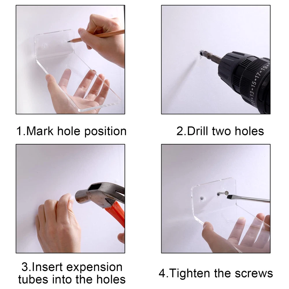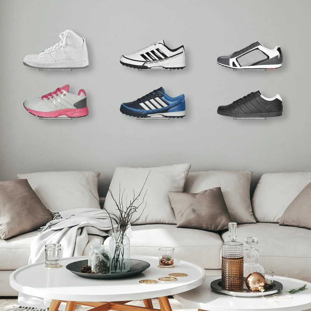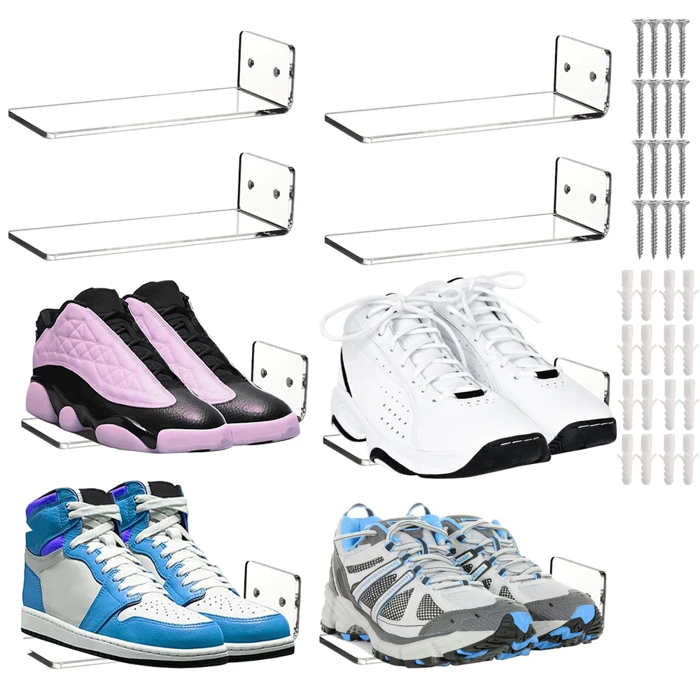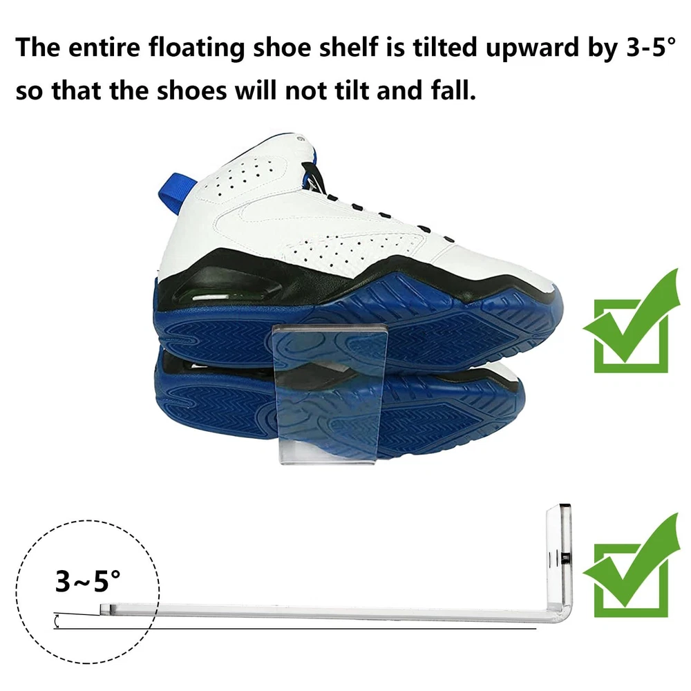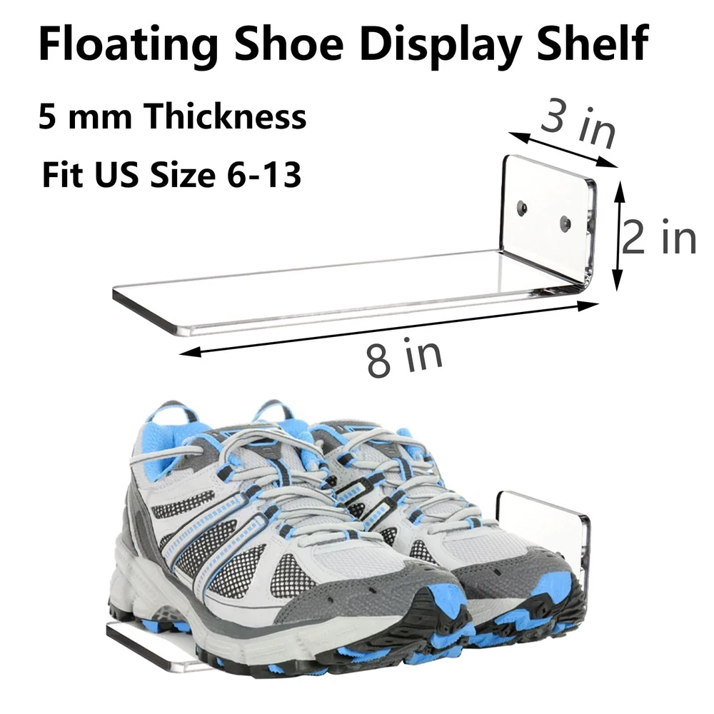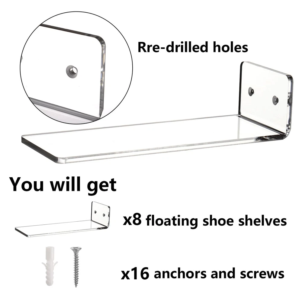 set of 8 acrylic floating shoe shelves comes with 12 screws and anchors, and 1 screwdriver. The clear sneaker shelves measure 8 x 3 x 2 in (L x W x H), each shelf holds one pair of shoes and fits US sizes 6-13. Display Your Shoes: The wall mounted shoe racks are designed with wide contact side for firmly support with wall and shoes. And the the display shelf has 3-5° lifted angle to prevent the shoe from tilting down. High Quality: Our shoe wall shelves are made of high quality acrylic, strong and durable, has a smooth surface and a rounded edge design. Easy to clean and you can expect to use for long time. Note: There is a protective film on the surface of the shelf, simply tear off before use. Decorate Your Room: With such concise and practical design, this shoe display shelves allow you to well showcase your sneakers to the largest extend and makes it an eye-appealing decoration to your room. These set of floating sneaker display shelf are great for living room, bedroom, playroom, dorm rooms, hallway and various scenes. Easy to Assemble: Every acrylic shoe shelf has two predrilled holes and all the hardwares are included. You can simply follow the instruction steps without much effort. It also makes a great gift for family, friends, etc.