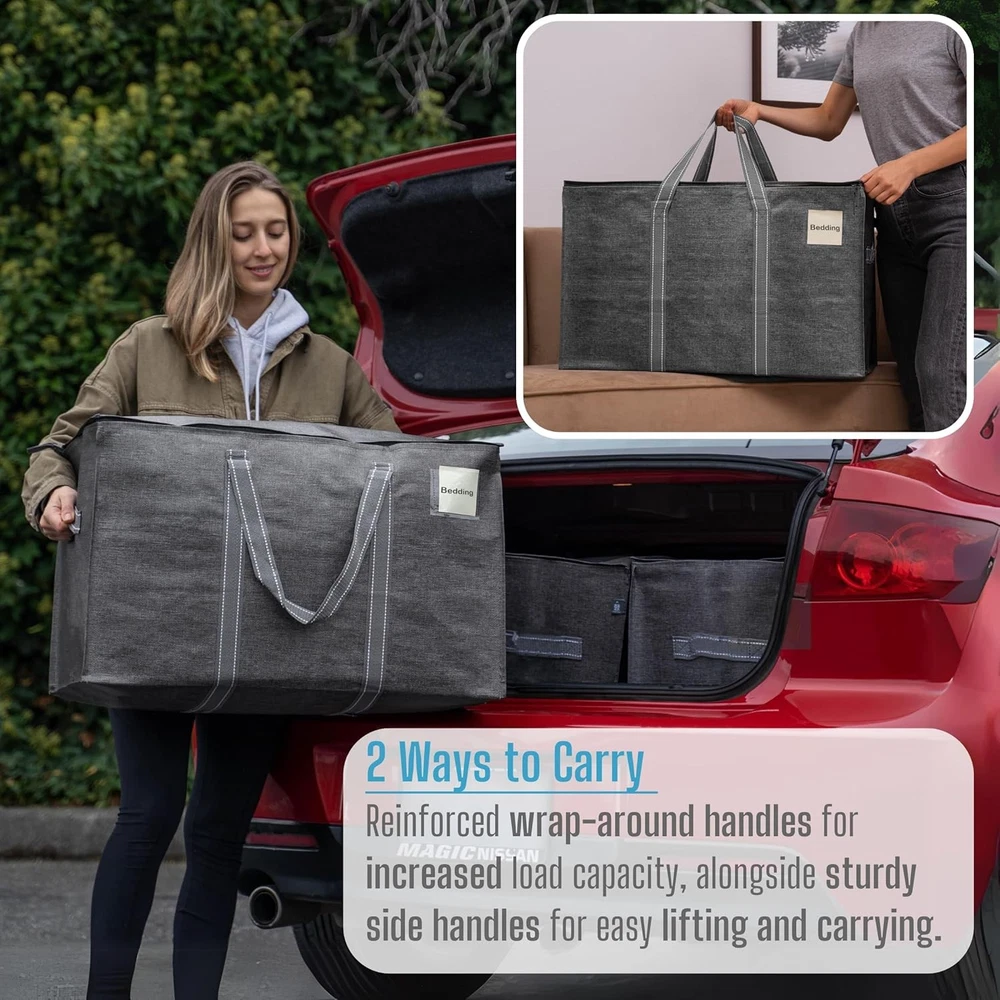 Move Without Boxes – No need to buy and assemble packing boxes or look for moving supplies. Move easier with VENO sturdy and spacious moving bags that make a lightweight, convenient, and economical alternative to moving boxes. Just unfold, unzip, and begin loading as the dual tab zipper lid opens wide for easy packing and unloading. Take advantage of the versatility and use as a storage box, Christmas storage containers, laundry basket, and camping essentials bag. 27.6" W X 16.5" H X 13.8" D. Stands Upright for Easy Loading – You don’t have to worry about your bag falling over while trying to load or unload. VENO large storage bags stay upright for easy loading with our sturdy and durable PP Woven material that lasts a lifetime and makes moving and storing a breeze. Find stability and security with VENO moving bags, storage bags for clothes, and storage boxes with lids. Clear Tag Pocket for Labels – Forget about wasting time and effort trying to find your belongings. Create a custom label and slip it into the attached clear tag pocket to label your bag for smart organization so you can easily find and distinguish your blankets, bedding, comforters, towels, pillows, linens, and stuffed animals. Don’t forget to utilize this feature when storing your Christmas wreath or when moving your college dorm room essentials and clothes storage into your new home! Reinforced Wrap Around Handles – No need to worry about if your handles are going to tear as you carry heavy loads. Carry our organizer storage totes by the long and strong poly webbing handles which wrap around and under the bag for maximum durability or by the additional heavy-duty side handles. Hold up to 50 pounds and store up to 27 gallons with uncompromised quality designed to hold plenty. Water-Resistant, Foldable & Easy to Clean – You don’t have to be concerned about getting your bag dirty or stained with our water-resistant PP-woven material which is extremely durable and easy to maintain. Simply use a sanitizing wipe or damp cloth to clean both the interior and exterior and follow by air-drying. Fold flat into a small size to save space and store compactly in your room, drawer, cabinet, closet, garage, luggage, or car trunk.