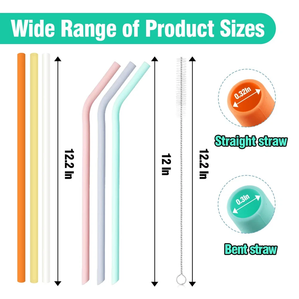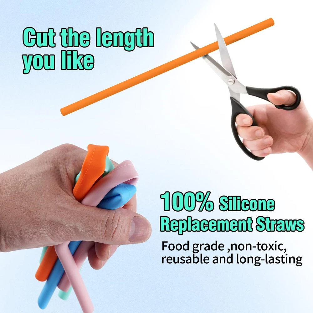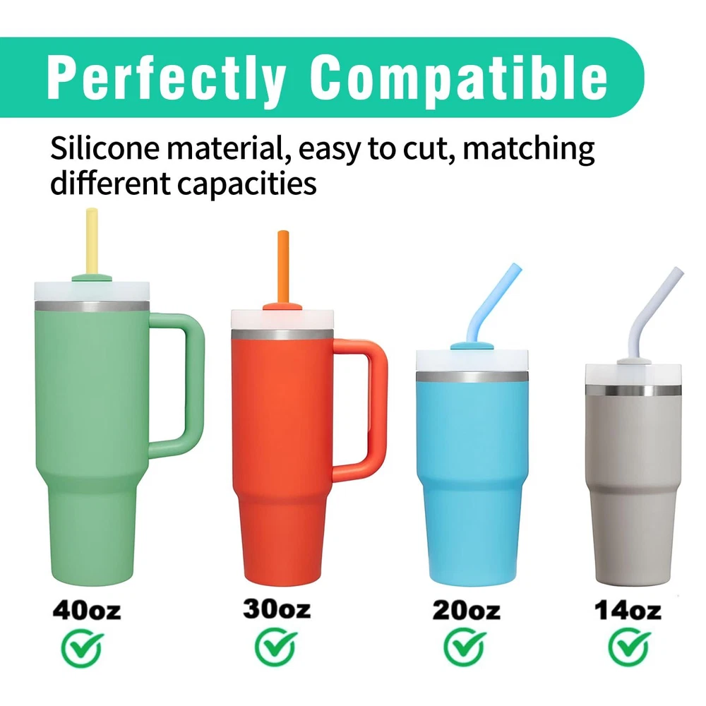 【Perfectly Compatible】:The stanley straws size is 12.2" length x 0.39" wide , 8 counts long colorful straws plus 2 cleaning brush. Compatible with stanley 40 oz 30 oz straw. Perfect for stanley accessories. 【Advantages of Silicone Material】:Food grade silicone is BPA free,non-toxic, odorless,eco-friendly,Non-teeth chipping,reusable and long-lasting.Safe use for driving. More friendly for people who like to chew straws .Easy to cut to the length you want. 【Easy to Clean】:The stanley cup straw come with 2 counts 12.2 inches extra long cleaning brush, you can wash the replacement straws for stanley 40 oz tumbler by hand with water,very easy to wash and keep clean.Dishwasher Safe. 【Package Includes】:8 counts silicone stanley replacement straw(4 straight and 4 curved straws) Suitable for various occasions.and 2 counts cleaning brush to keep them clean. 【Suitable For Gifting】:Perfect gift for your family and friends who likes to use the Simple Modern or Stanley Cup, they will like it very much.